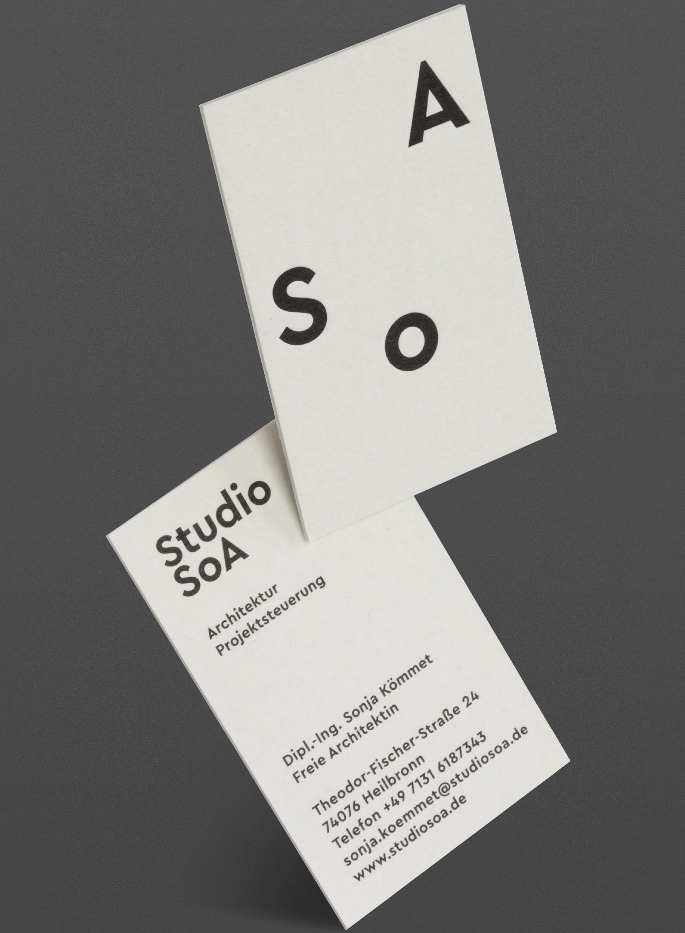 Minimal-Konzept für eine Architektin: Visitenkarte plus das digitale Pendant im Netz. Das Logo in Form dreier frei flottierender Buchstaben versinnbildlicht gestalterische Freiheit — auf der Website laden die Buchstaben den User zum spielerischen Herumstubsen ein. Demgegenüber steht die pure Materialität der Visitenkarten aus Holzschliffpappe.