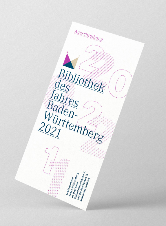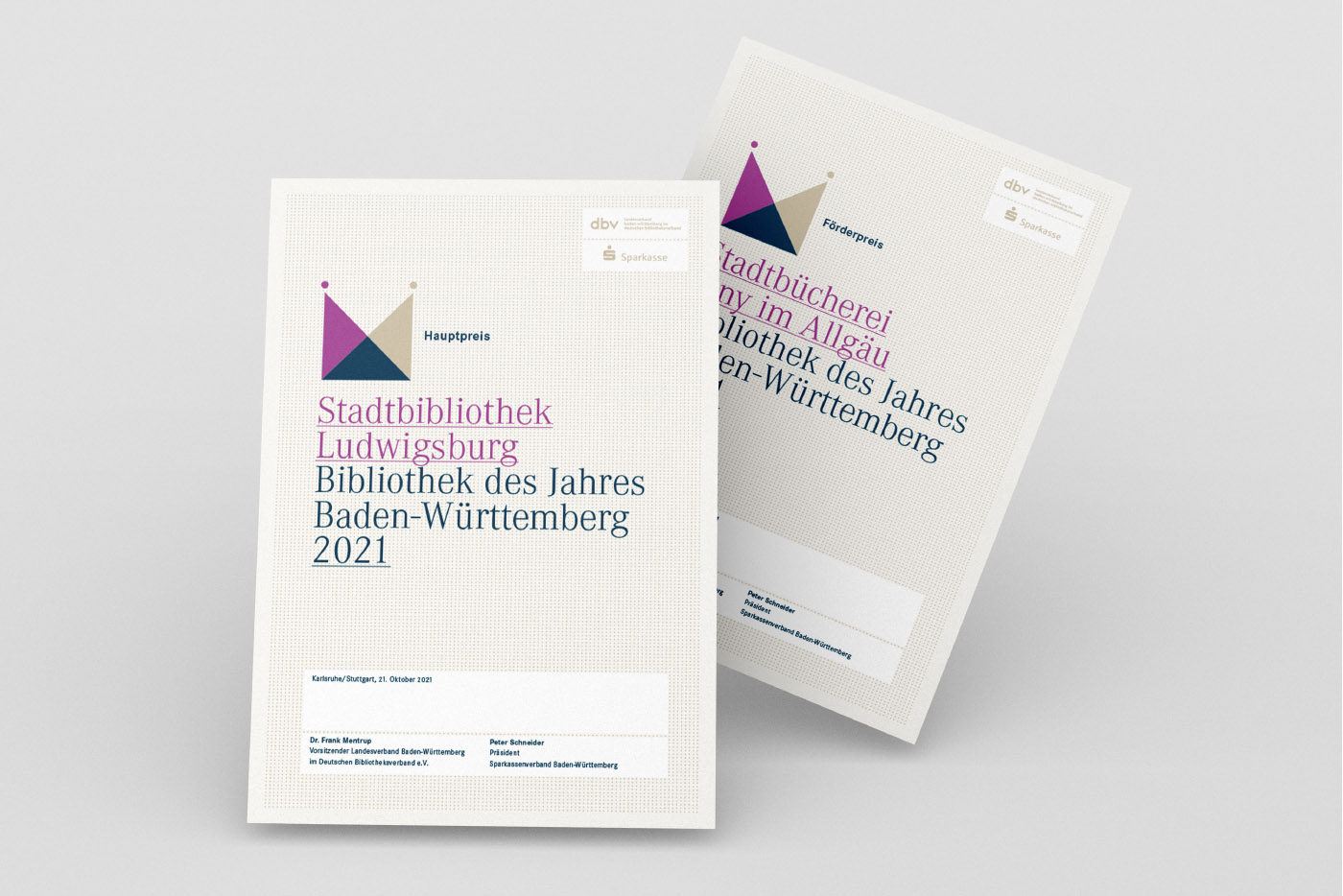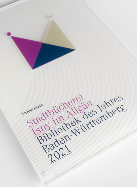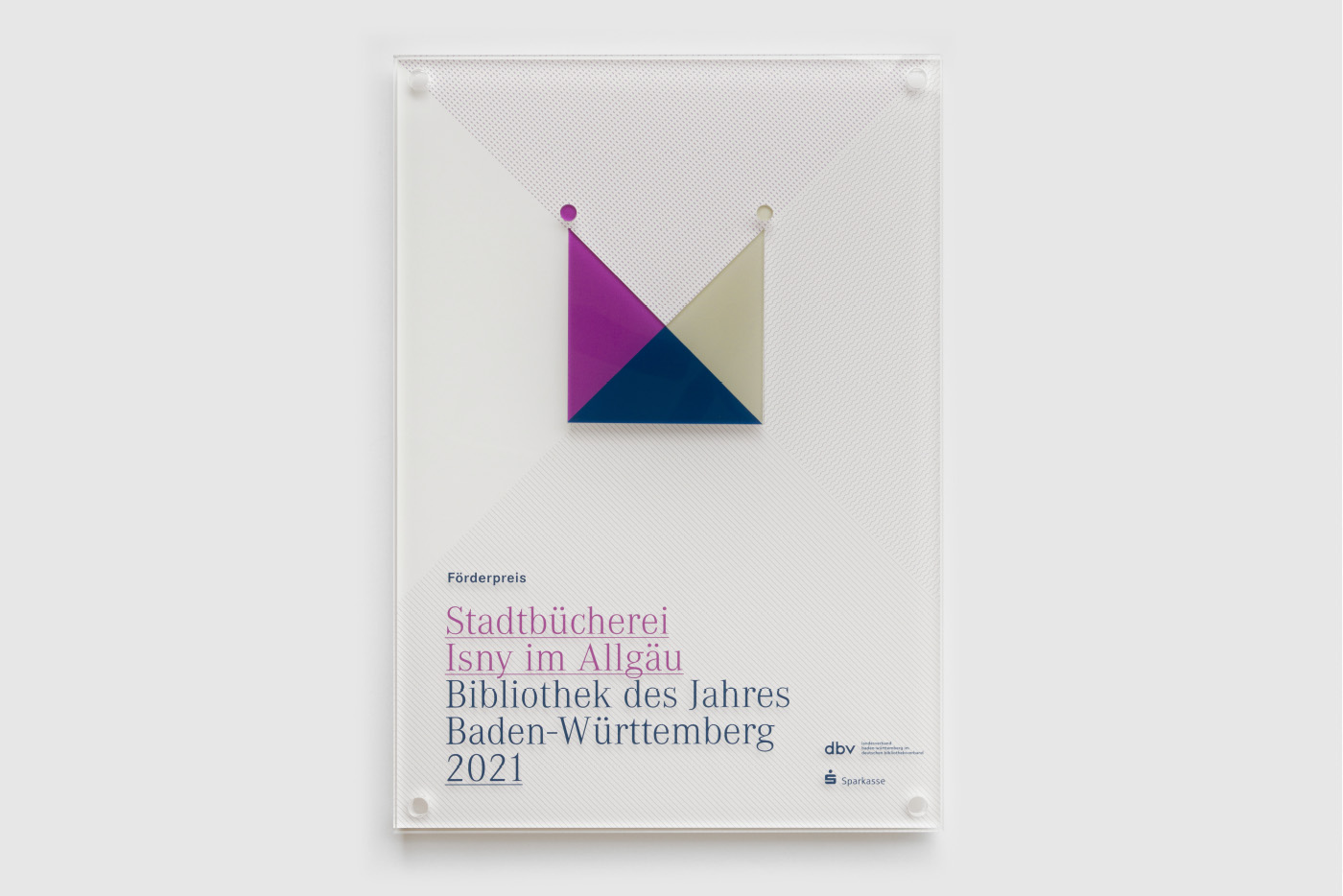 Klare Linie: Dreifarbiger, aus Acrylglas gefertigter Award für die „Bibliothek des Jahres Baden-Württemberg 2021“ des dbv-Landesverbandes. Neben der Idee zum Logo sowie der Entwicklung der Awards wurden Urkunden sowie Rollups benötigt; im Vorfeld des Wettbewerbs kamen darüberhinaus Ausschreibungsflyer und eine Einladung mit Antwortkarte im Format DIN lang sowie ein Bewerbungsformular zum Einsatz. Außerdem verantwortete gruppe sepia die Gestaltung und Umsetzung der zugehörigen Website.