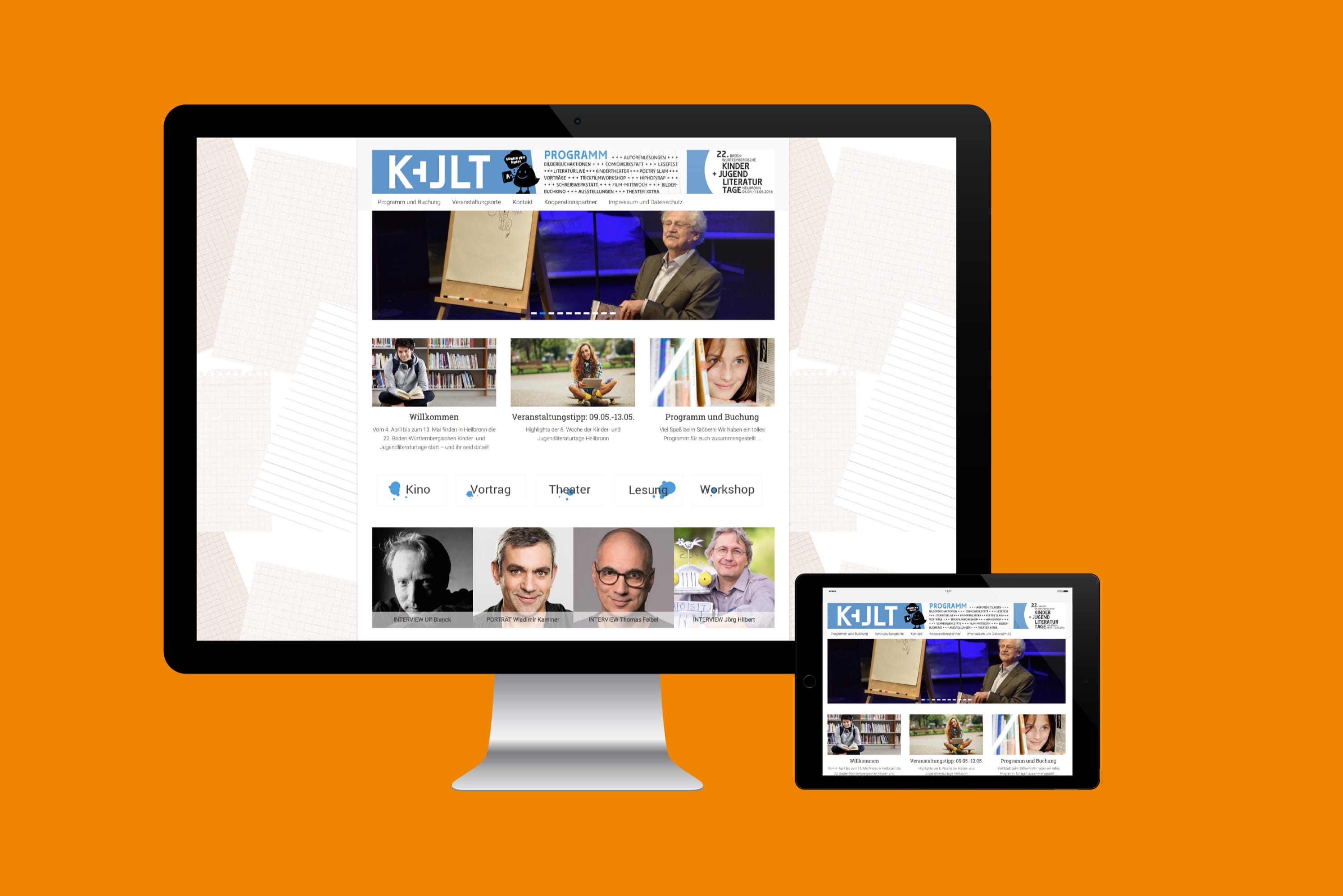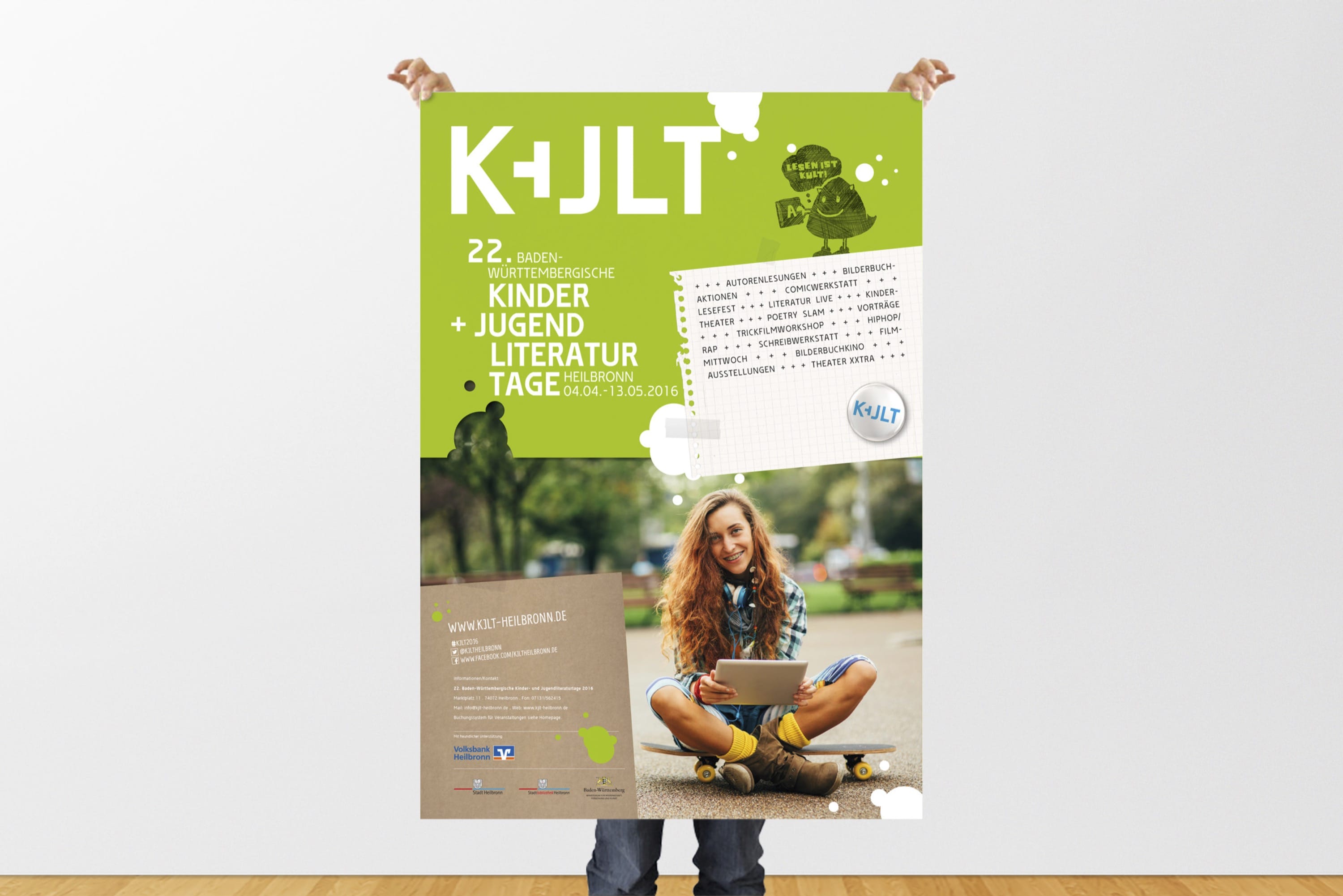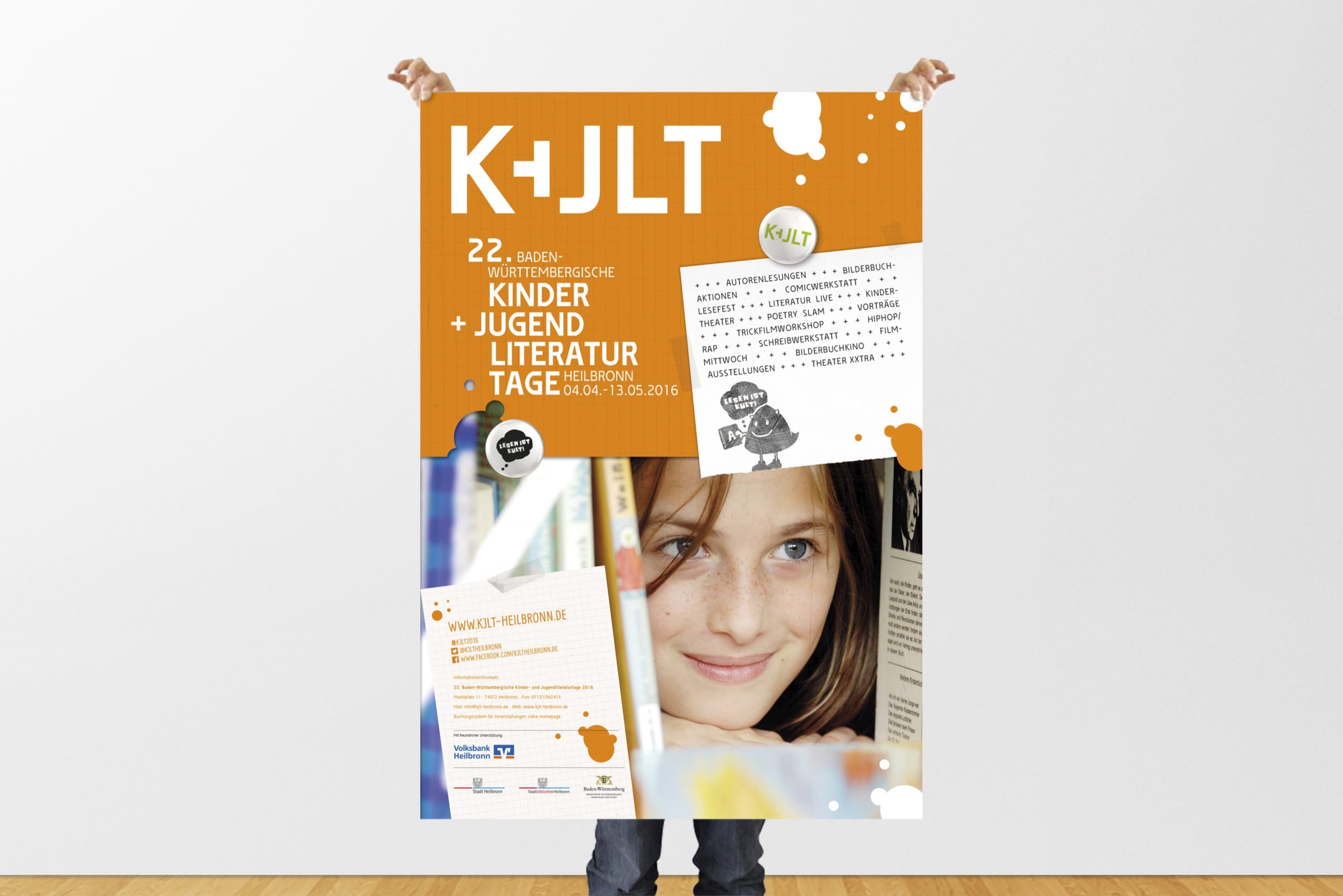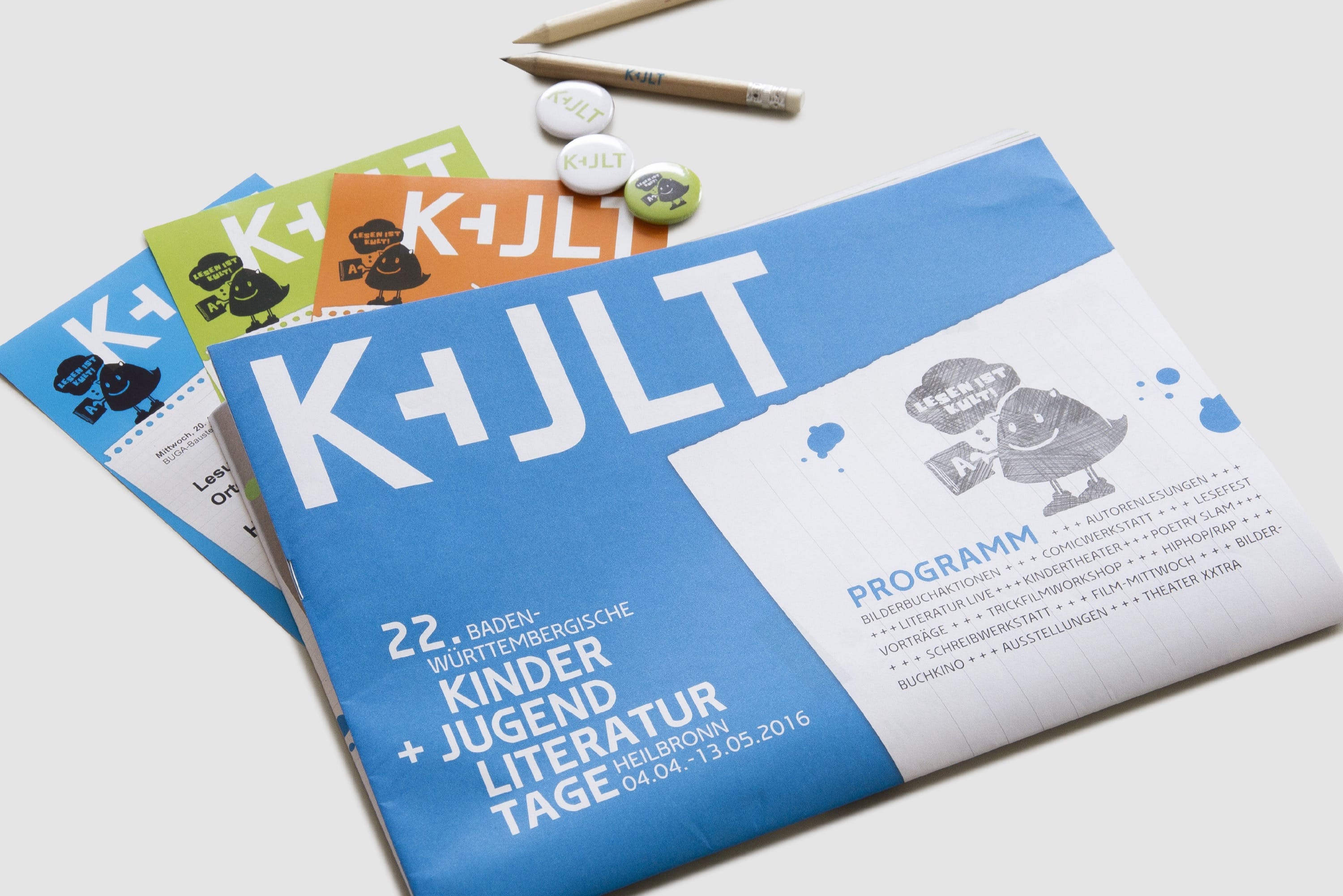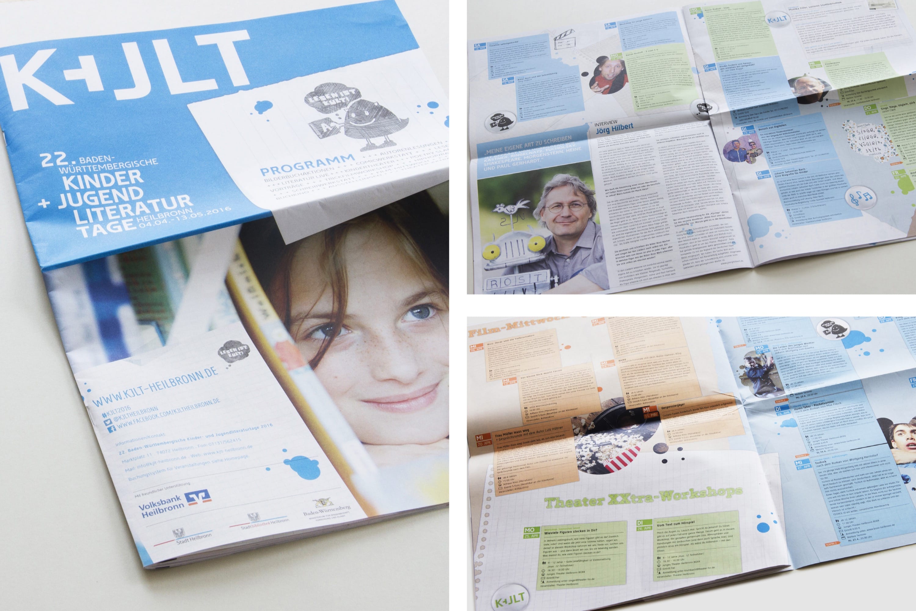 Corporate Design, Logo, Printmedium, WebkonzeptDie 22. Baden-Württembergischen Kinder- und Jugendliteraturtage fanden 2016 in Heilbronn statt. Nach einem Ideenwettbewerb mit Entwicklung Logo und Sympathiefigur im Jahr zuvor durfte gruppe sepia an die Entwicklung des Erscheinungsbildes gehen. Programmheft, Plakate, Homepage und die Erstellung einer ganzen Reihe von Werbemitteln standen auf der To-Do-Liste. Die Entwicklung erfolgte im engen Schulterschluss mit dem Schul-, Kultur- und Sportamt der Stadt Heilbronn. http://kjlt-heilbronn.de
