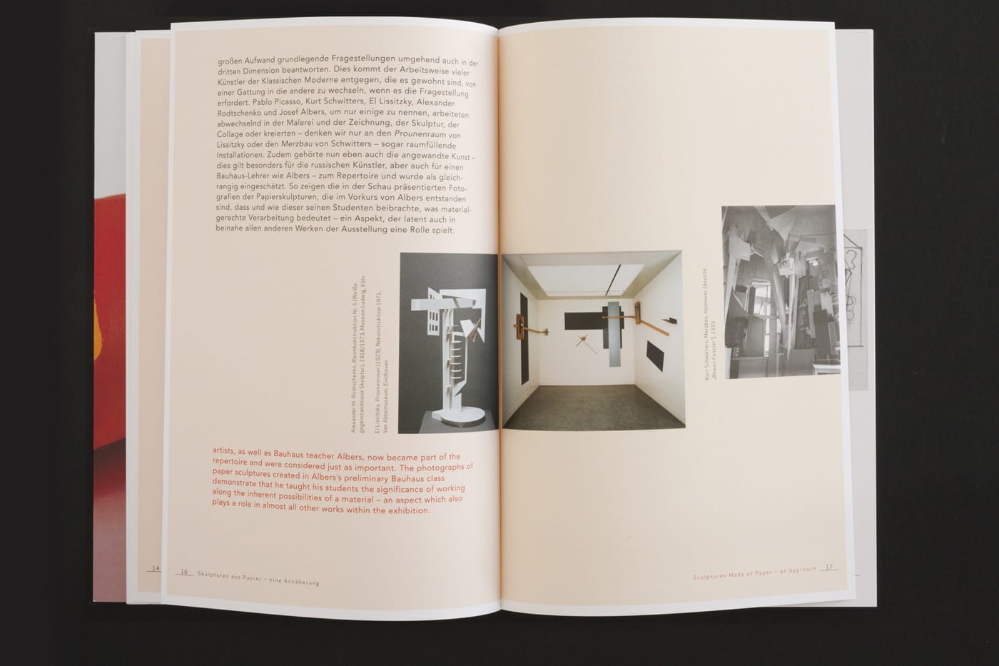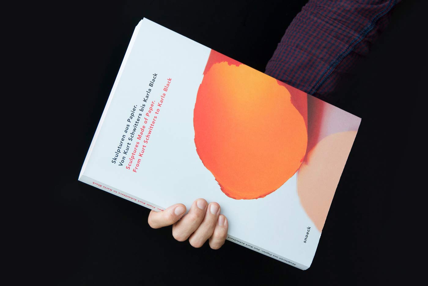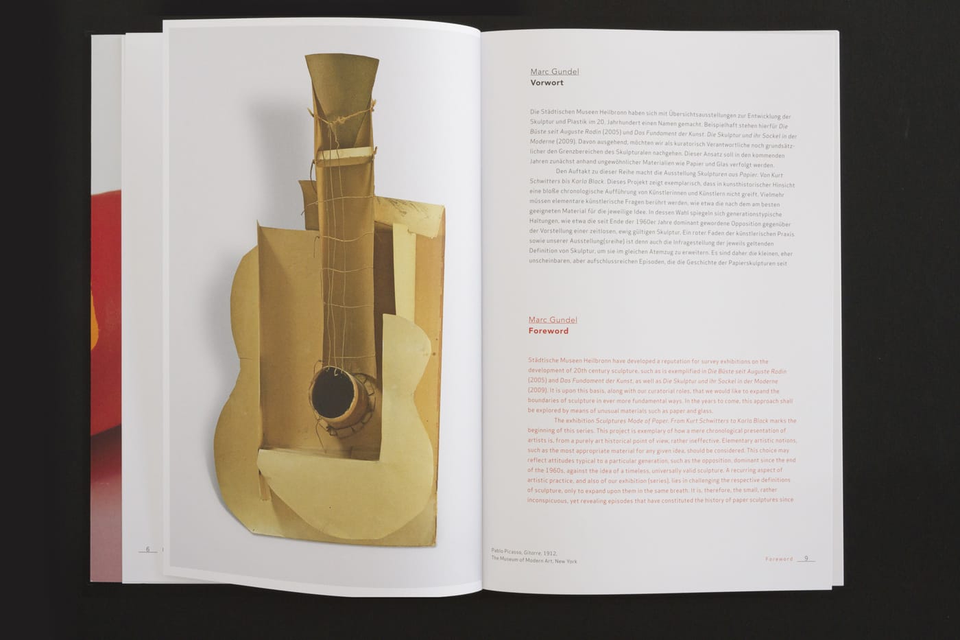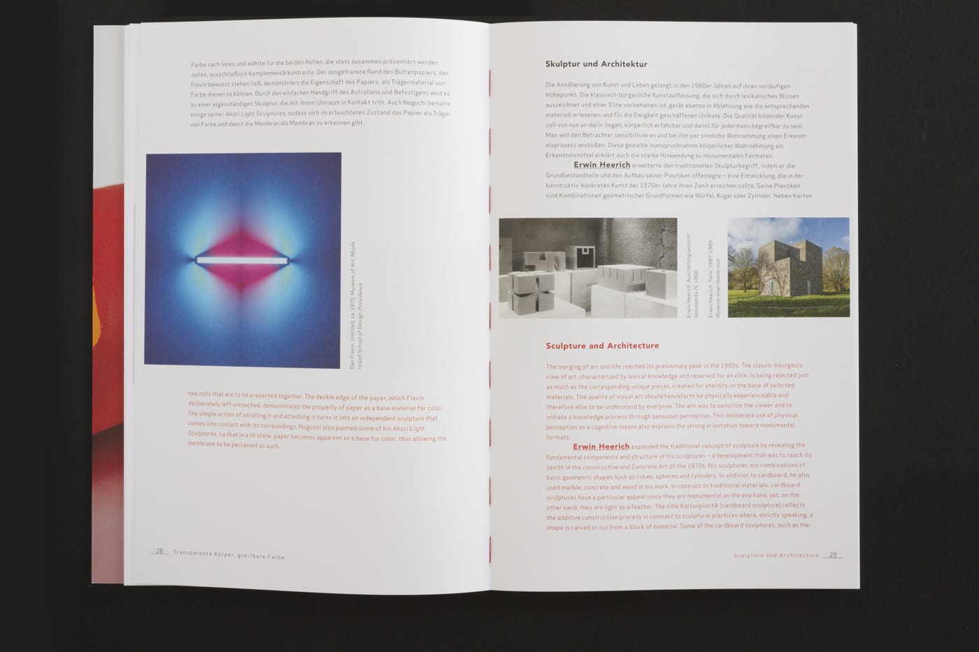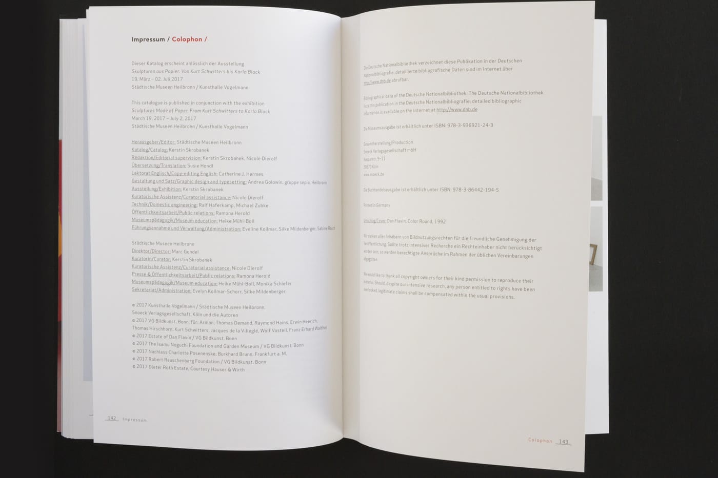 Katalog zur Ausstellung „Skulpturen aus Papier. Von Kurt Schwitters bis Karla Black“ der Städtischen Museen Heilbronn. Ausgeführt in der Technik der Schweizer Broschur. Es handelt sich hier um eine besonders hochwertige Art der Buchbindung, bei der der fadengeheftete Buchblock lediglich auf der Rückseite in den Einband geklebt wird. Zum Einsatz kommt ein ungestrichenes Volumenpapier. Dem Katalog sind als Ergänzung zwei weitere Druckprodukte beigefügt — eine 16-seitigen Broschüre, rückstichgeheftet und ein Faltplakat.