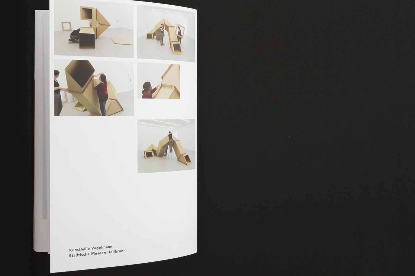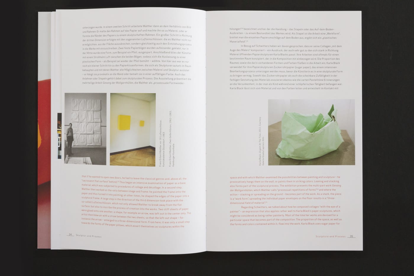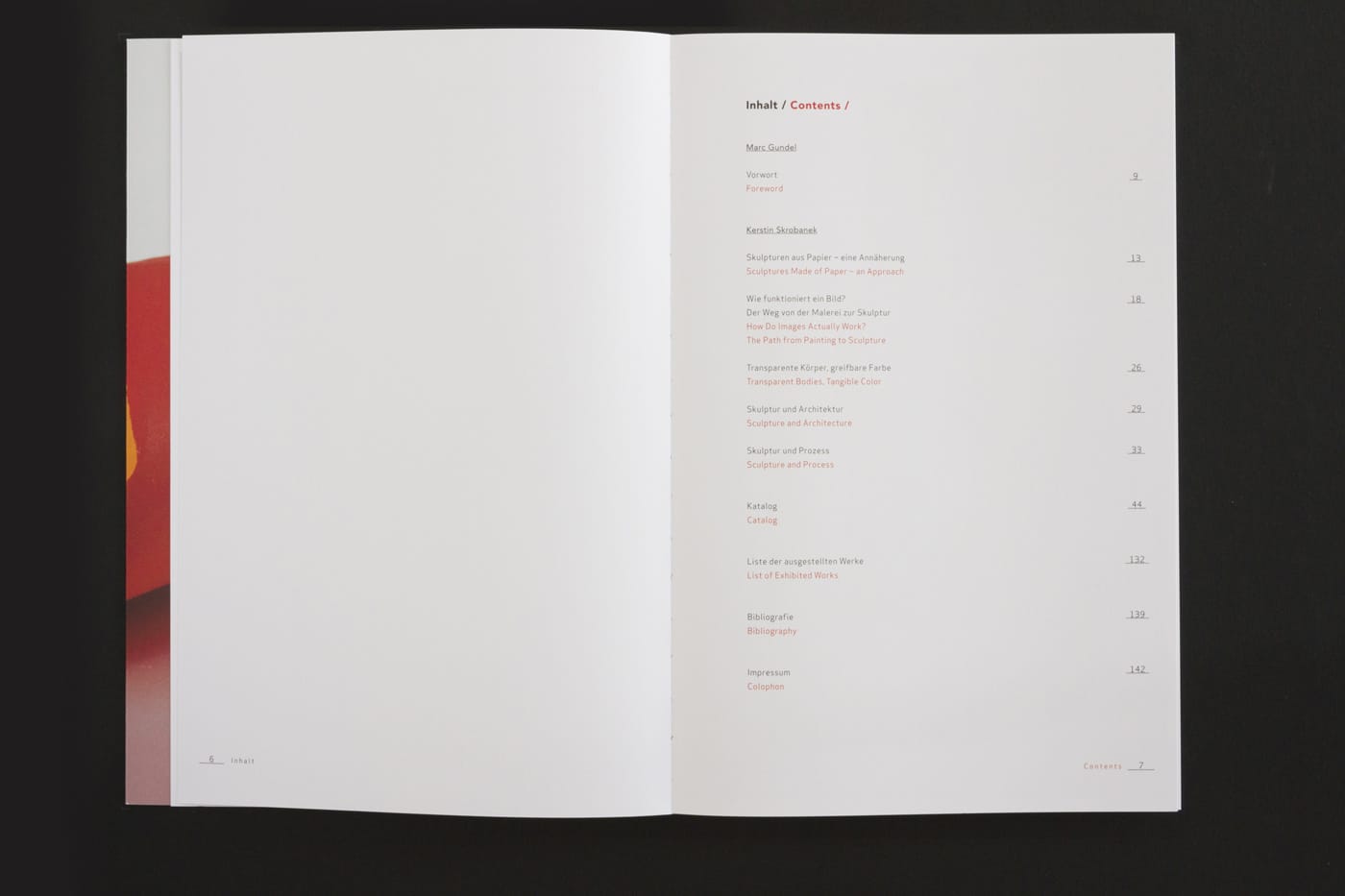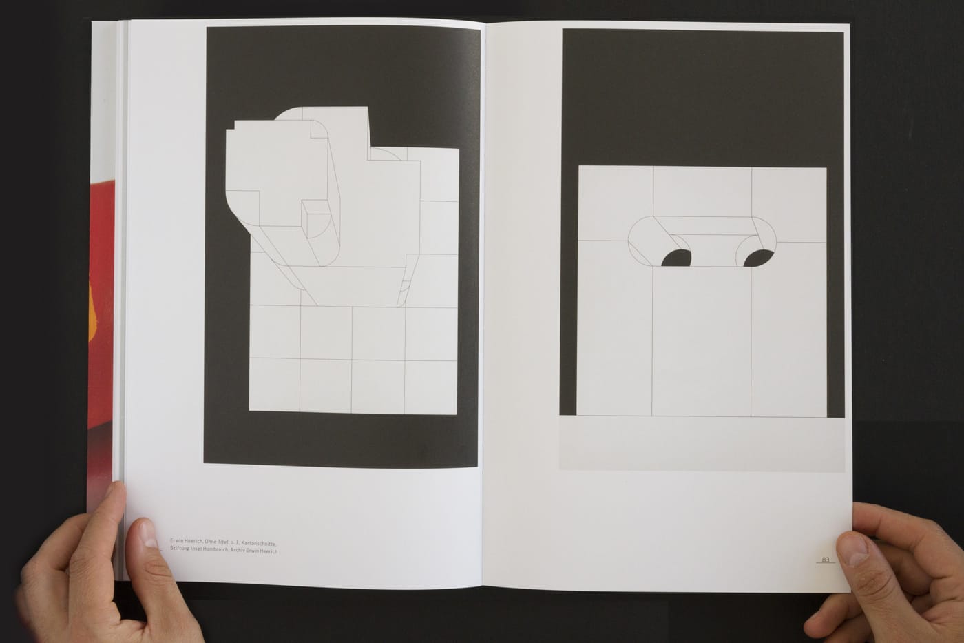 Katalog zur Ausstellung „Skulpturen aus Papier. Von Kurt Schwitters bis Karla Black“ der Städtischen Museen Heilbronn. Ausgeführt in der Technik der Schweizer Broschur. Es handelt sich hier um eine besonders hochwertige Art der Buchbindung, bei der der fadengeheftete Buchblock lediglich auf der Rückseite in den Einband geklebt wird. Zum Einsatz kommt ein ungestrichenes Volumenpapier. Dem Katalog sind als Ergänzung zwei weitere Druckprodukte beigefügt — eine 16-seitigen Broschüre, rückstichgeheftet und ein Faltplakat.