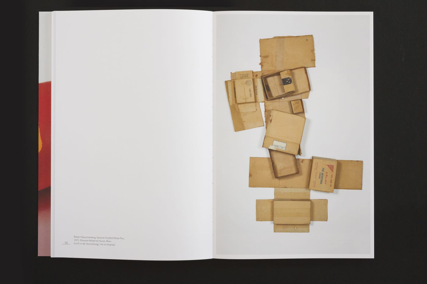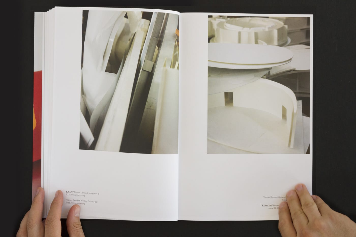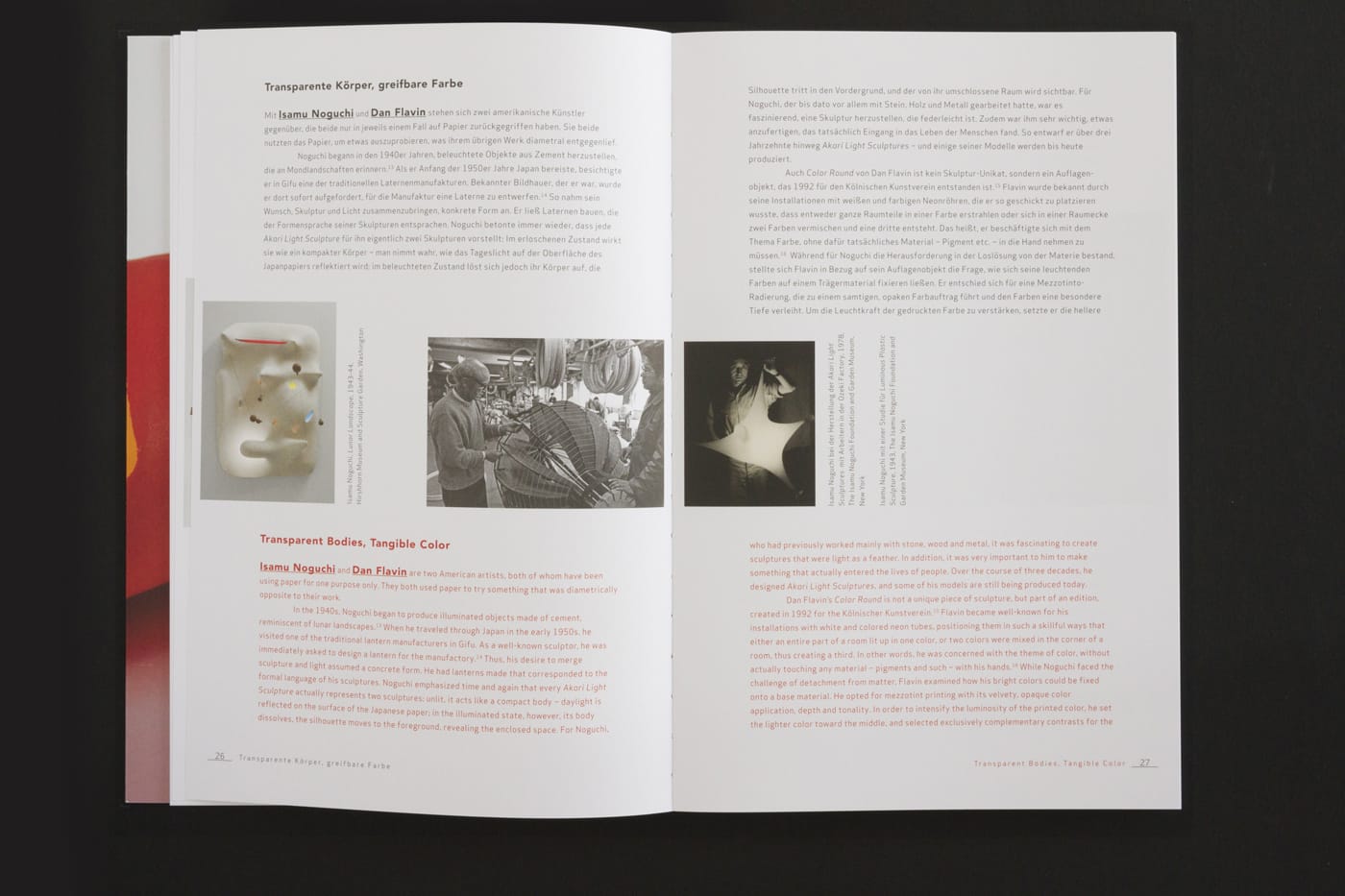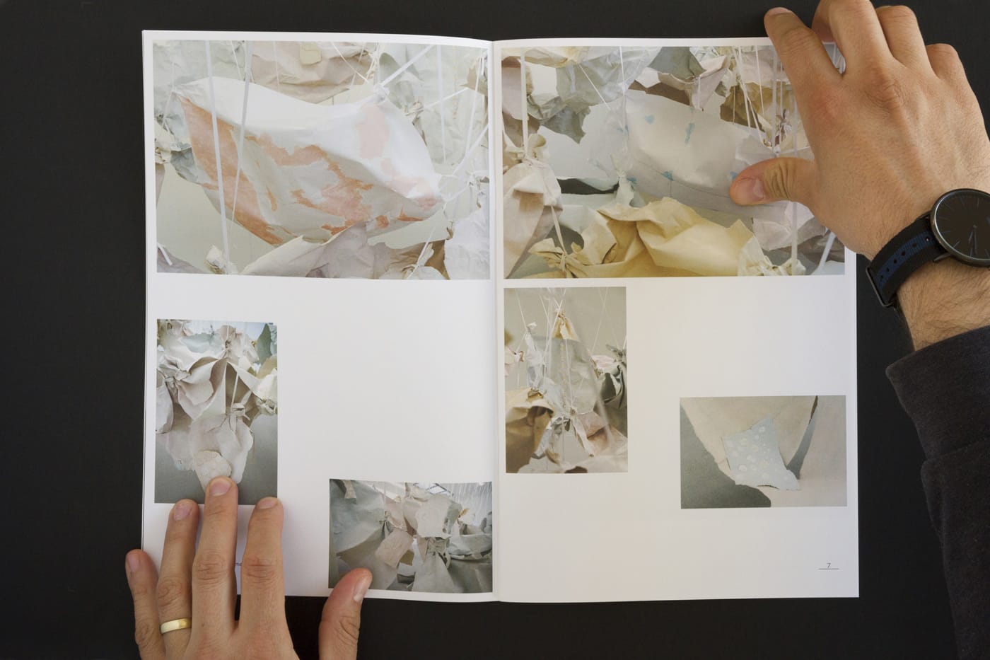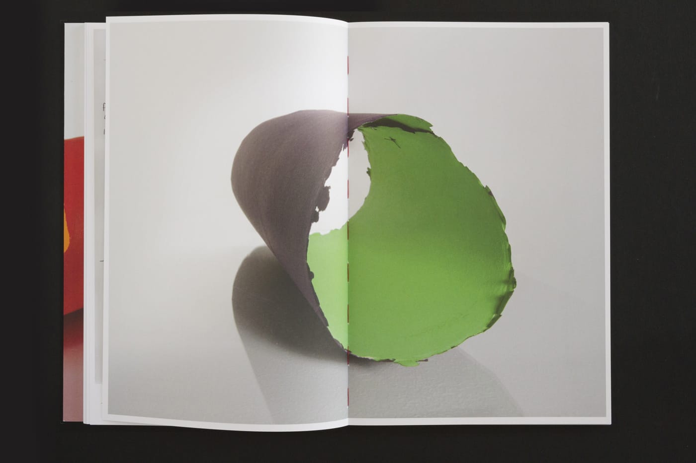 Katalog zur Ausstellung „Skulpturen aus Papier. Von Kurt Schwitters bis Karla Black“ der Städtischen Museen Heilbronn. Ausgeführt in der Technik der Schweizer Broschur. Es handelt sich hier um eine besonders hochwertige Art der Buchbindung, bei der der fadengeheftete Buchblock lediglich auf der Rückseite in den Einband geklebt wird. Zum Einsatz kommt ein ungestrichenes Volumenpapier. Dem Katalog sind als Ergänzung zwei weitere Druckprodukte beigefügt — eine 16-seitigen Broschüre, rückstichgeheftet und ein Faltplakat.