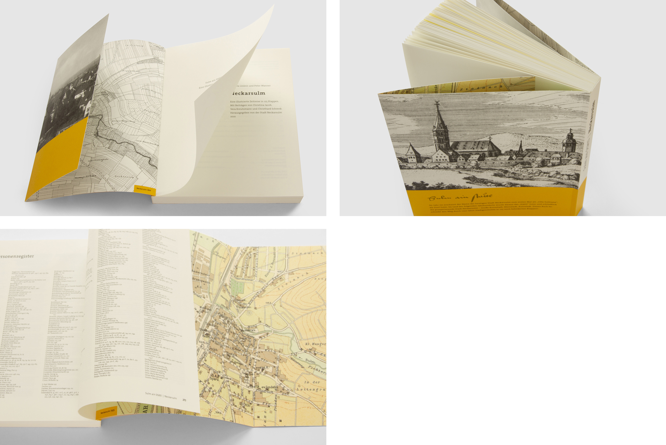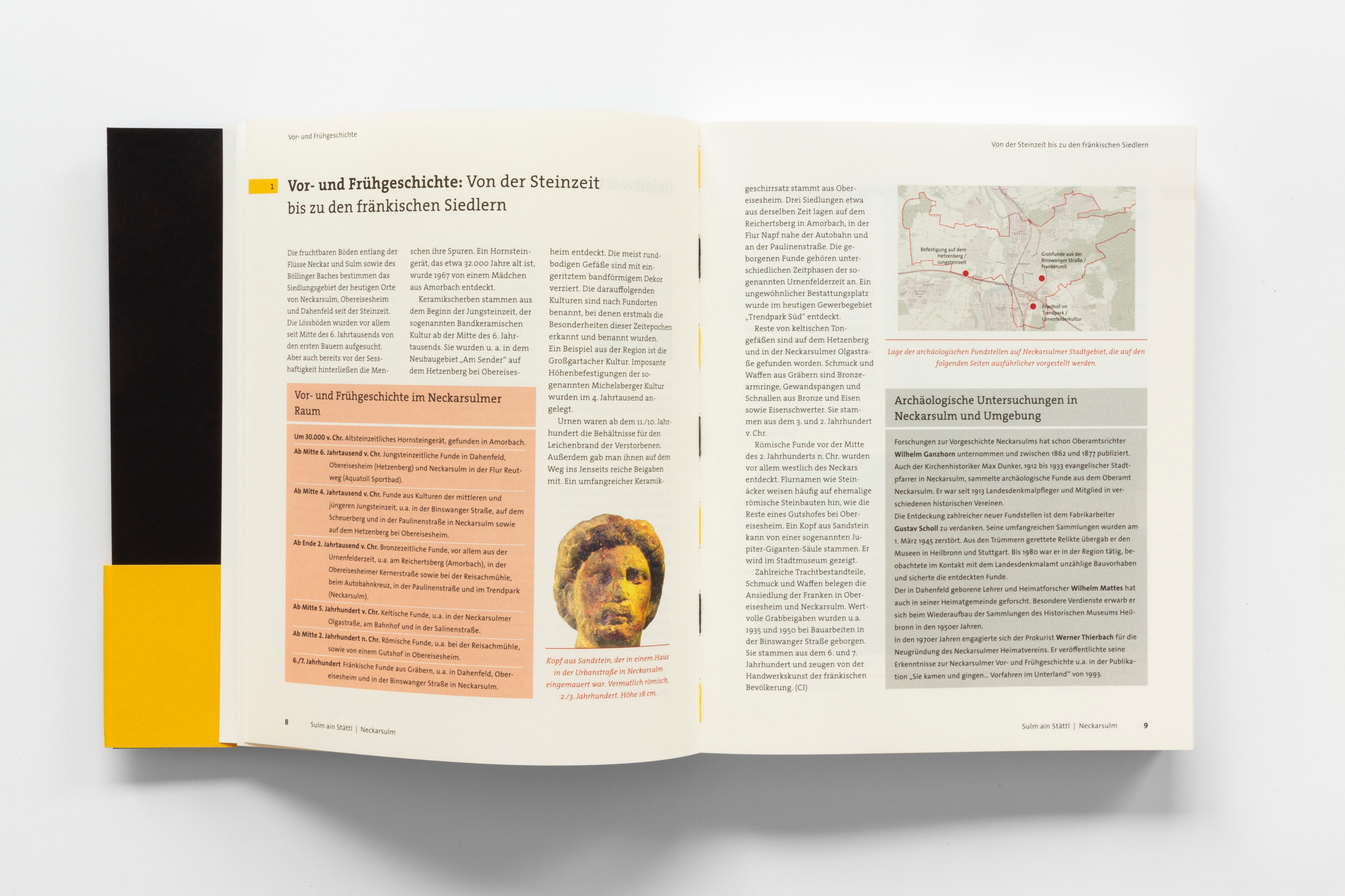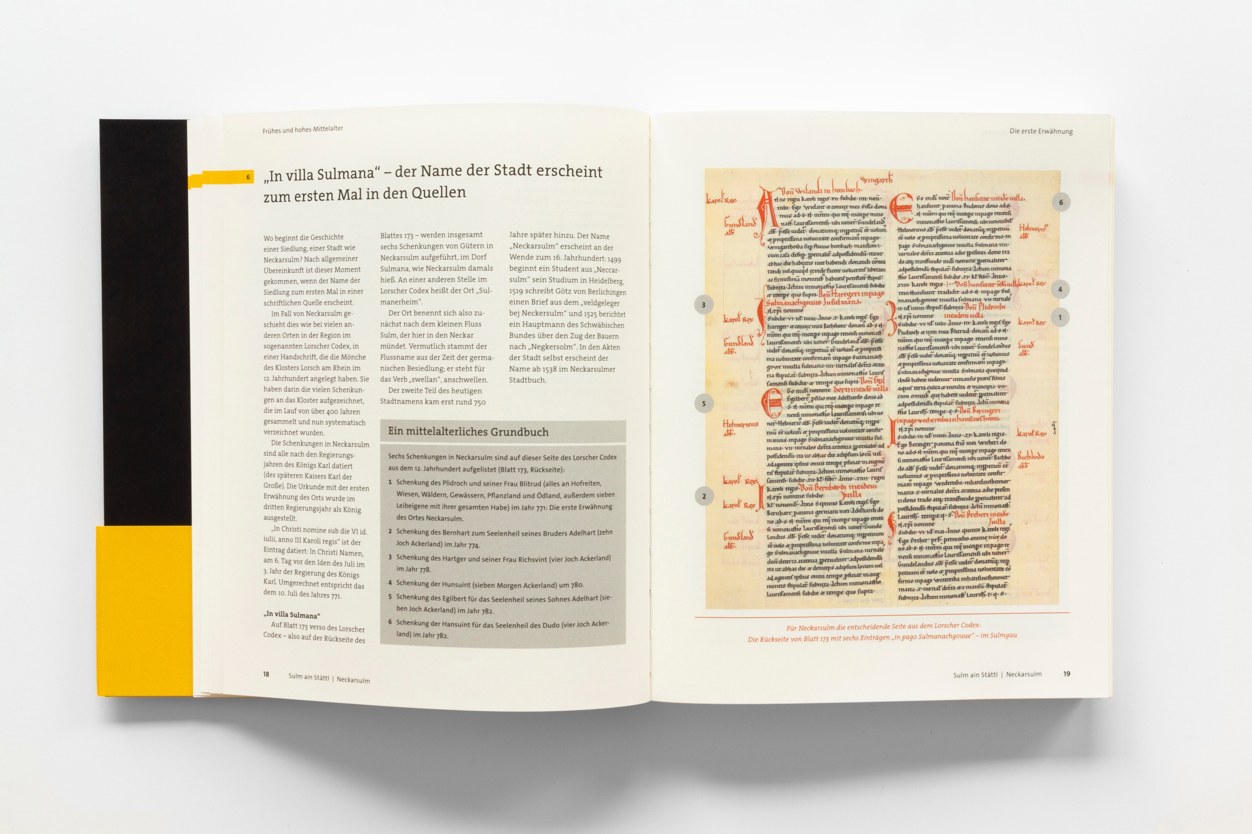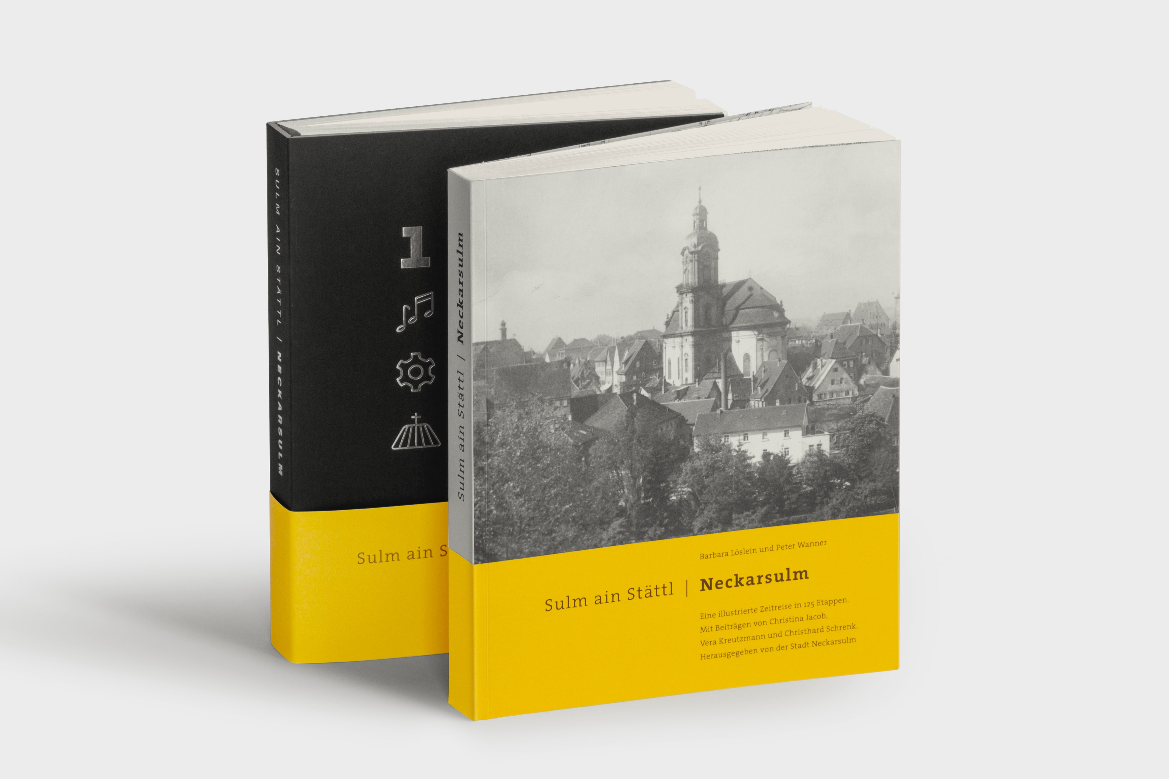 Stadtgeschichtsbuch, herausgegeben von der Stadt Neckarsulm anlässlich des 1250-jährigen Jubiläums. In 125 Kapiteln — je eines pro Doppelseite — wird ein Gesamtblick auf die Geschichte der Stadt entwickelt. Das 280 Seiten starke Werk erscheint in zwei Ausführungen: In einer Hardcover-Version, realisiert als Schweizer Broschur und ausgestattet mit dem Logo des Jubiläumsjahres in Heißfolienprägung sowie mit einer laufenden Nummerierung. Plus in einer Softcoverausführung als Breitklappen-Broschur zum Verkauf über das Jubiläumsjahr hinaus. Format und Inhalt sind identisch; mit der auf gelber Farbe gegründeten Typo — beim Hardcover als Banderole ausgeführt — erhält das Duett eine gestalterische Klammer.