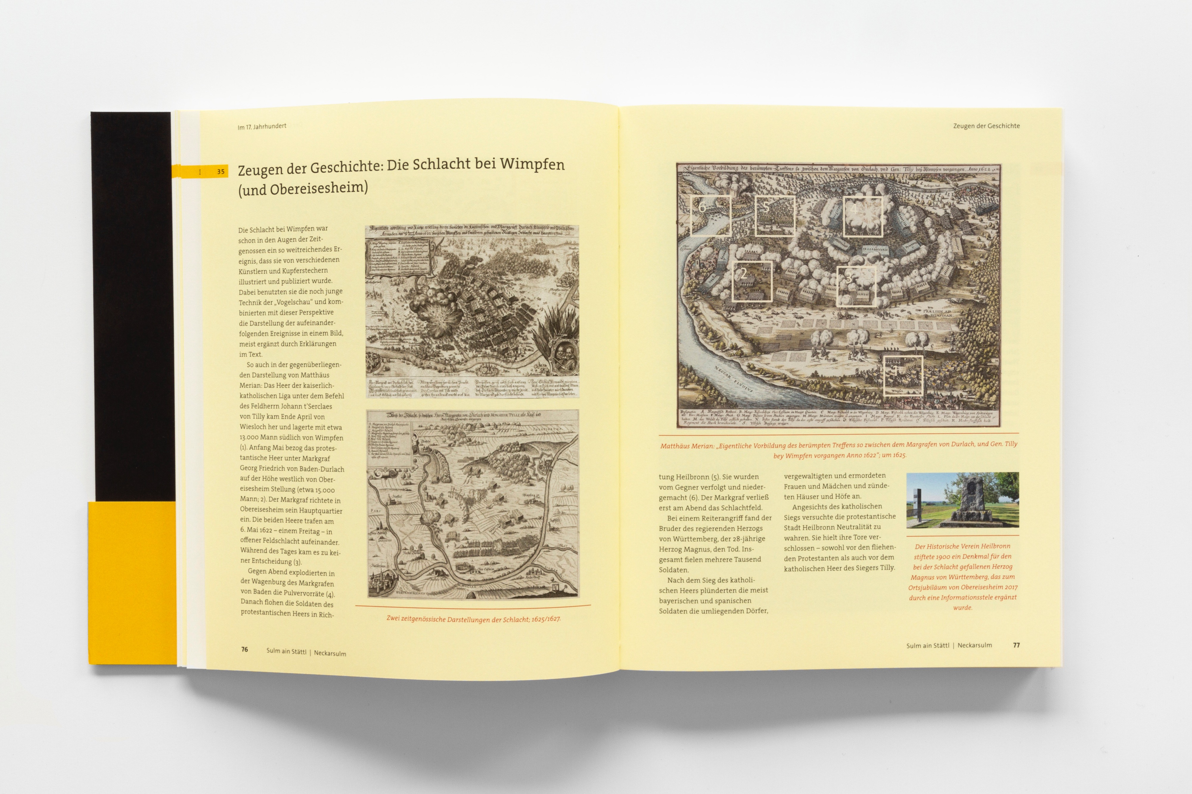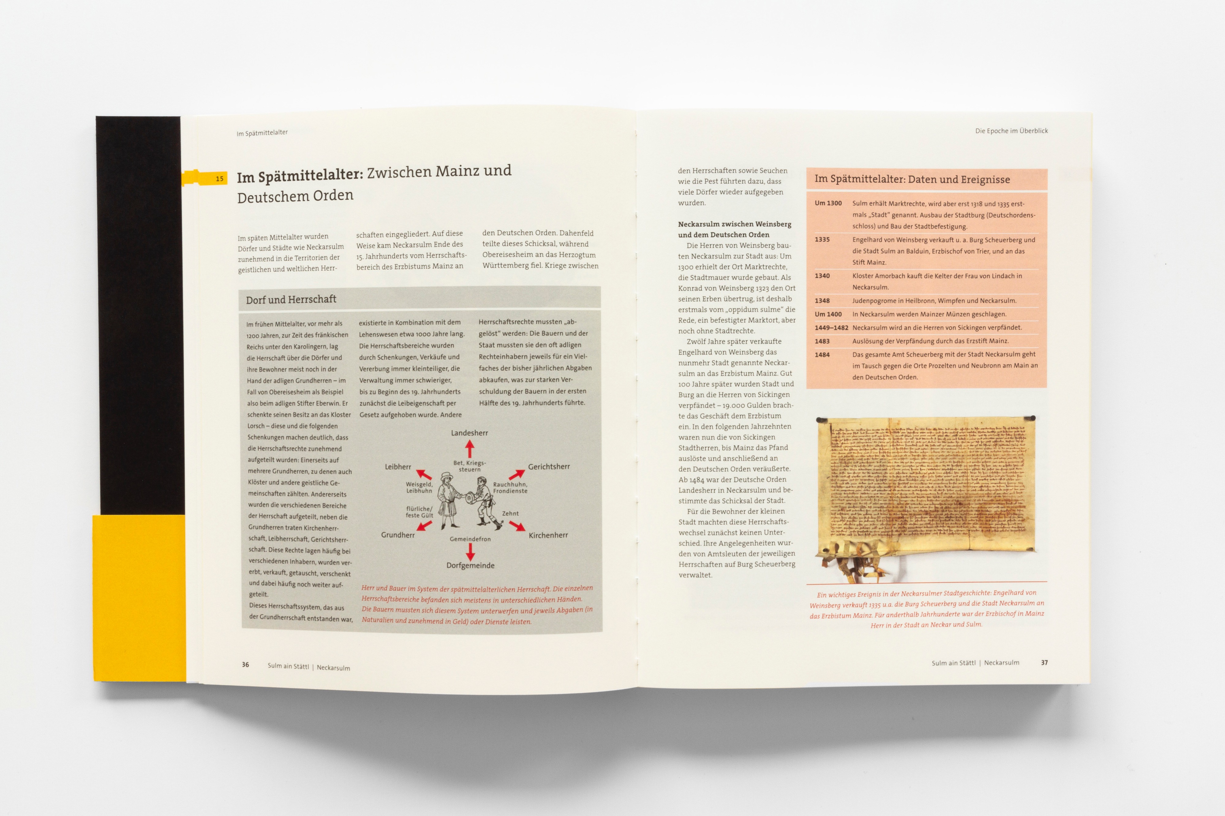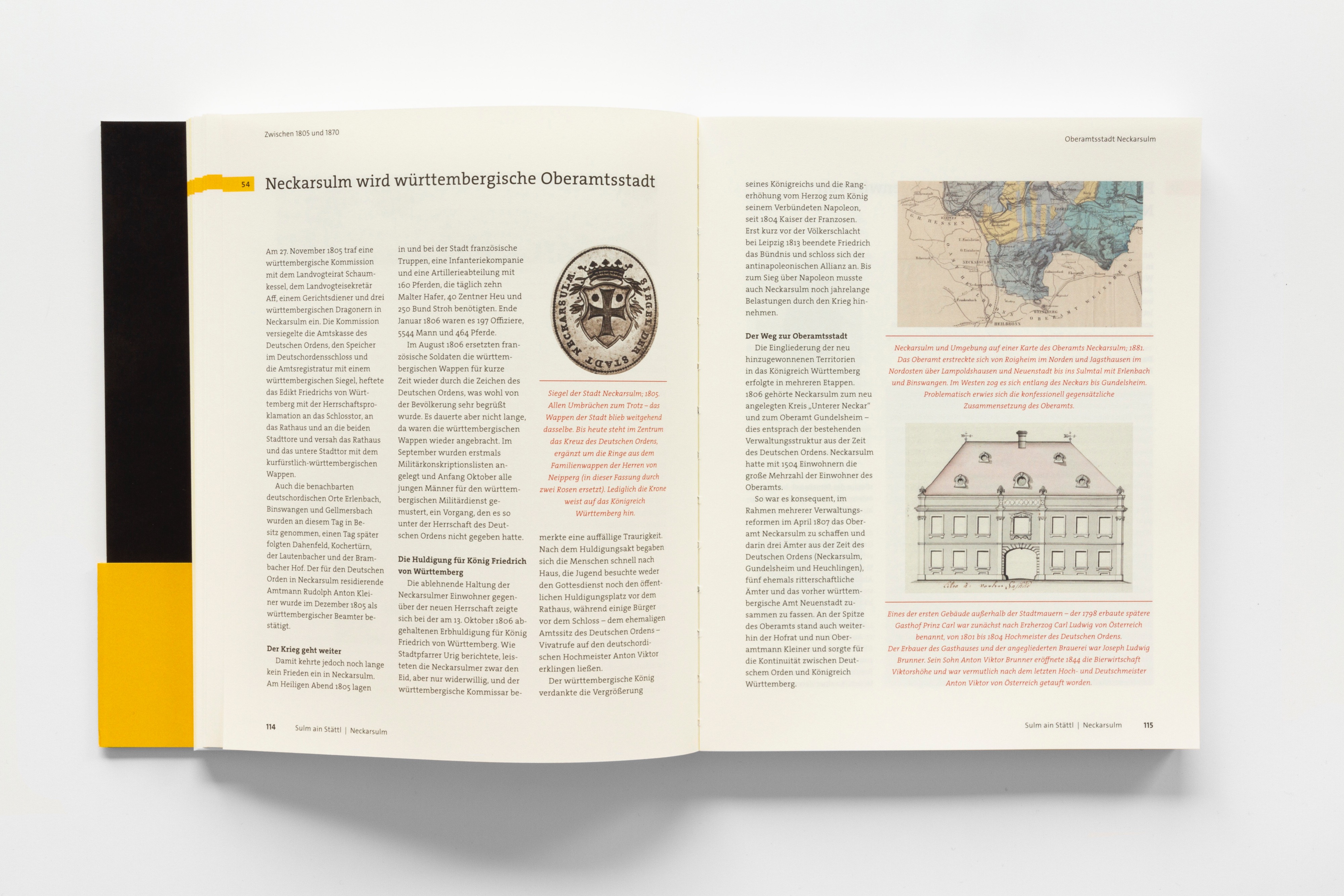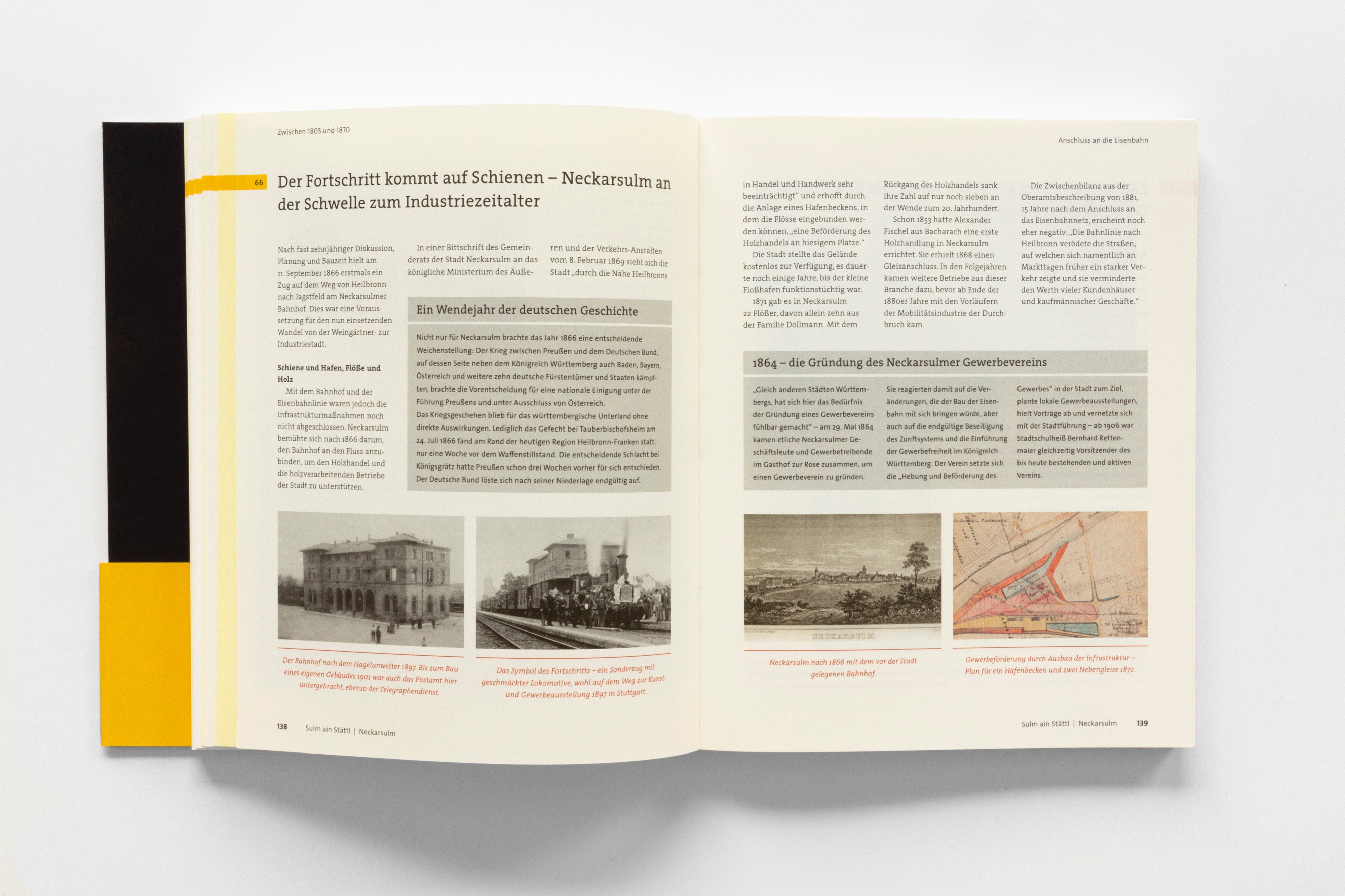 Stadtgeschichtsbuch, herausgegeben von der Stadt Neckarsulm anlässlich des 1250-jährigen Jubiläums. In 125 Kapiteln — je eines pro Doppelseite — wird ein Gesamtblick auf die Geschichte der Stadt entwickelt. Das 280 Seiten starke Werk erscheint in zwei Ausführungen: In einer Hardcover-Version, realisiert als Schweizer Broschur und ausgestattet mit dem Logo des Jubiläumsjahres in Heißfolienprägung sowie mit einer laufenden Nummerierung. Plus in einer Softcoverausführung als Breitklappen-Broschur zum Verkauf über das Jubiläumsjahr hinaus. Format und Inhalt sind identisch; mit der auf gelber Farbe gegründeten Typo — beim Hardcover als Banderole ausgeführt — erhält das Duett eine gestalterische Klammer.