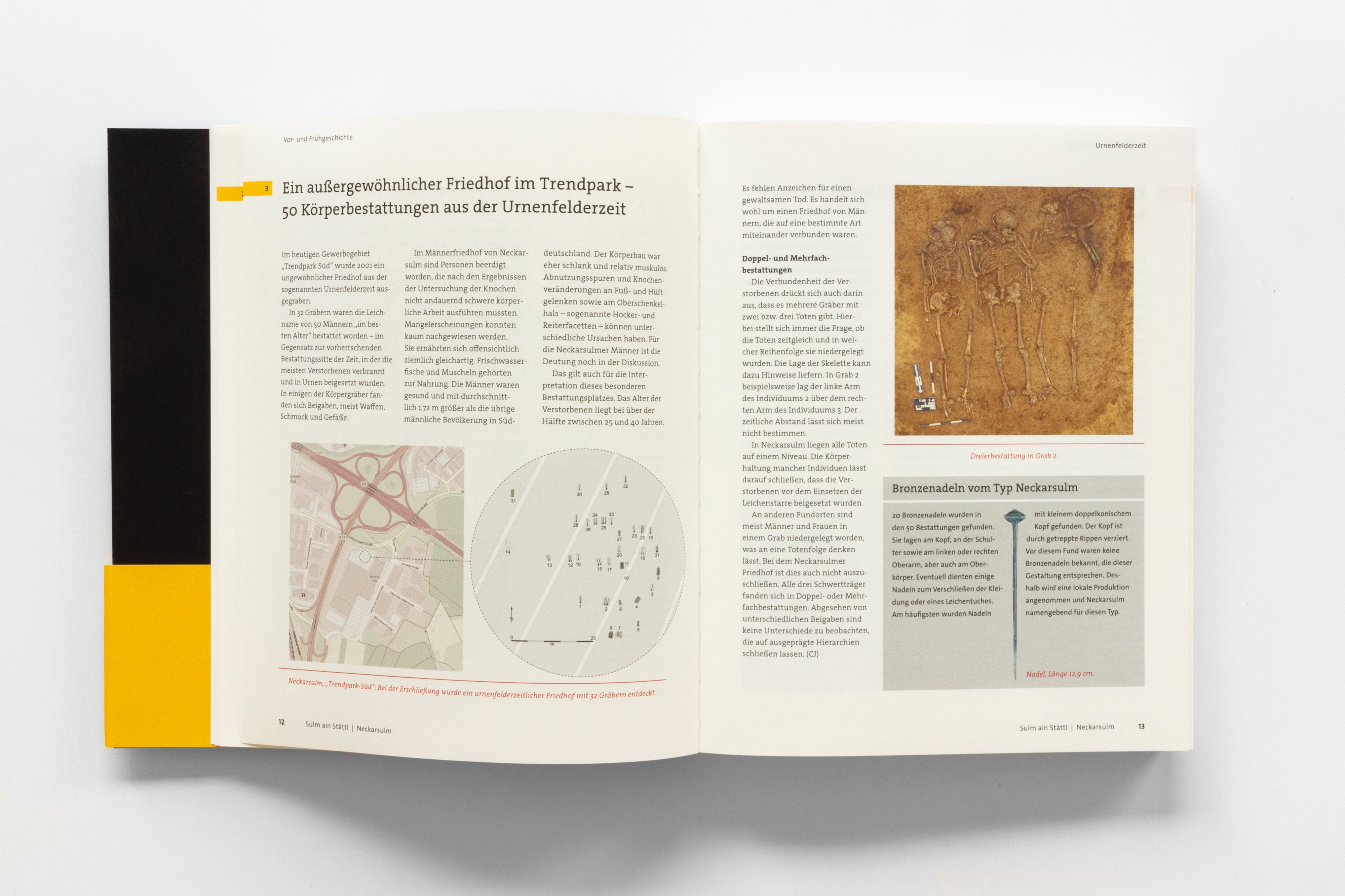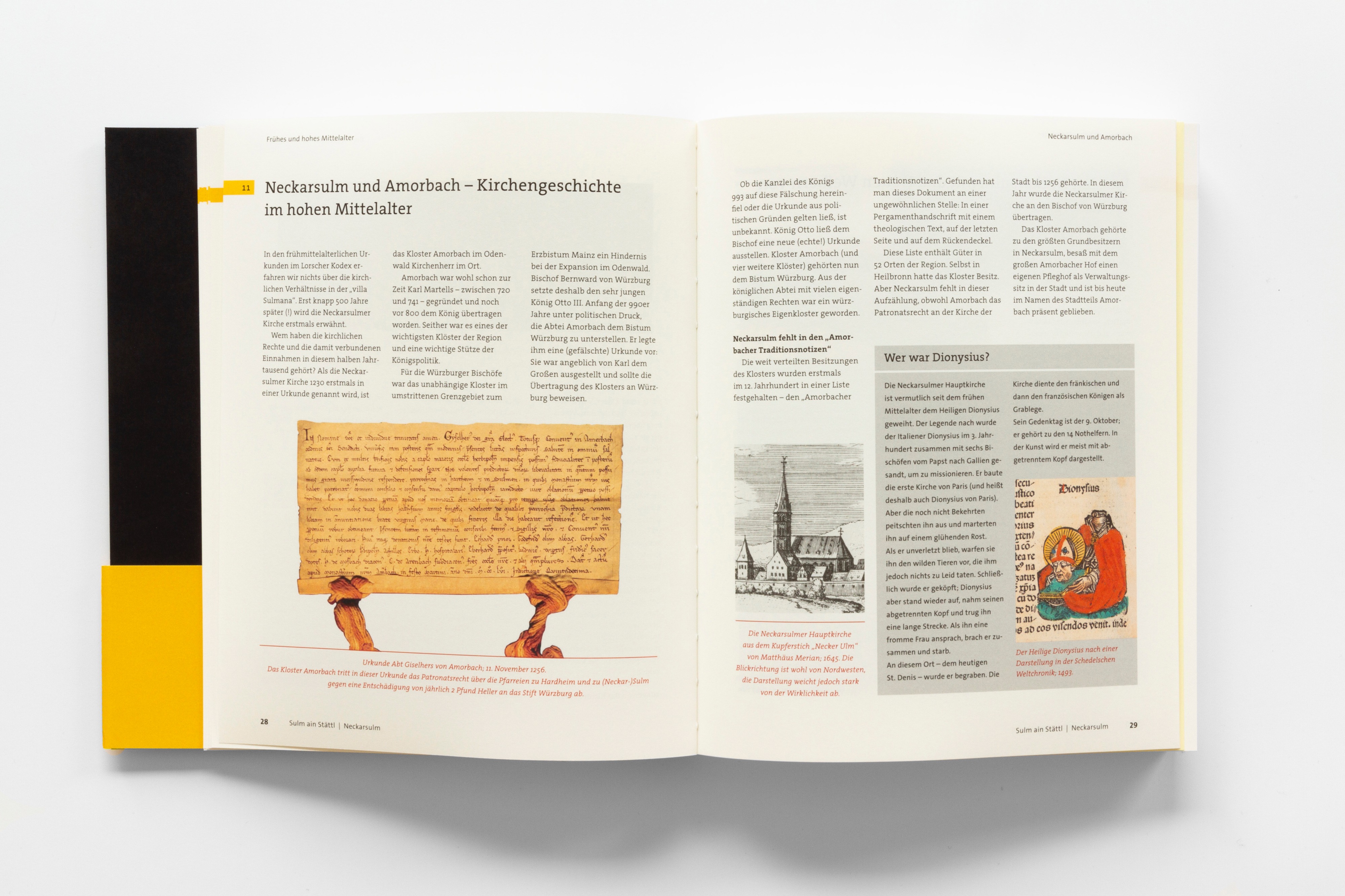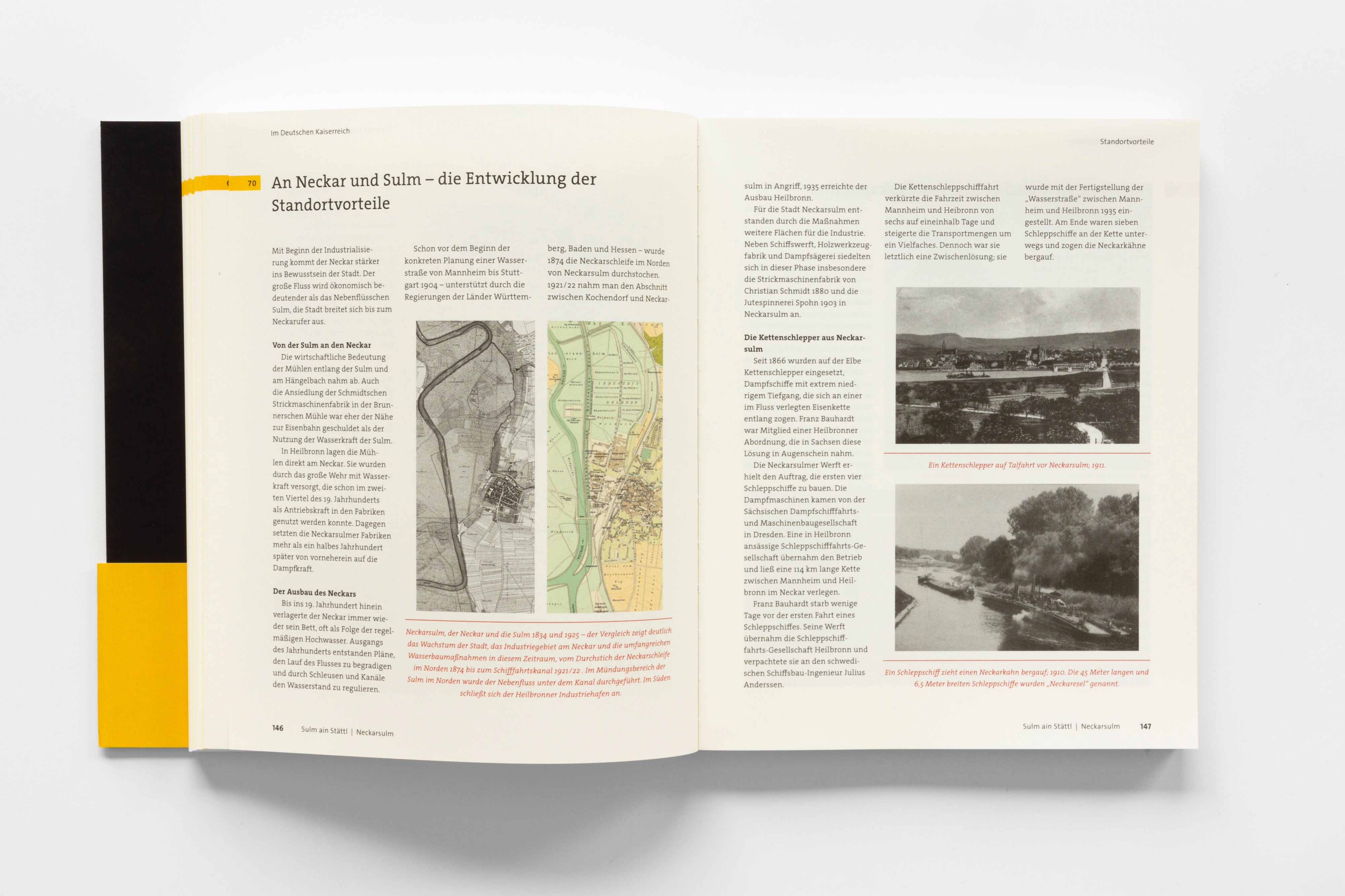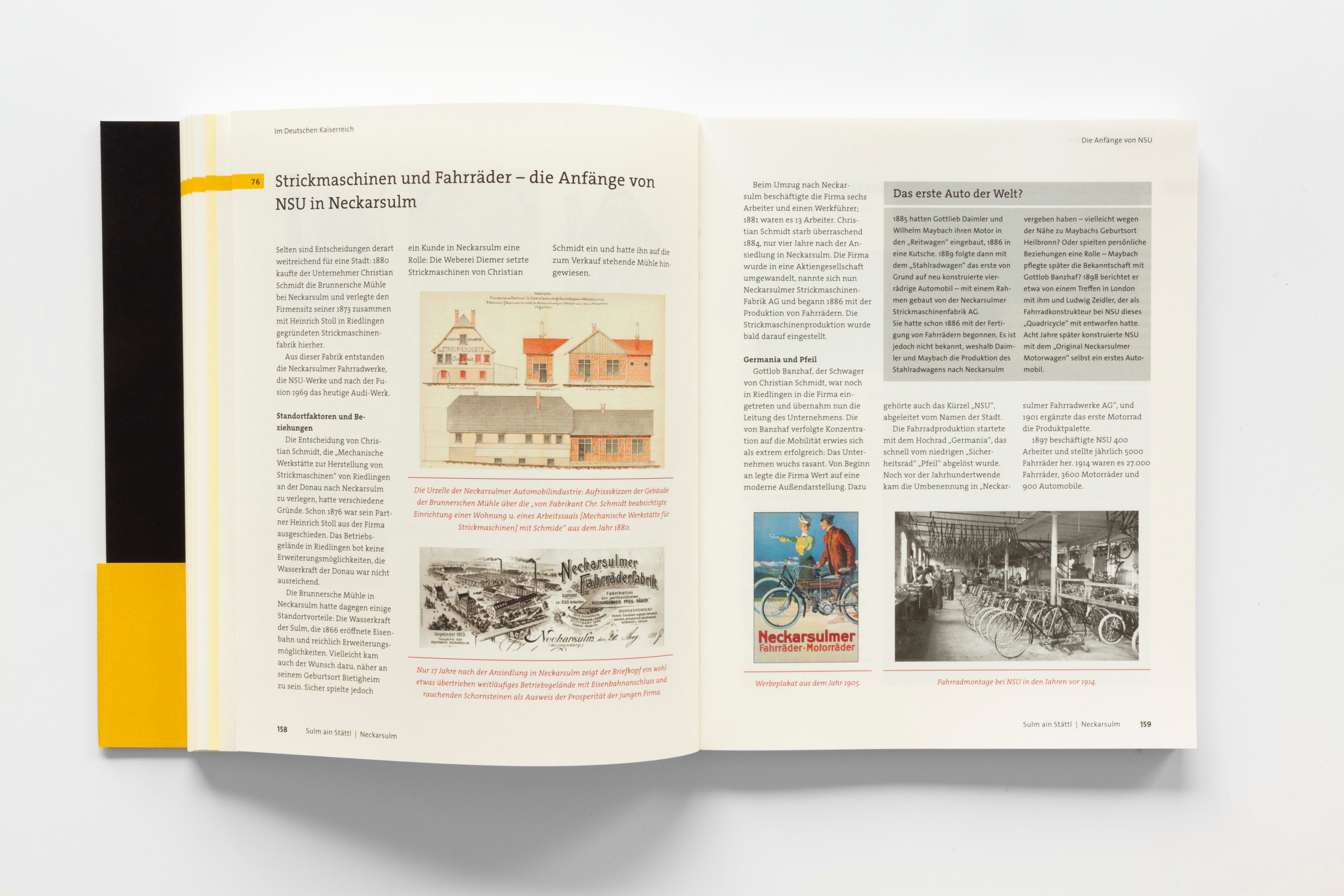 Stadtgeschichtsbuch, herausgegeben von der Stadt Neckarsulm anlässlich des 1250-jährigen Jubiläums. In 125 Kapiteln — je eines pro Doppelseite — wird ein Gesamtblick auf die Geschichte der Stadt entwickelt. Das 280 Seiten starke Werk erscheint in zwei Ausführungen: In einer Hardcover-Version, realisiert als Schweizer Broschur und ausgestattet mit dem Logo des Jubiläumsjahres in Heißfolienprägung sowie mit einer laufenden Nummerierung. Plus in einer Softcoverausführung als Breitklappen-Broschur zum Verkauf über das Jubiläumsjahr hinaus. Format und Inhalt sind identisch; mit der auf gelber Farbe gegründeten Typo — beim Hardcover als Banderole ausgeführt — erhält das Duett eine gestalterische Klammer.