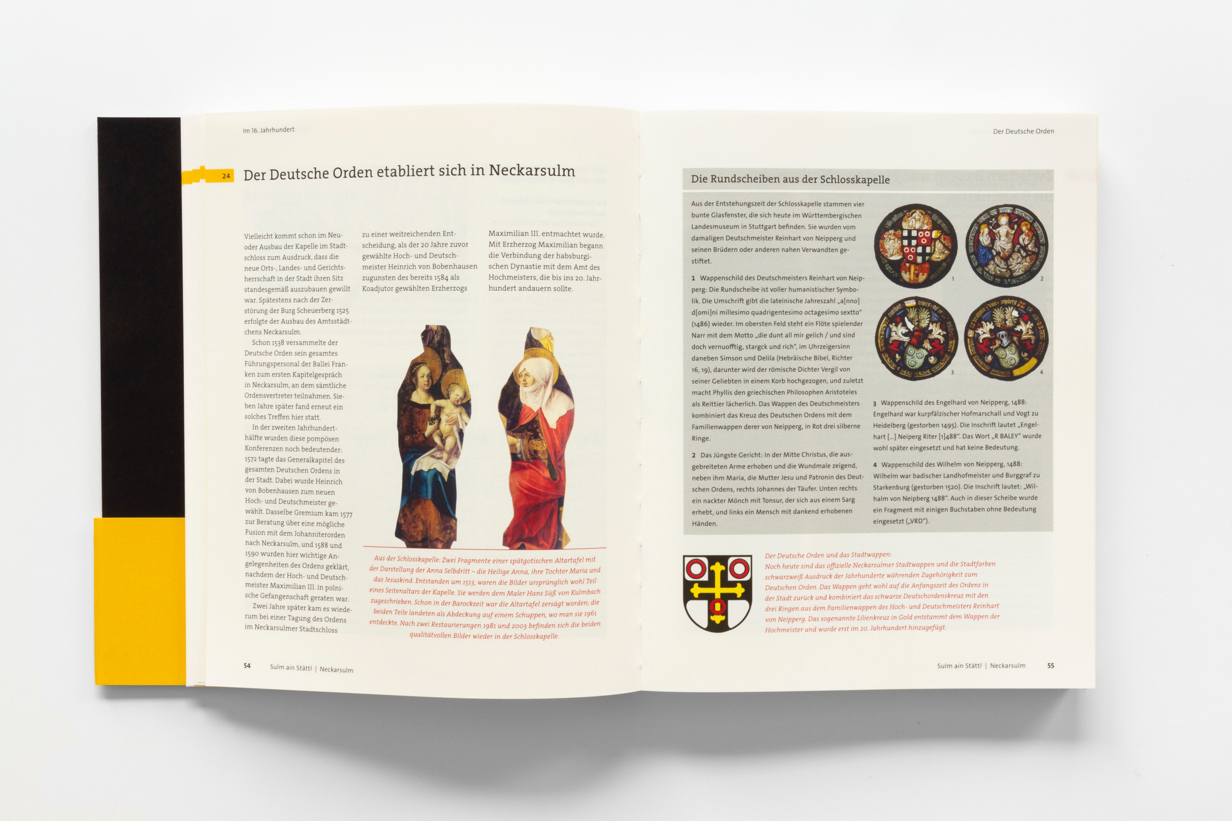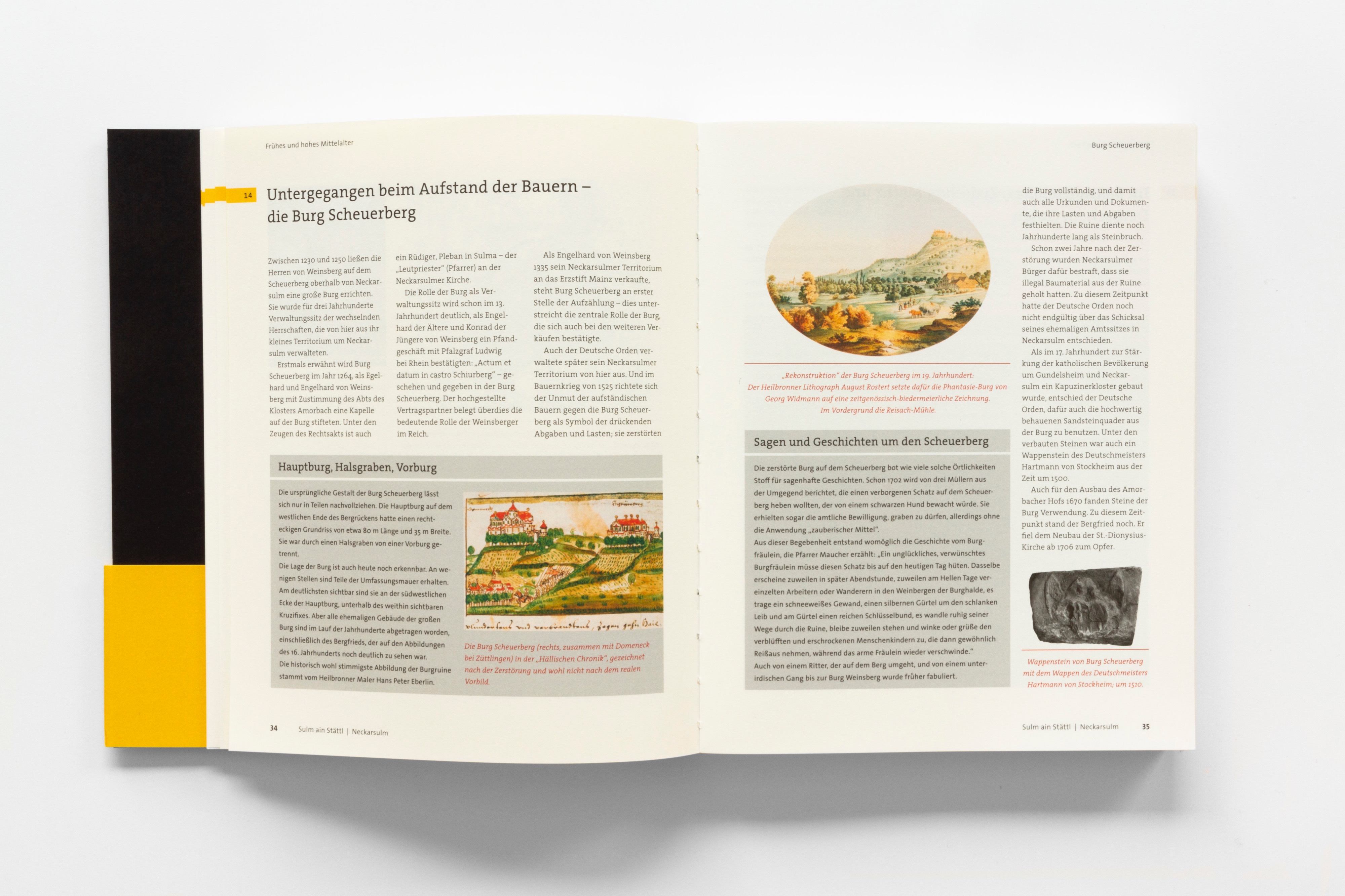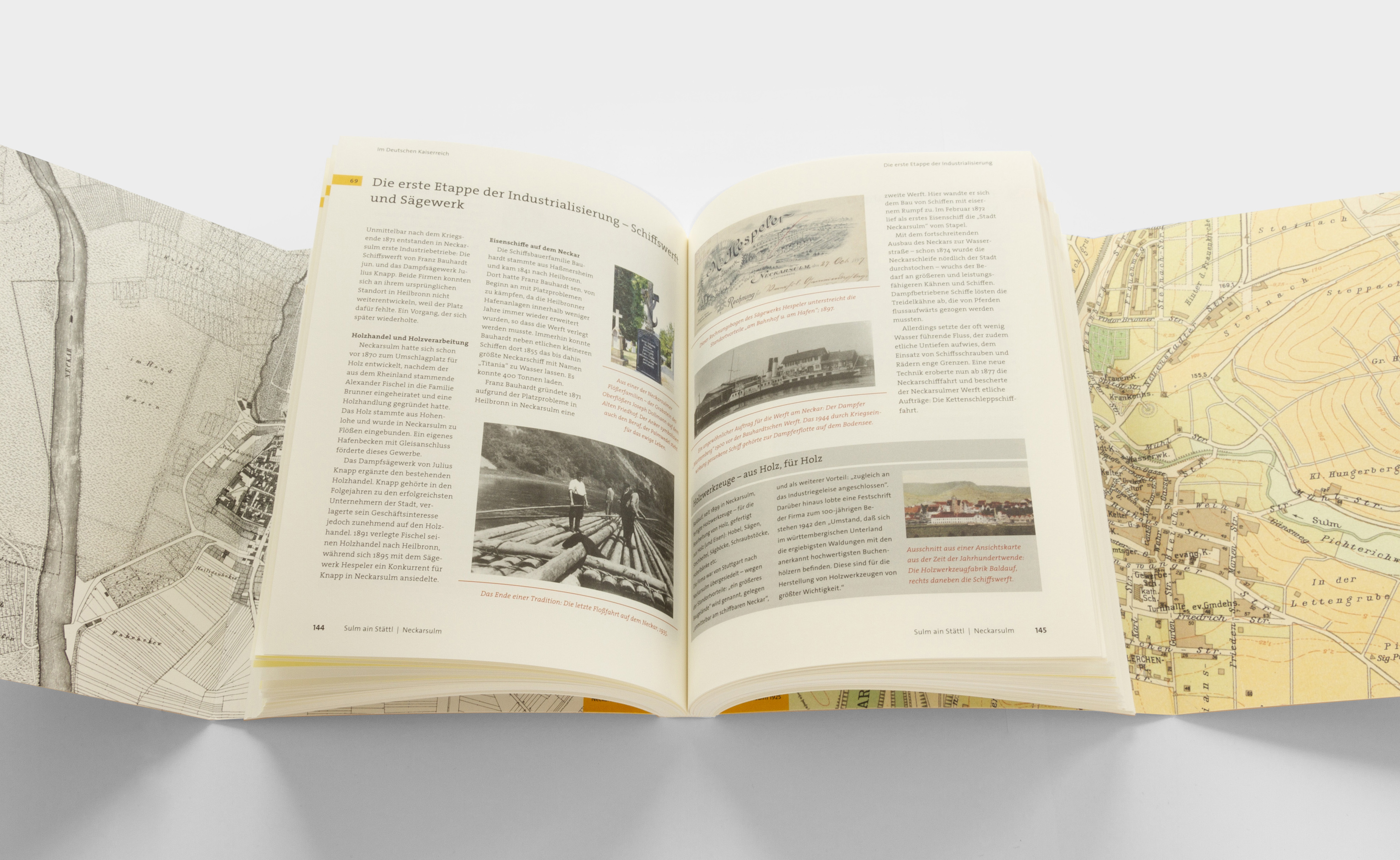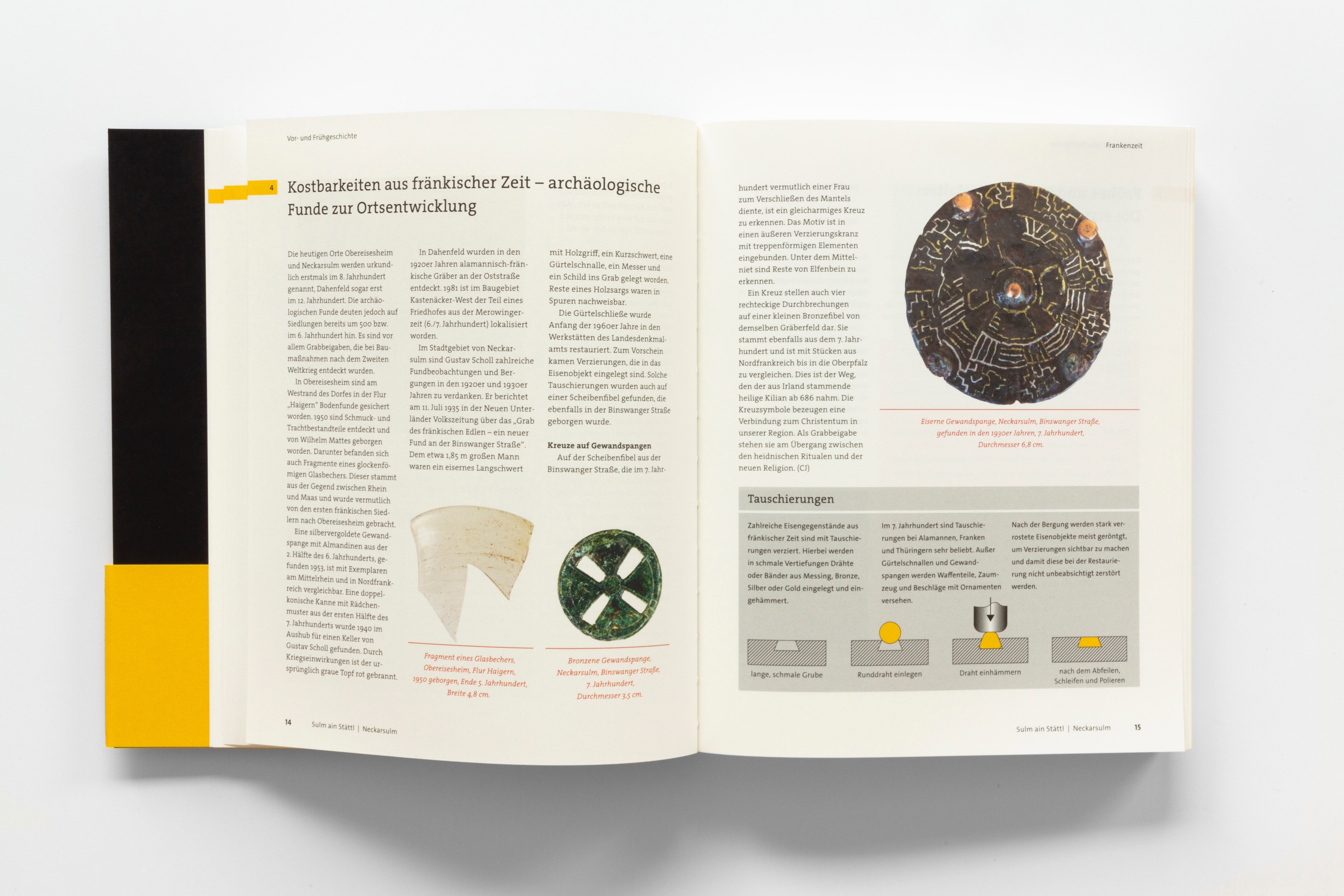 Stadtgeschichtsbuch, herausgegeben von der Stadt Neckarsulm anlässlich des 1250-jährigen Jubiläums. In 125 Kapiteln — je eines pro Doppelseite — wird ein Gesamtblick auf die Geschichte der Stadt entwickelt. Das 280 Seiten starke Werk erscheint in zwei Ausführungen: In einer Hardcover-Version, realisiert als Schweizer Broschur und ausgestattet mit dem Logo des Jubiläumsjahres in Heißfolienprägung sowie mit einer laufenden Nummerierung. Plus in einer Softcoverausführung als Breitklappen-Broschur zum Verkauf über das Jubiläumsjahr hinaus. Format und Inhalt sind identisch; mit der auf gelber Farbe gegründeten Typo — beim Hardcover als Banderole ausgeführt — erhält das Duett eine gestalterische Klammer.