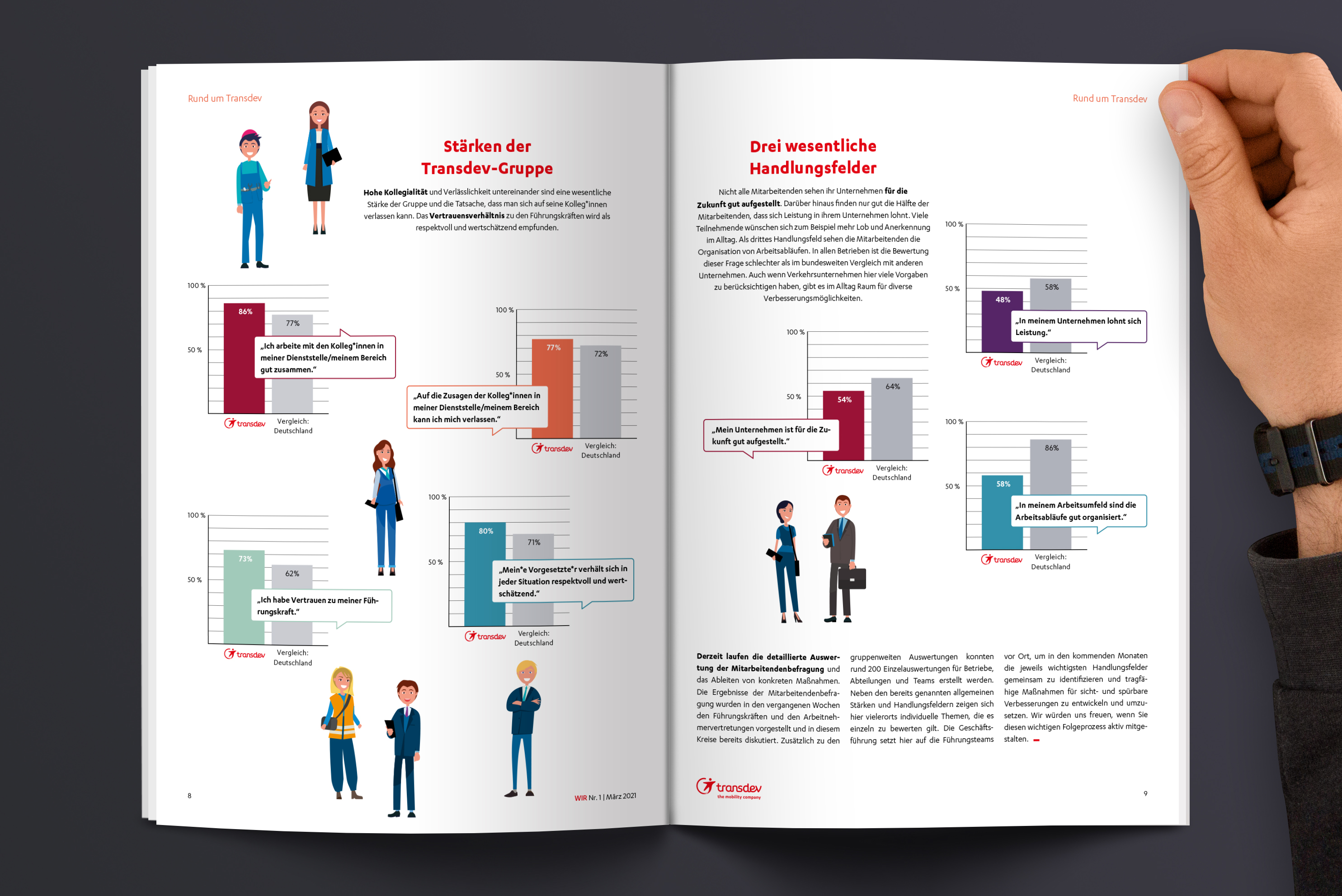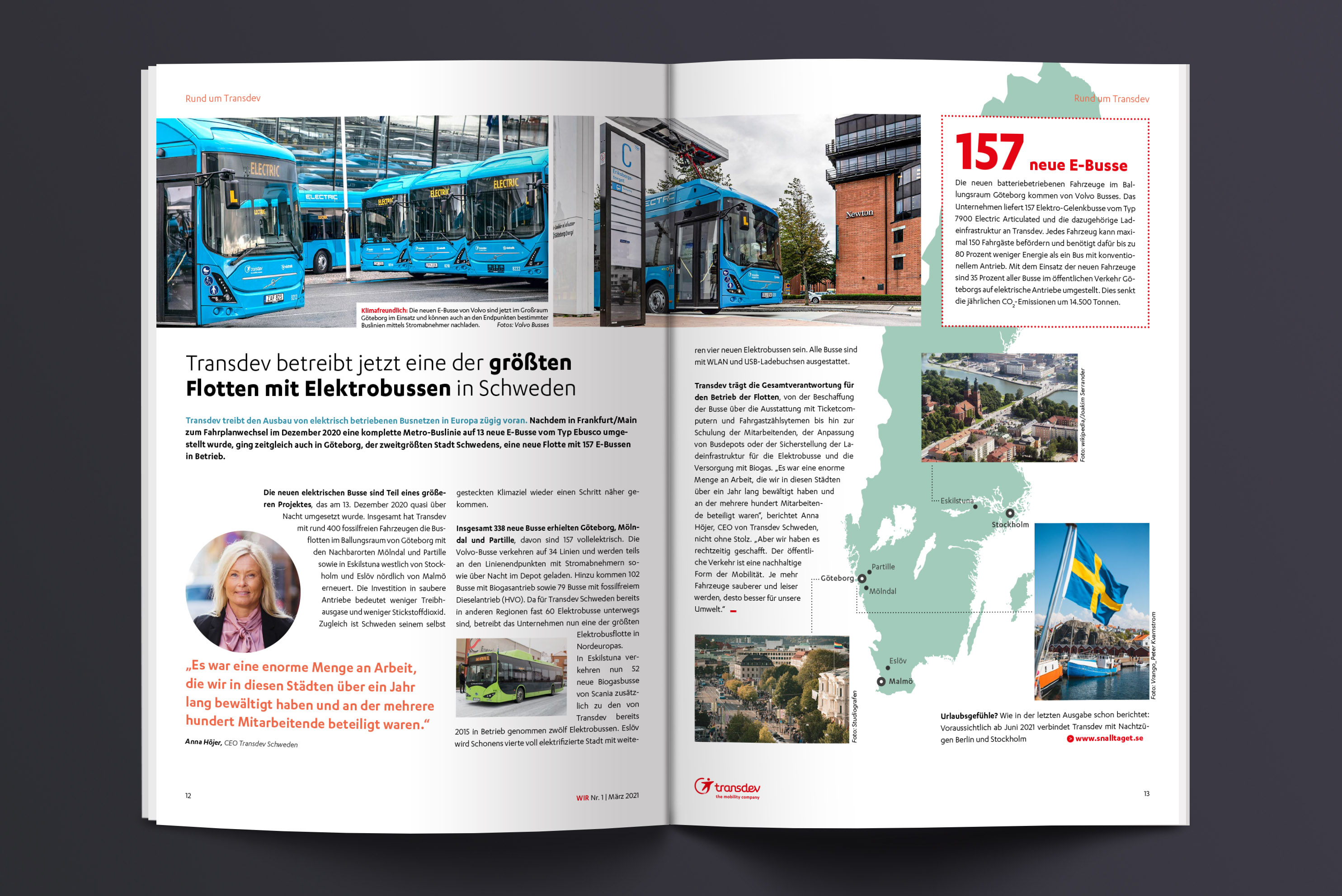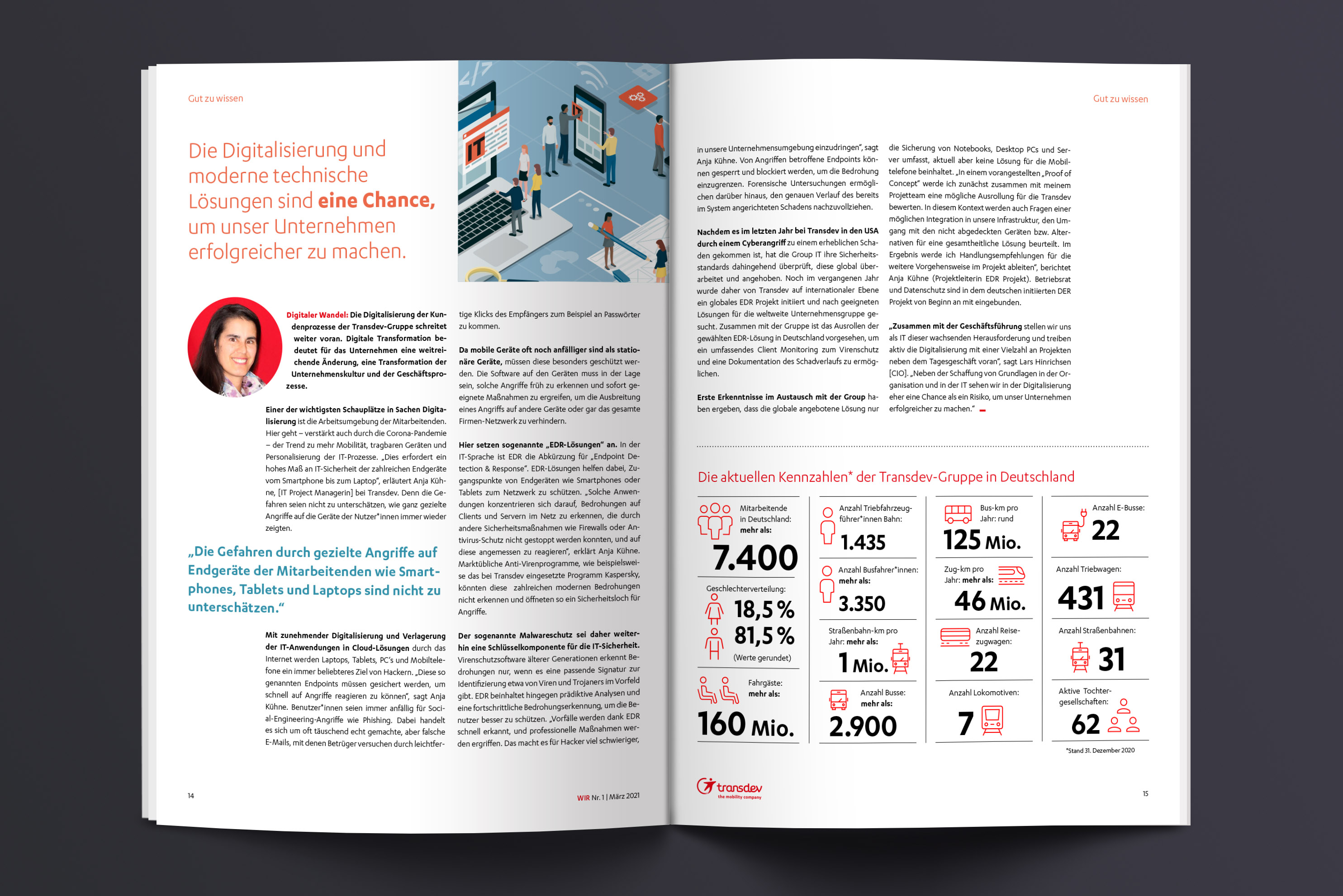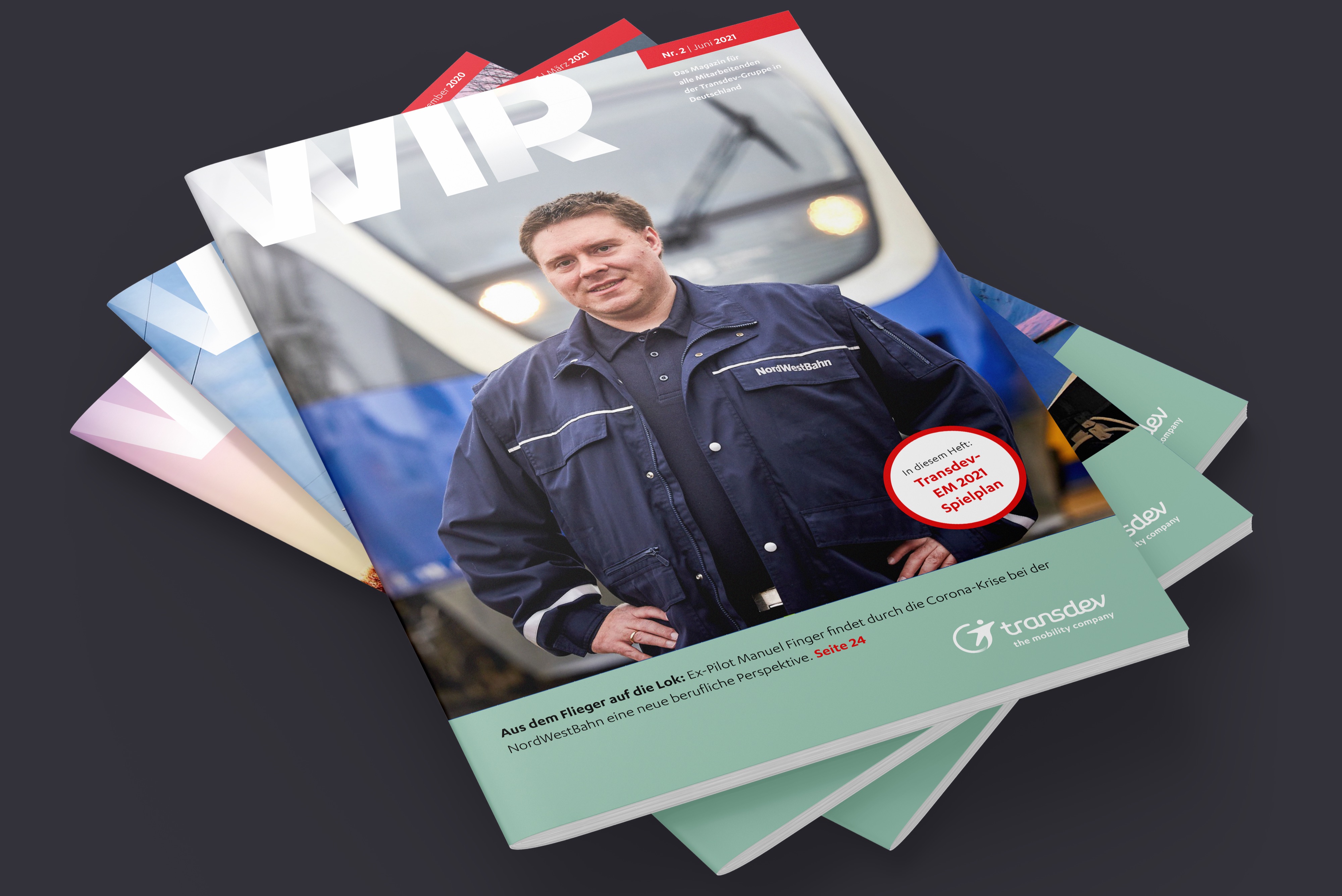 Die Transdev-Gruppe ist der führende private Nahverkehrsanbieter im deutschen Bahn- und Busverkehr. Zweimonatlich erscheint sie, die „WIR“, Mitarbeiterzeitung des Unternehmens, gestaltet von gruppe sepia.