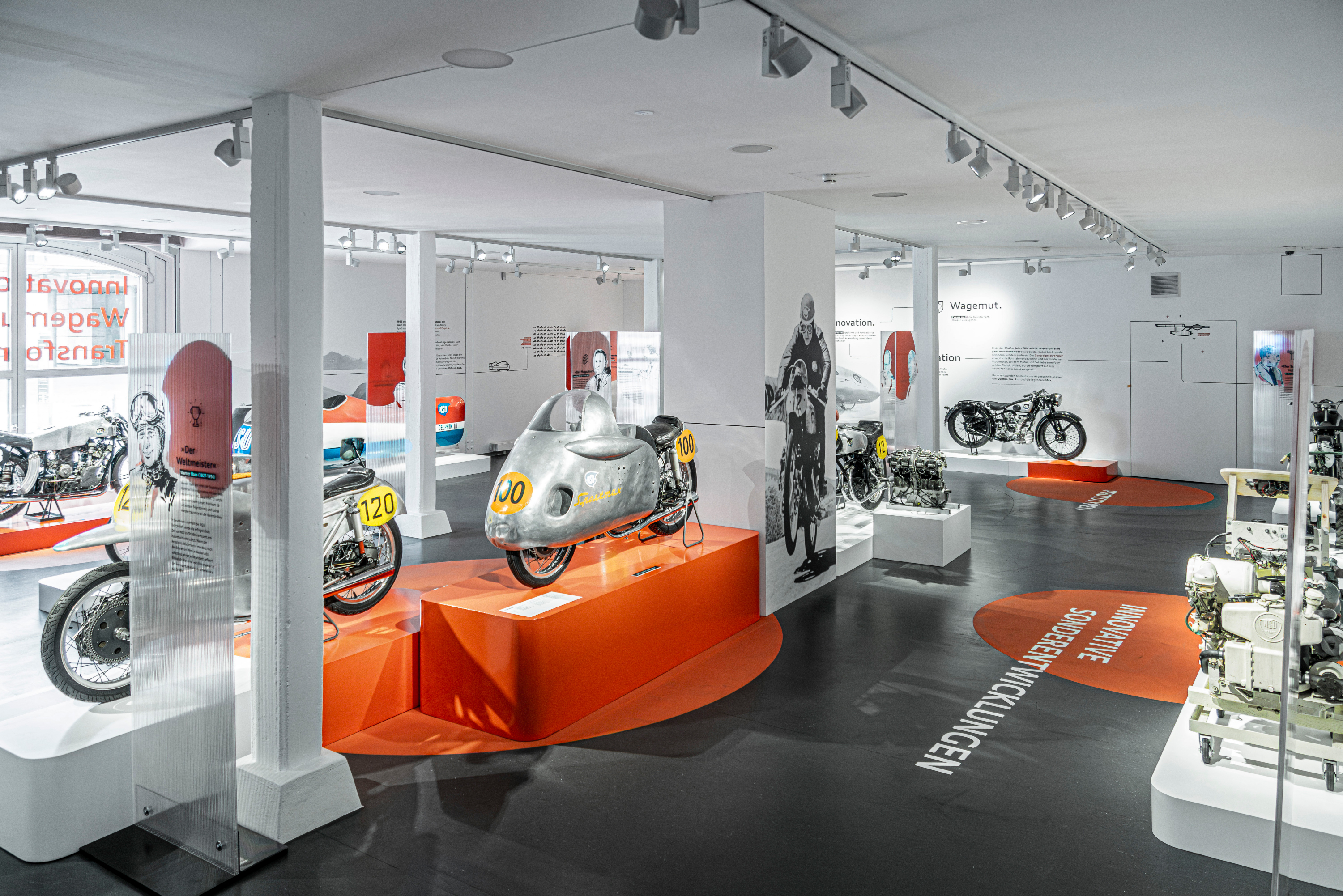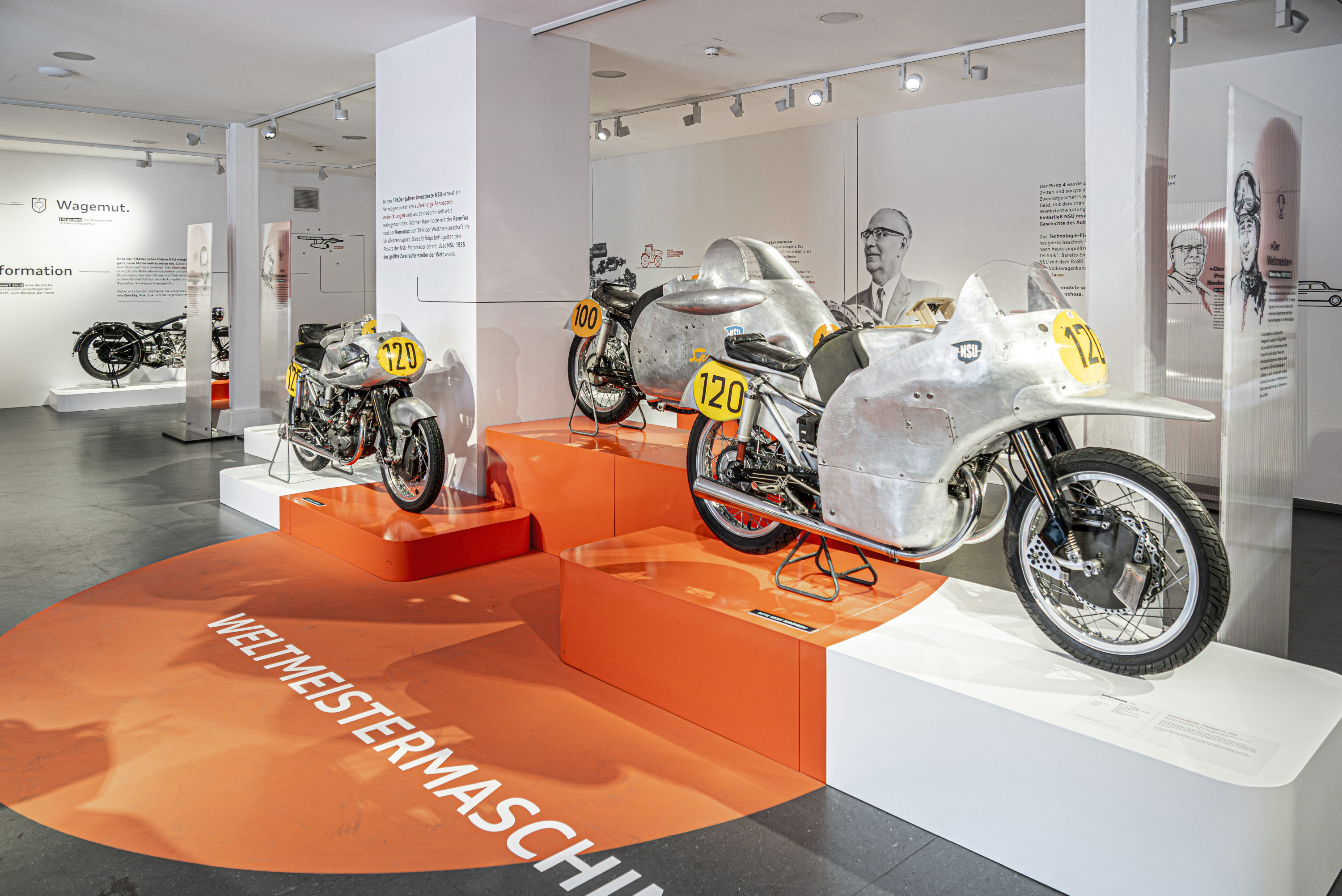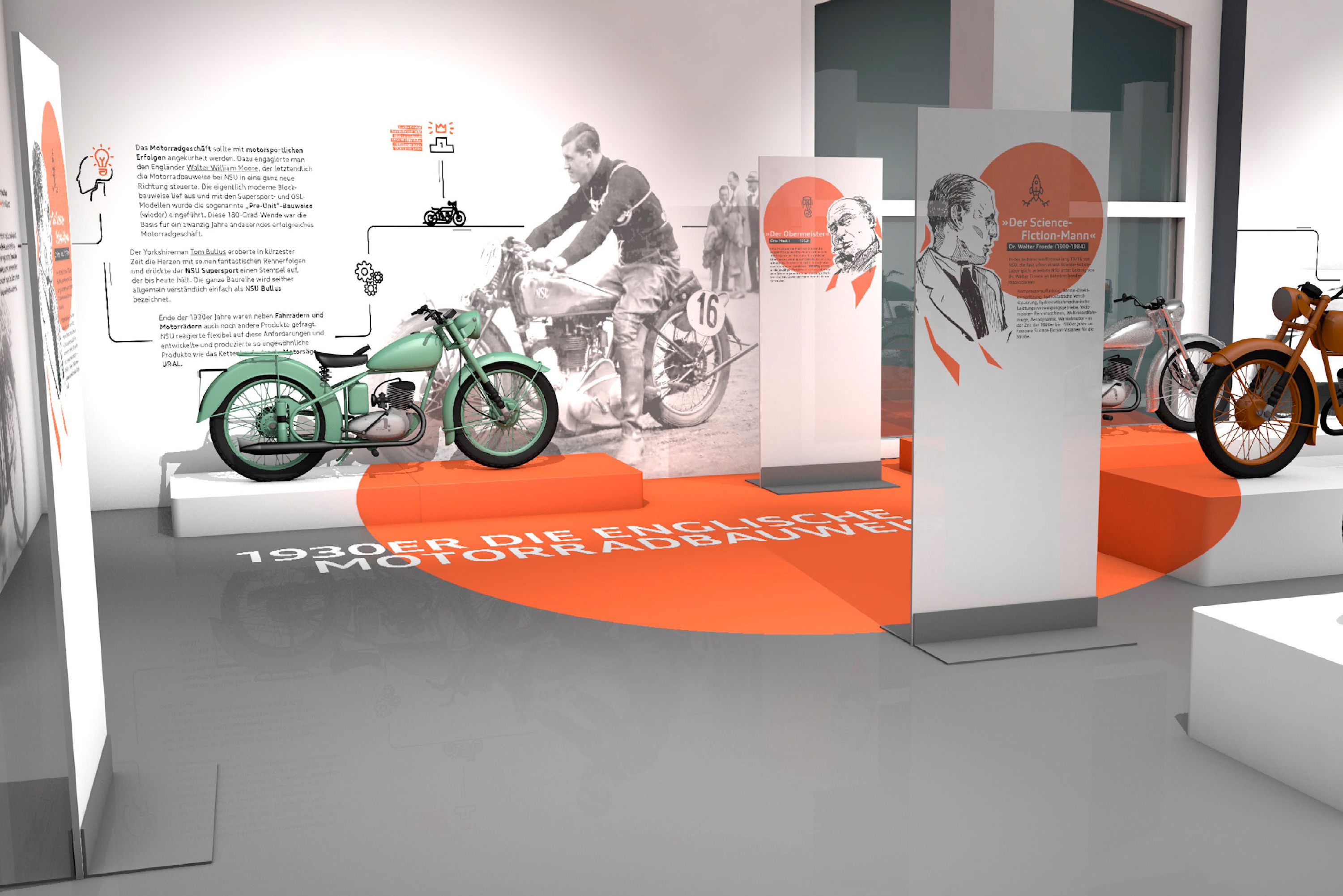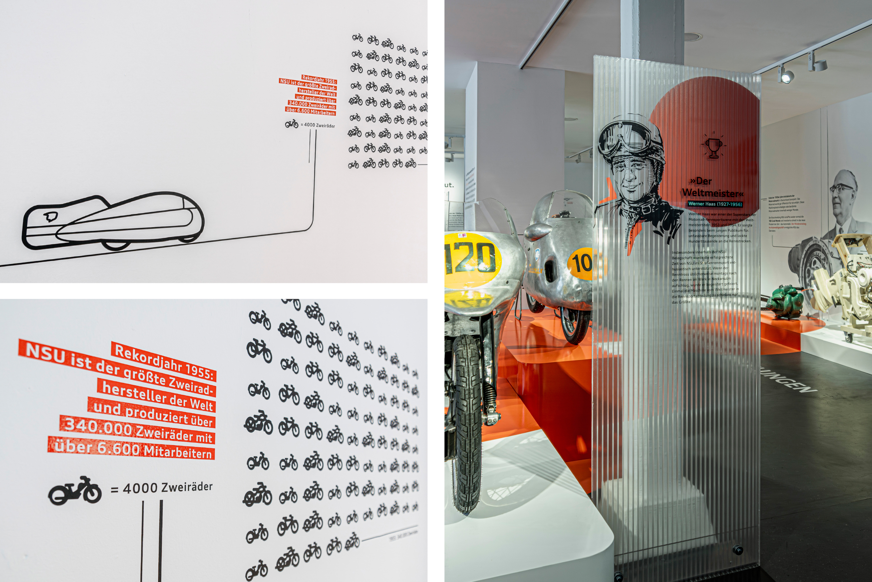 Menschen und Maschinen aus Neckarsulm. Die große Sonderausstellung im Deutschen Zweirad- und NSU-Museum sowie im Audi Forum Neckarsulm stellte 160 historische Fahrzeuge in den Fokus: Weltmeistermaschinen, Sonderentwicklungen, Prototypen. Persönlichkeiten hinter den Maschinen werden lebendig: Entwickler und Ingenieure, Weltrekordler, Mitarbeiterinnen und Mitarbeiter. Für die Exponate wurde ein modulares Sockelkonzept entwickelt, auf der informativen Ebene setzt die Ausstellung auf orangefarbene Spots, Infografiken und Illustrationen, eine Referenz an die historische Zeit der Menschen und Maschinen aus Neckarsulm.