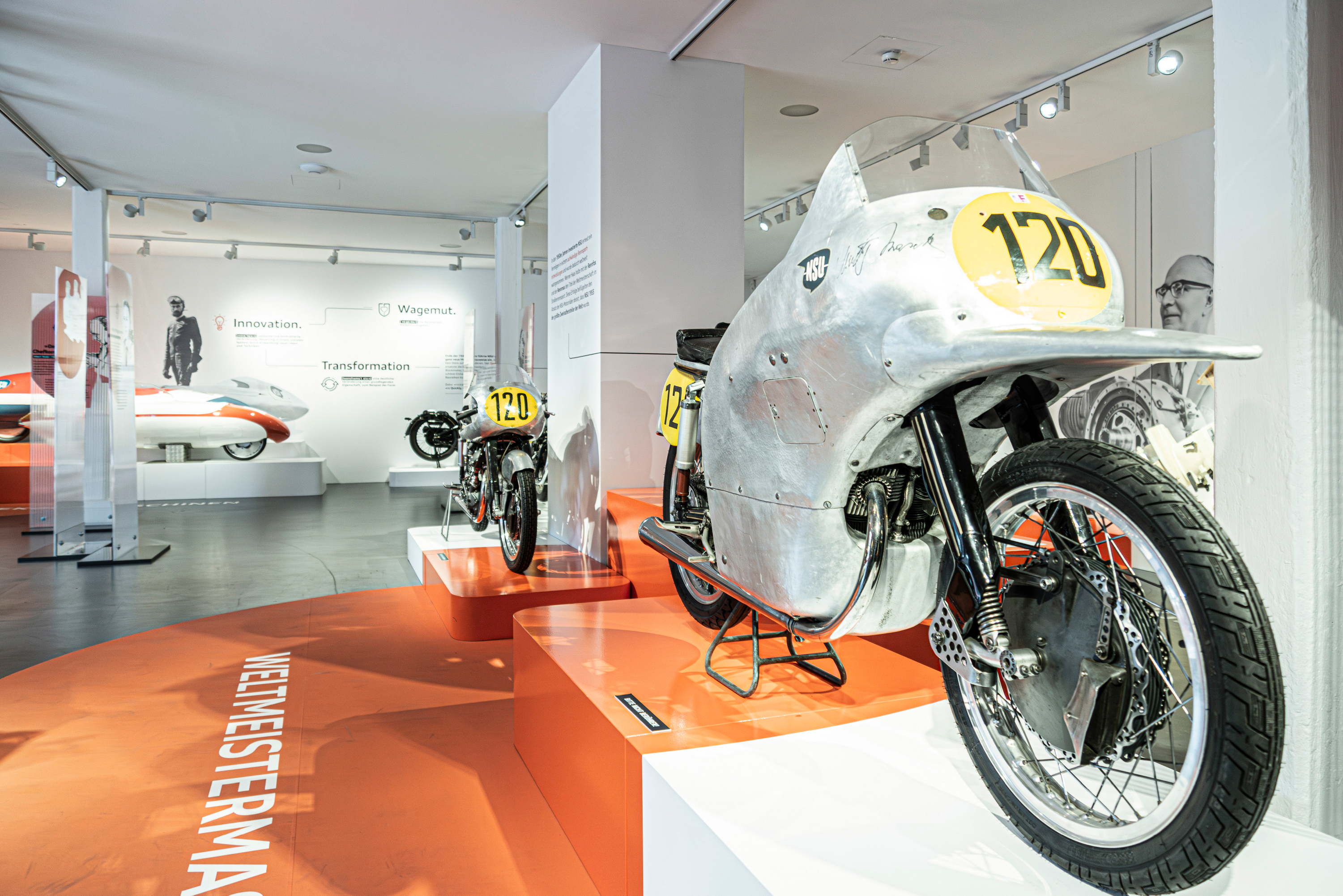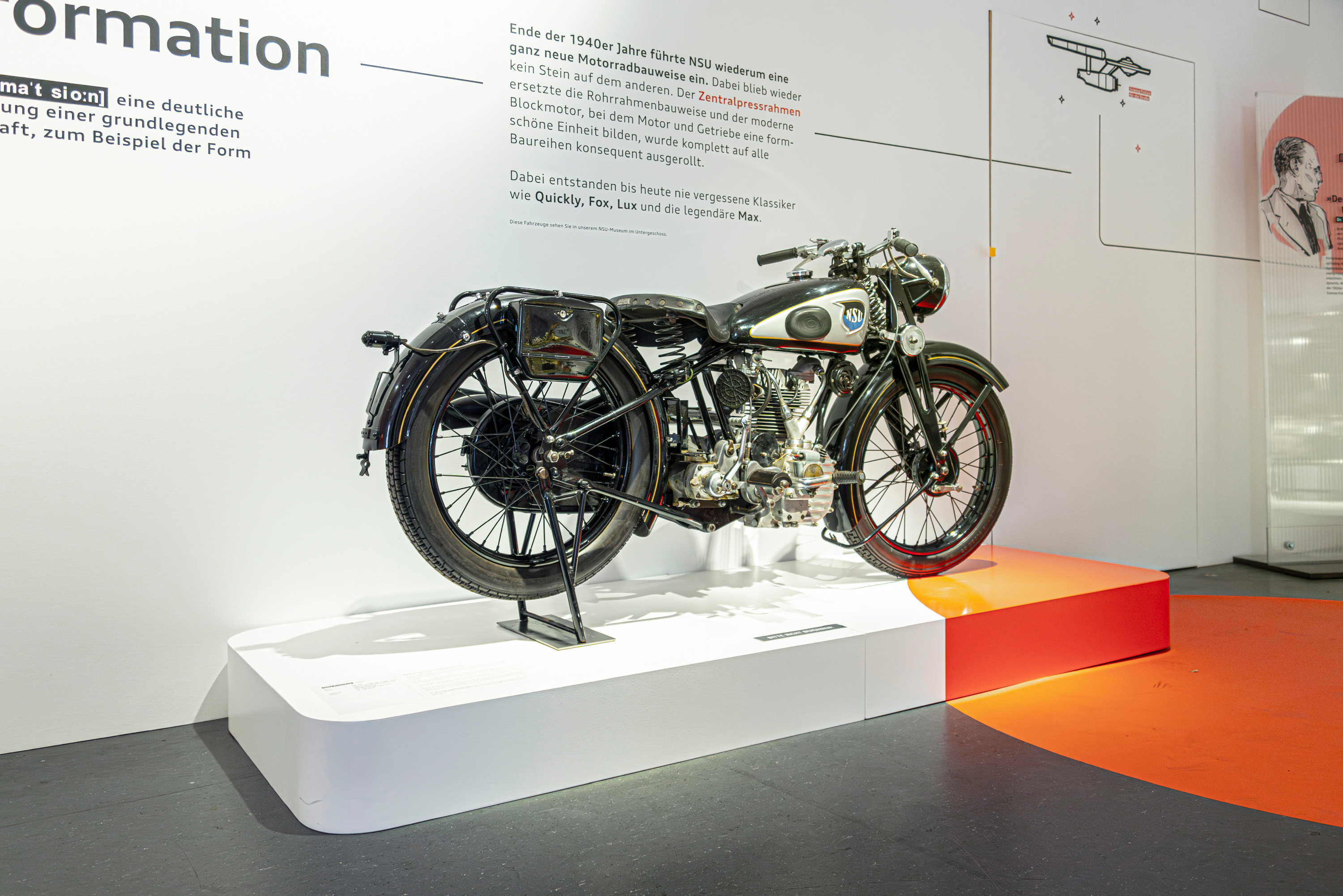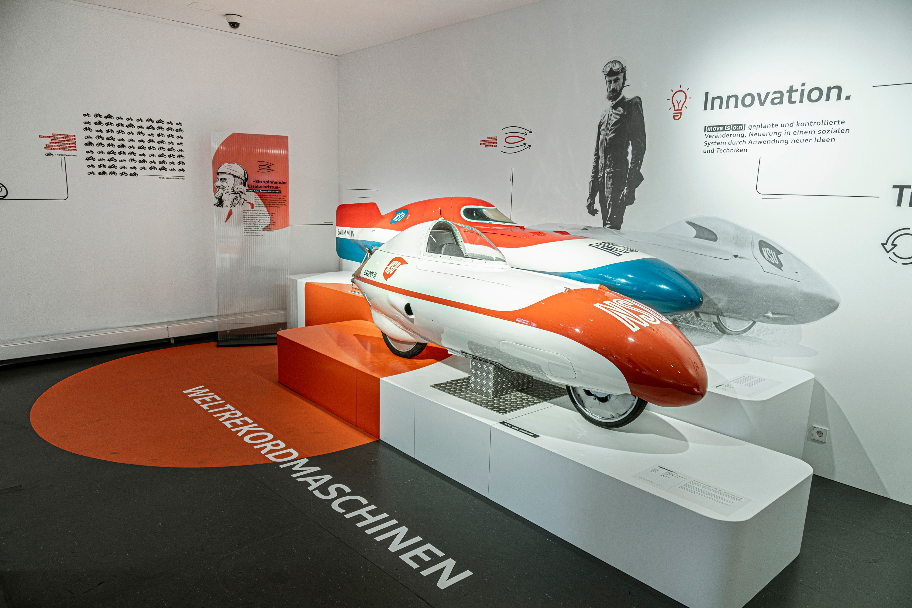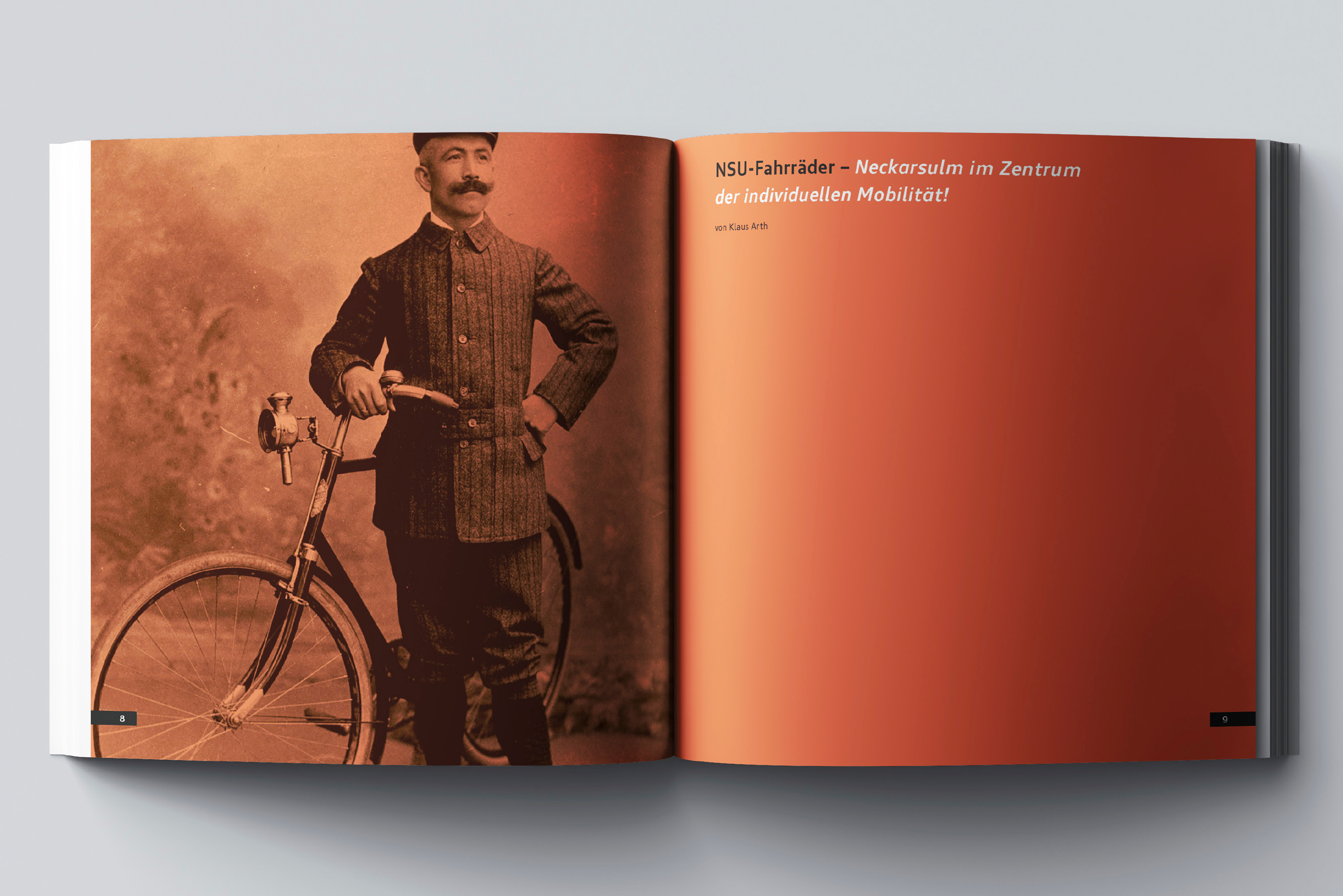 Menschen und Maschinen aus Neckarsulm. Die große Sonderausstellung im Deutschen Zweirad- und NSU-Museum sowie im Audi Forum Neckarsulm stellte 160 historische Fahrzeuge in den Fokus: Weltmeistermaschinen, Sonderentwicklungen, Prototypen. Persönlichkeiten hinter den Maschinen werden lebendig: Entwickler und Ingenieure, Weltrekordler, Mitarbeiterinnen und Mitarbeiter. Für die Exponate wurde ein modulares Sockelkonzept entwickelt, auf der informativen Ebene setzt die Ausstellung auf orangefarbene Spots, Infografiken und Illustrationen, eine Referenz an die historische Zeit der Menschen und Maschinen aus Neckarsulm.