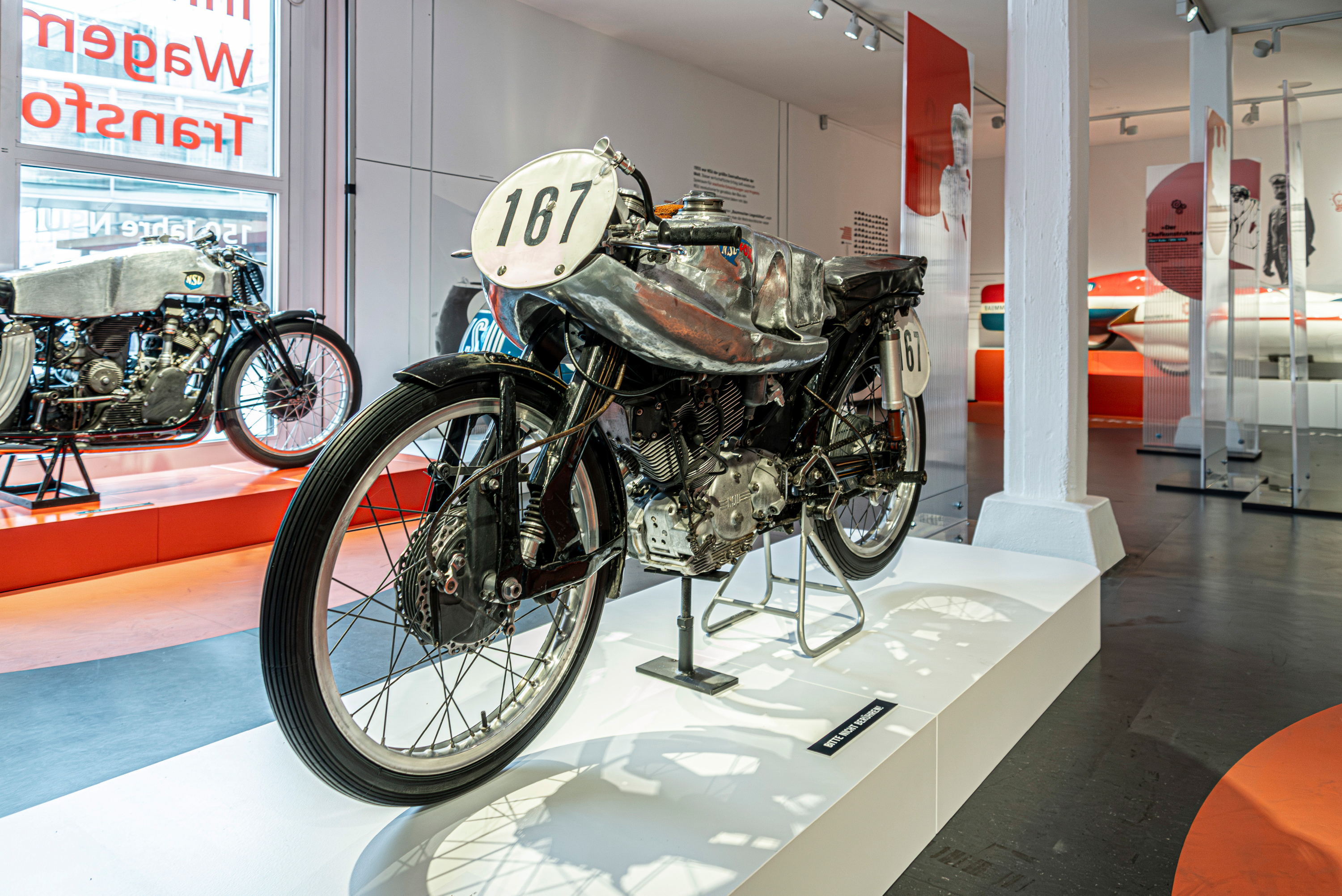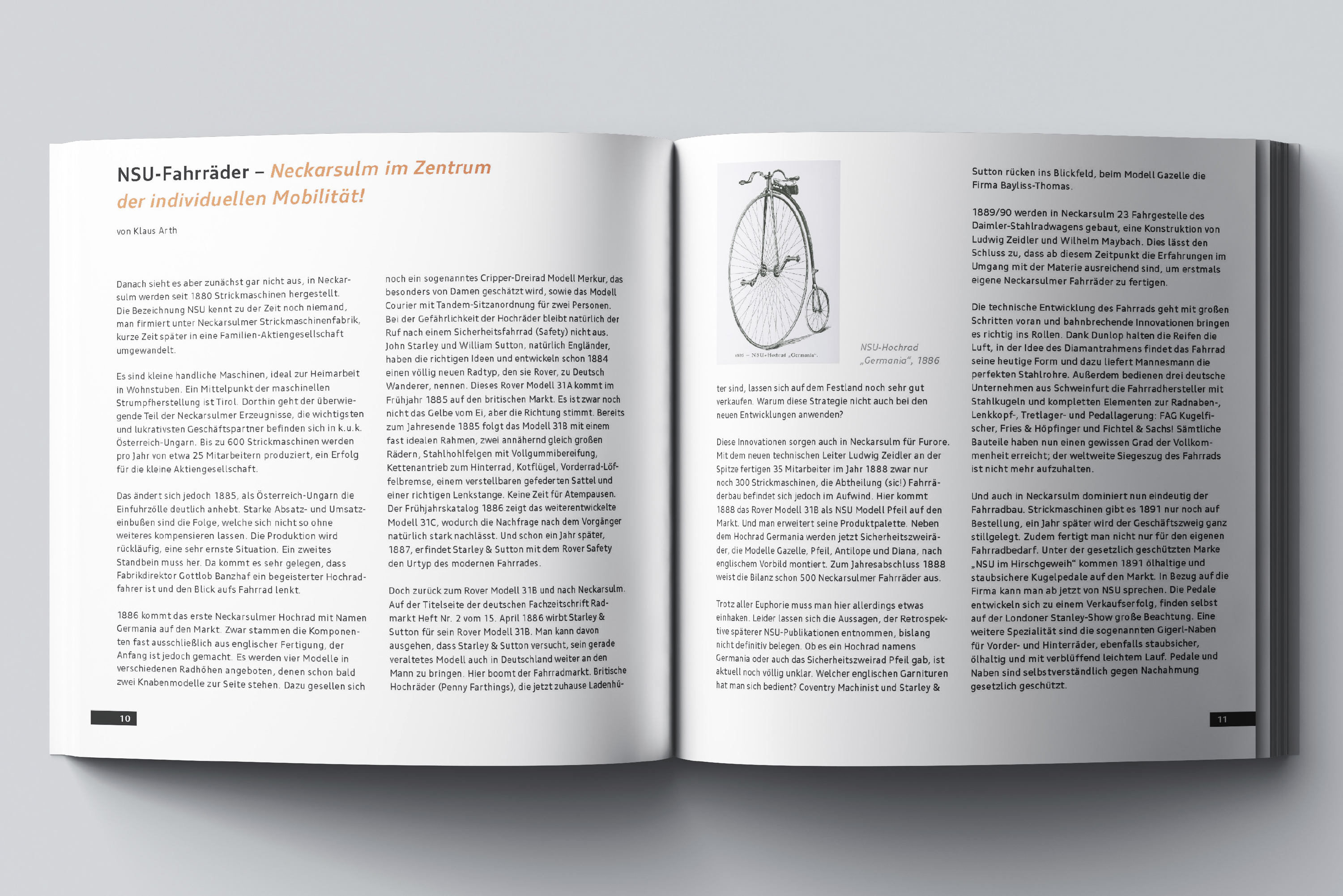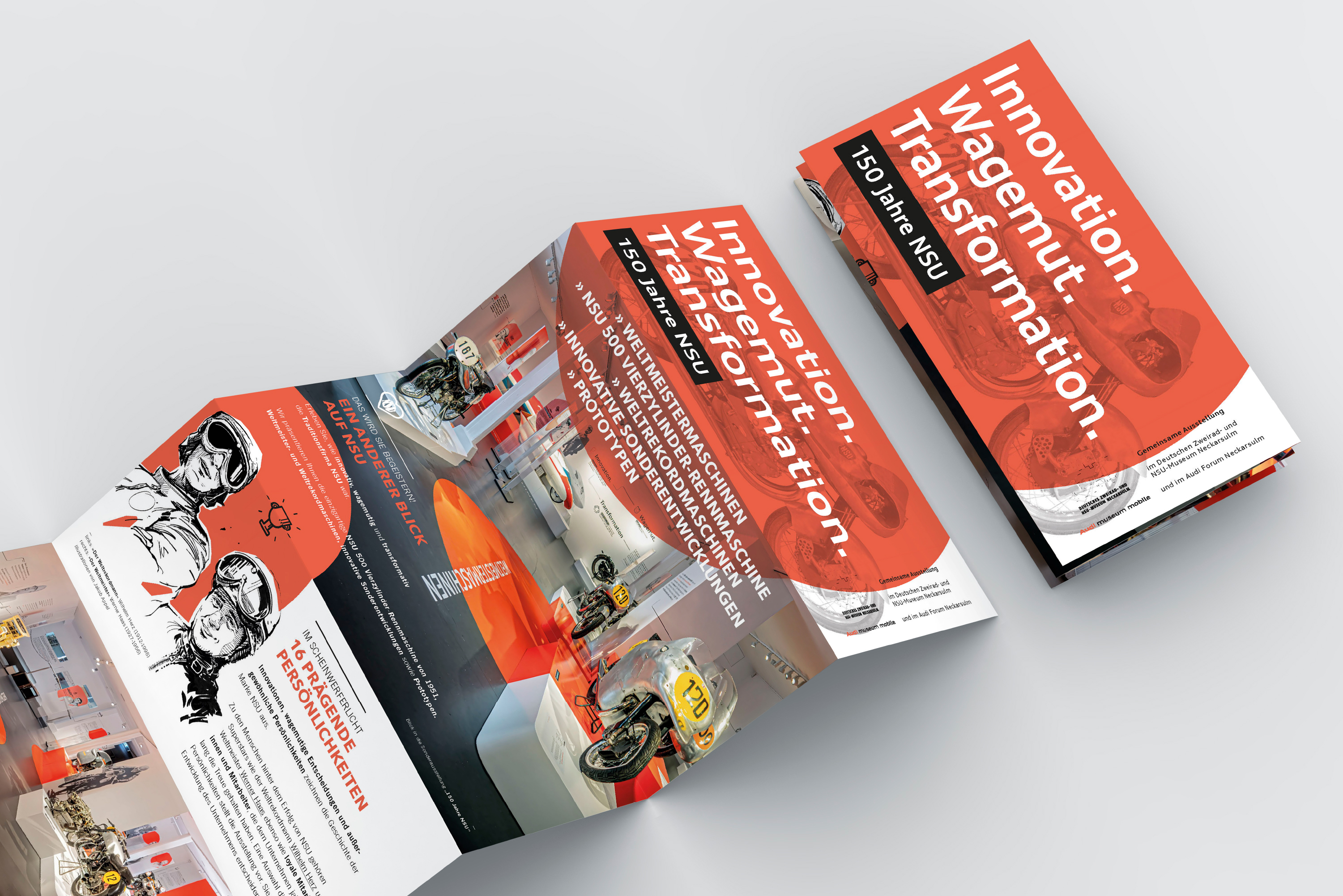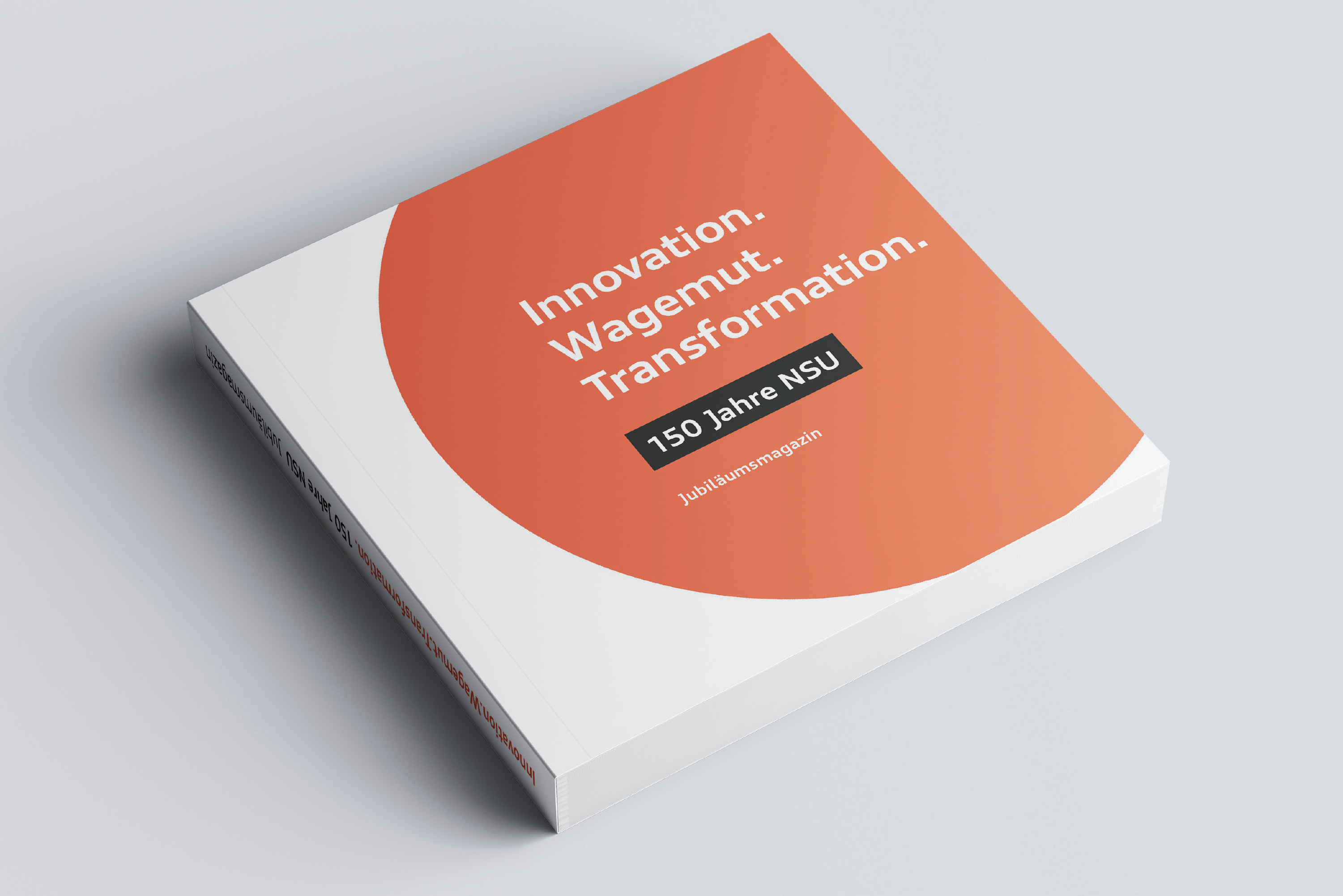 Menschen und Maschinen aus Neckarsulm. Die große Sonderausstellung im Deutschen Zweirad- und NSU-Museum sowie im Audi Forum Neckarsulm stellte 160 historische Fahrzeuge in den Fokus: Weltmeistermaschinen, Sonderentwicklungen, Prototypen. Persönlichkeiten hinter den Maschinen werden lebendig: Entwickler und Ingenieure, Weltrekordler, Mitarbeiterinnen und Mitarbeiter. Für die Exponate wurde ein modulares Sockelkonzept entwickelt, auf der informativen Ebene setzt die Ausstellung auf orangefarbene Spots, Infografiken und Illustrationen, eine Referenz an die historische Zeit der Menschen und Maschinen aus Neckarsulm.