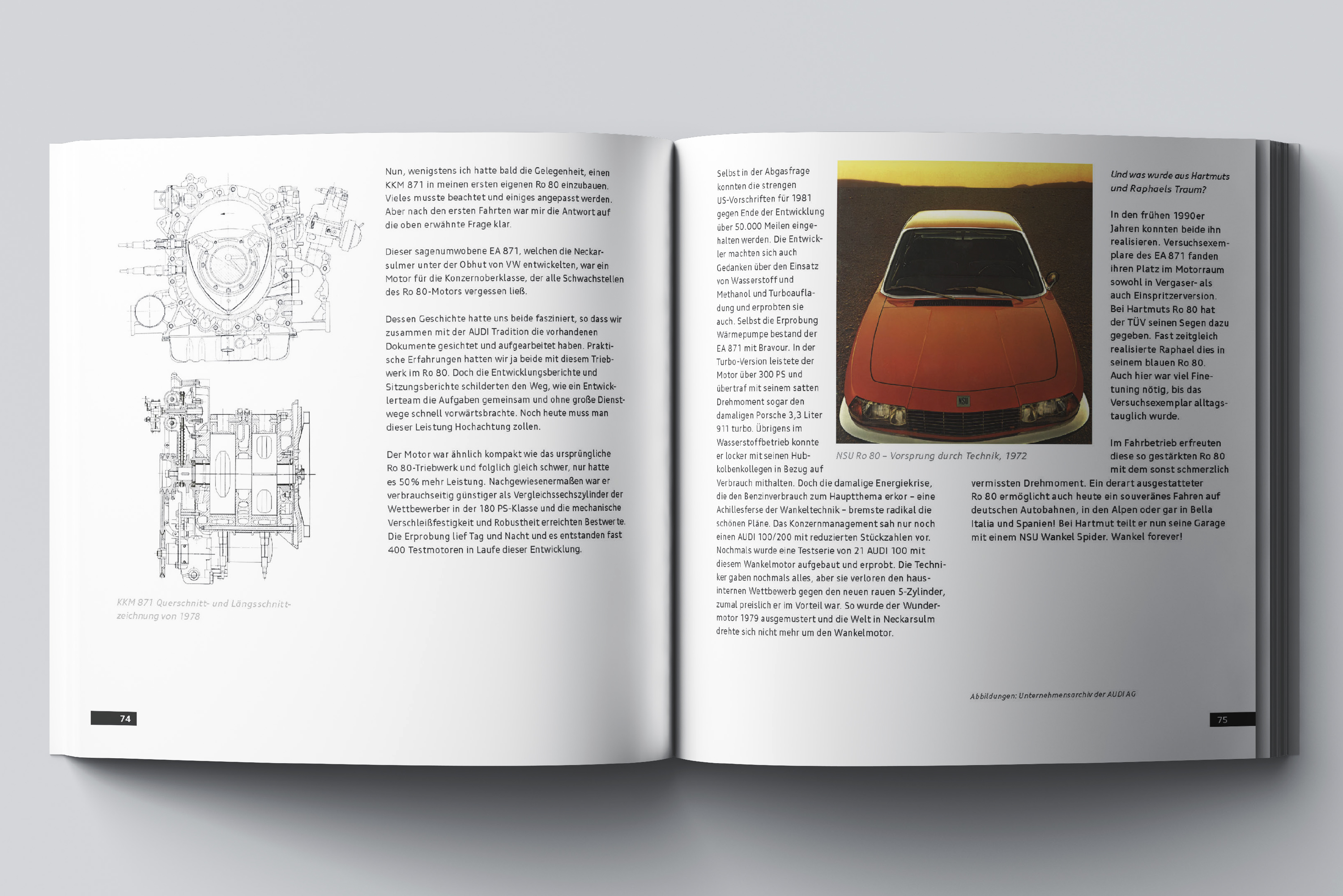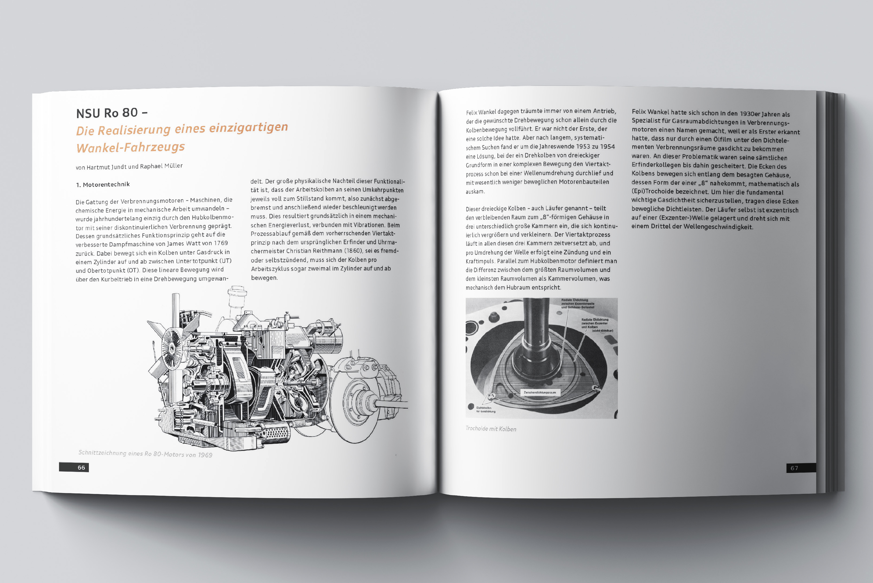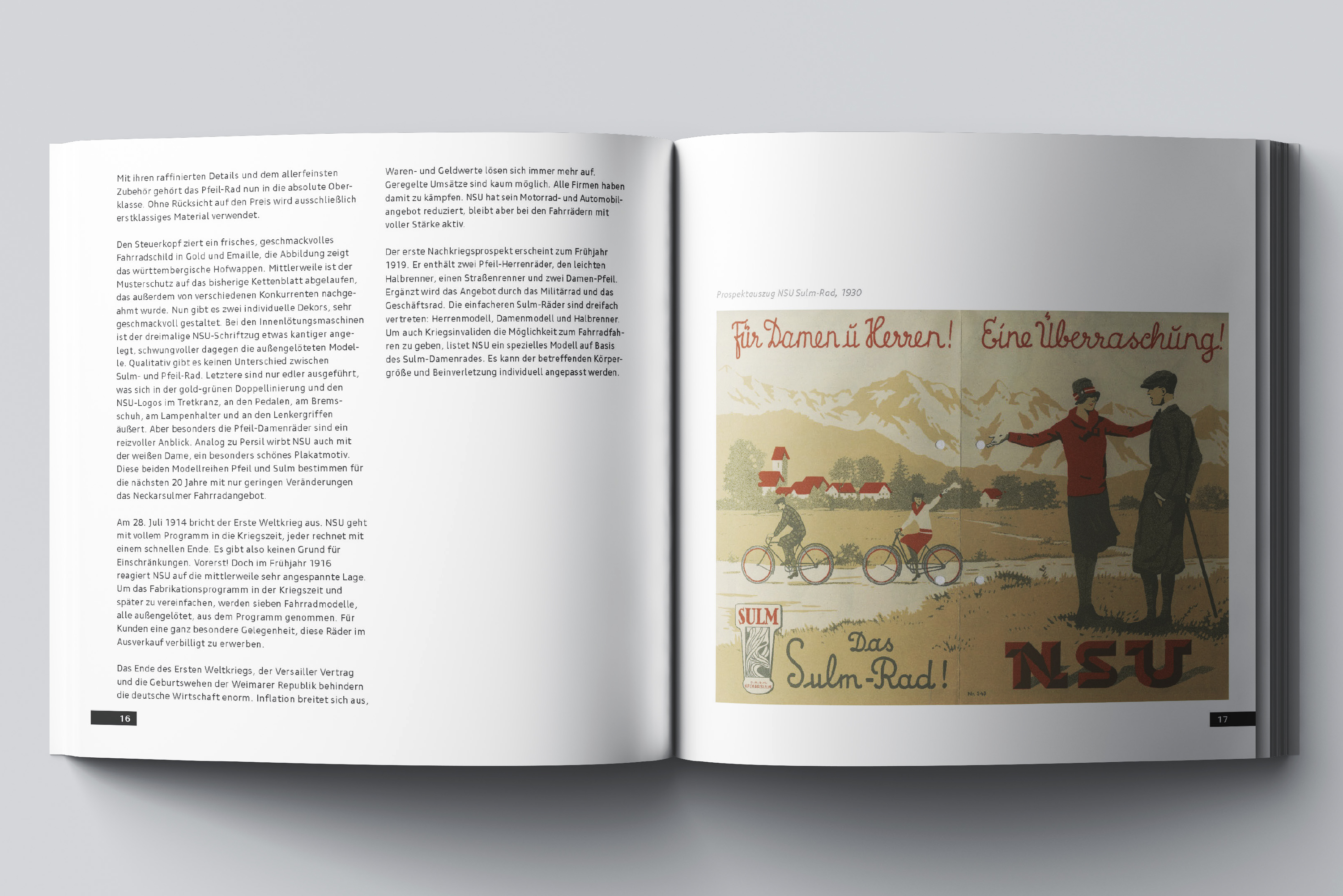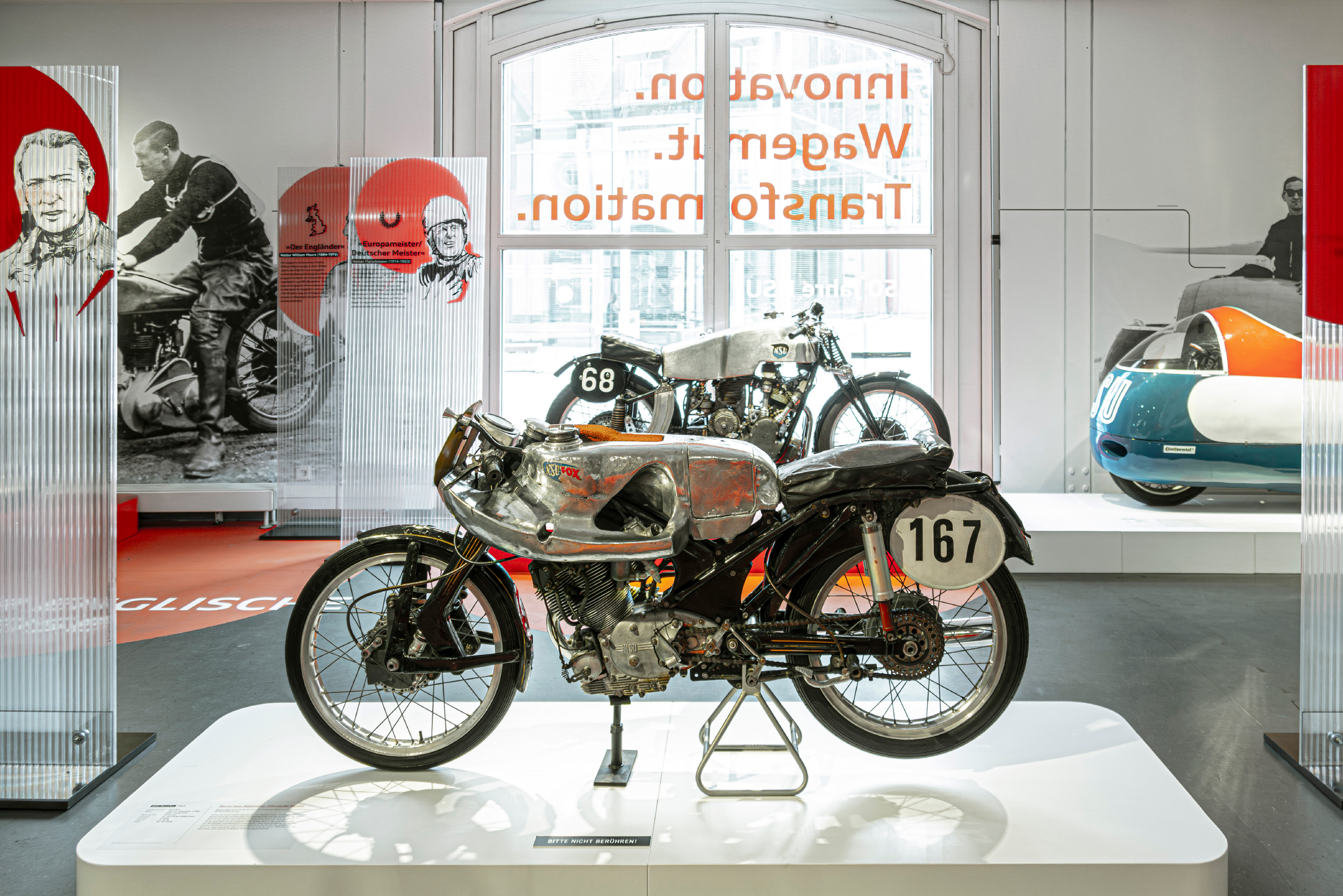 Menschen und Maschinen aus Neckarsulm. Die große Sonderausstellung im Deutschen Zweirad- und NSU-Museum sowie im Audi Forum Neckarsulm stellte 160 historische Fahrzeuge in den Fokus: Weltmeistermaschinen, Sonderentwicklungen, Prototypen. Persönlichkeiten hinter den Maschinen werden lebendig: Entwickler und Ingenieure, Weltrekordler, Mitarbeiterinnen und Mitarbeiter. Für die Exponate wurde ein modulares Sockelkonzept entwickelt, auf der informativen Ebene setzt die Ausstellung auf orangefarbene Spots, Infografiken und Illustrationen, eine Referenz an die historische Zeit der Menschen und Maschinen aus Neckarsulm.