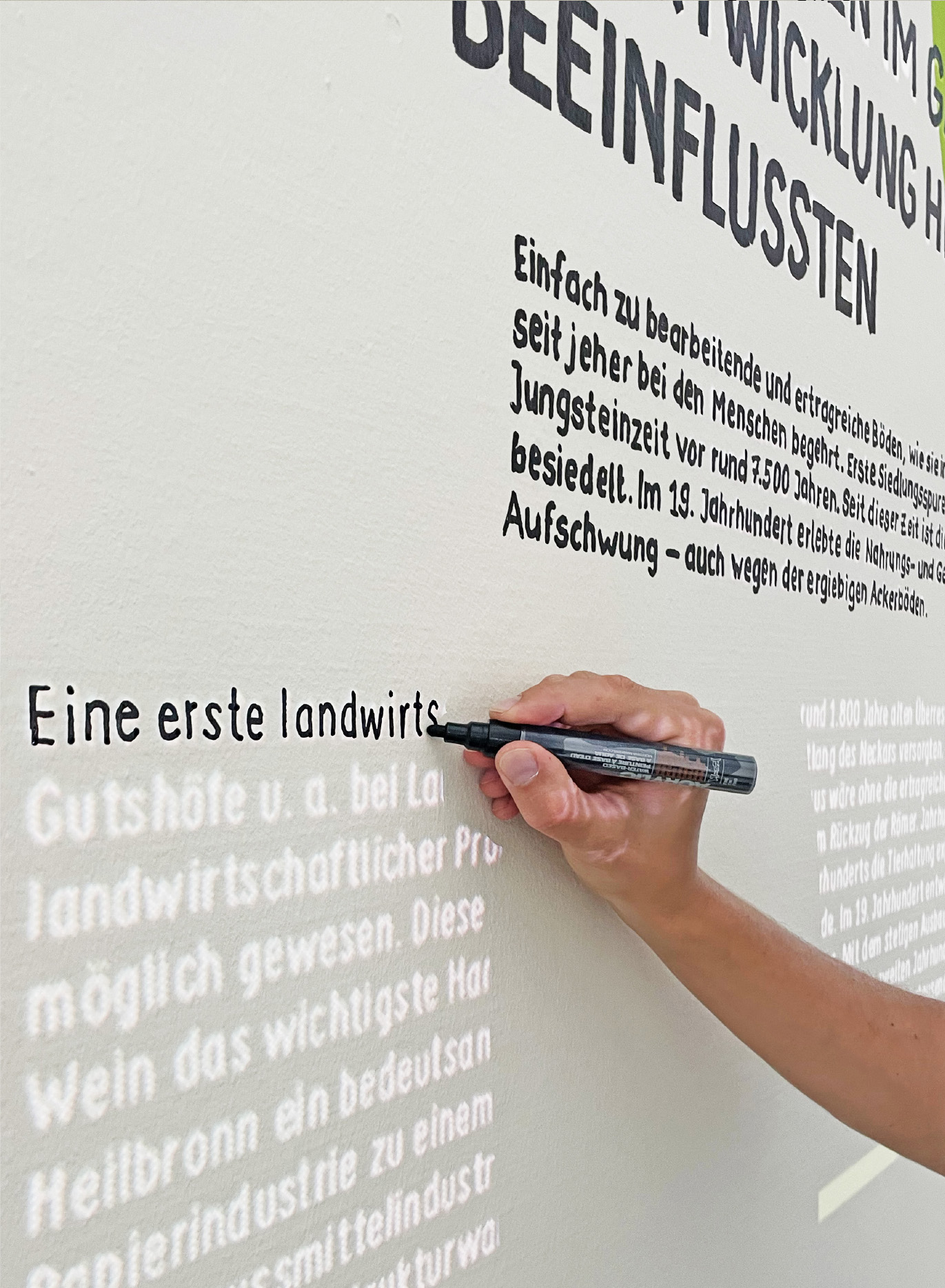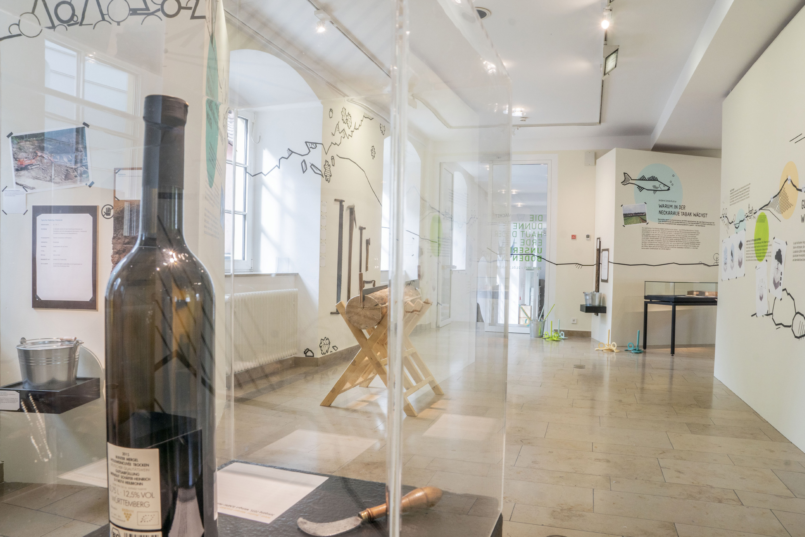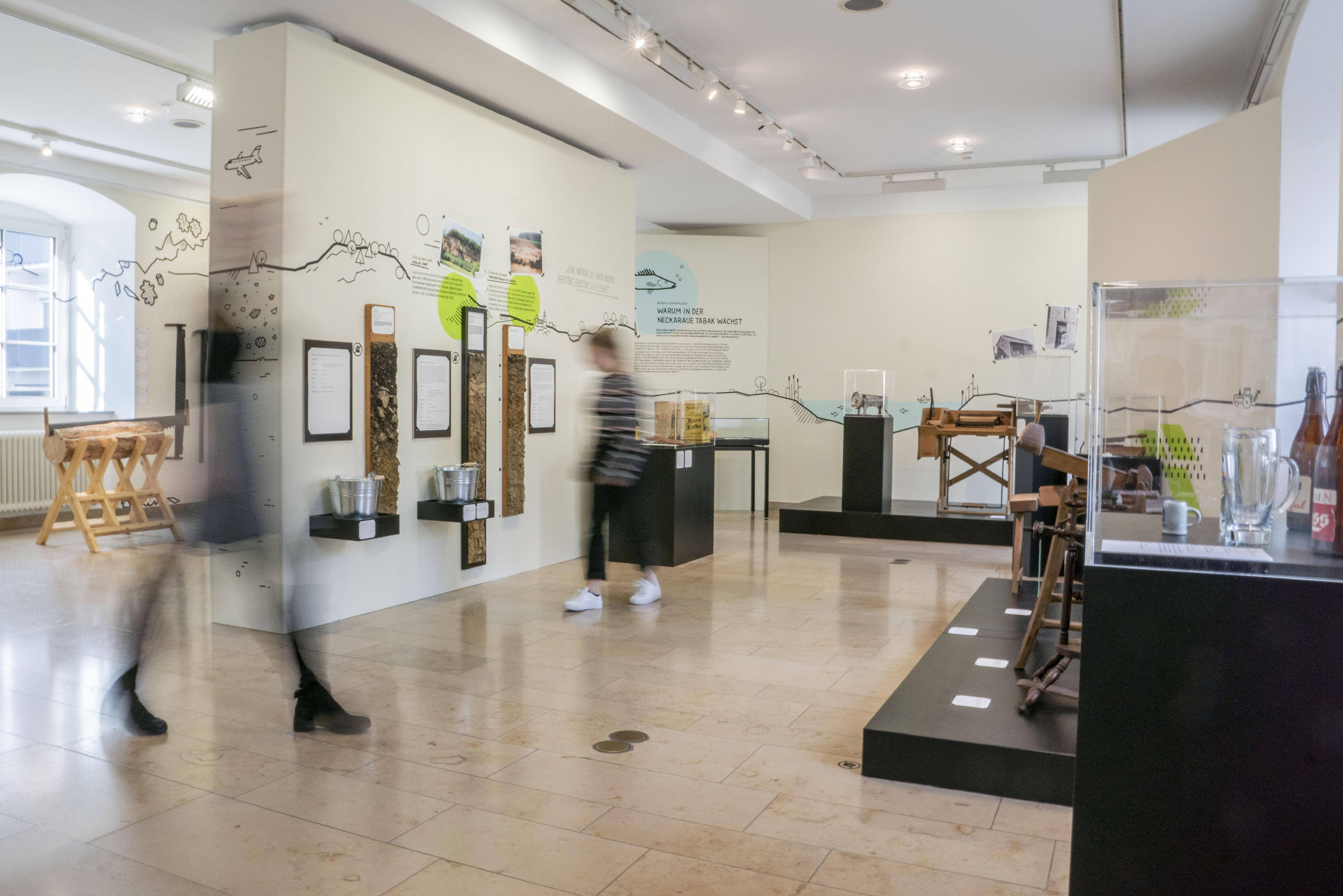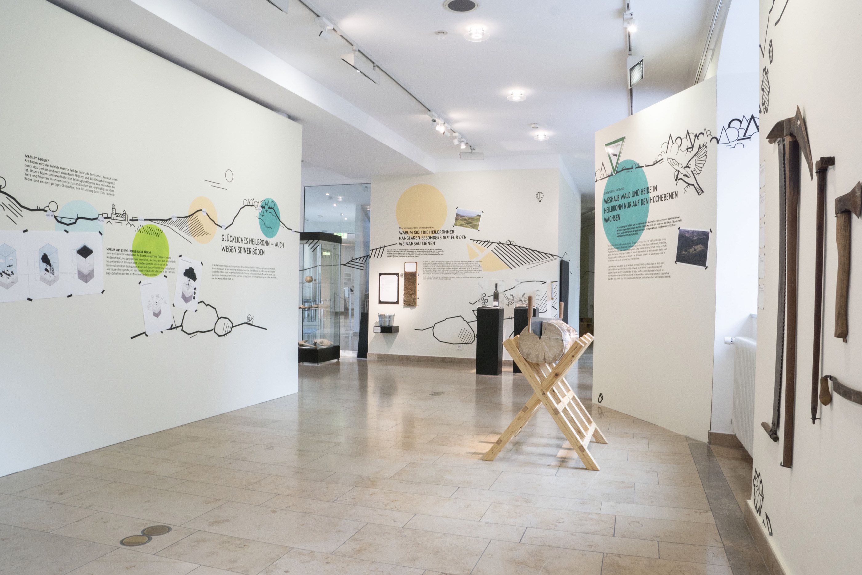 Auch die Heilbronner Böden werden vorgestellt — in einem nachhaltigen, ressourcenschonend konzipierten Ausstellungsbereich. Die linear angelegten Illustrationen wurden von gruppe sepia in der Technik der Tape Art realisiert, die Texte von Hand mit Acrylmarker direkt auf die Wände geschrieben. Die Ausstellung erhielt so einen ganz unverwechselbaren Look.