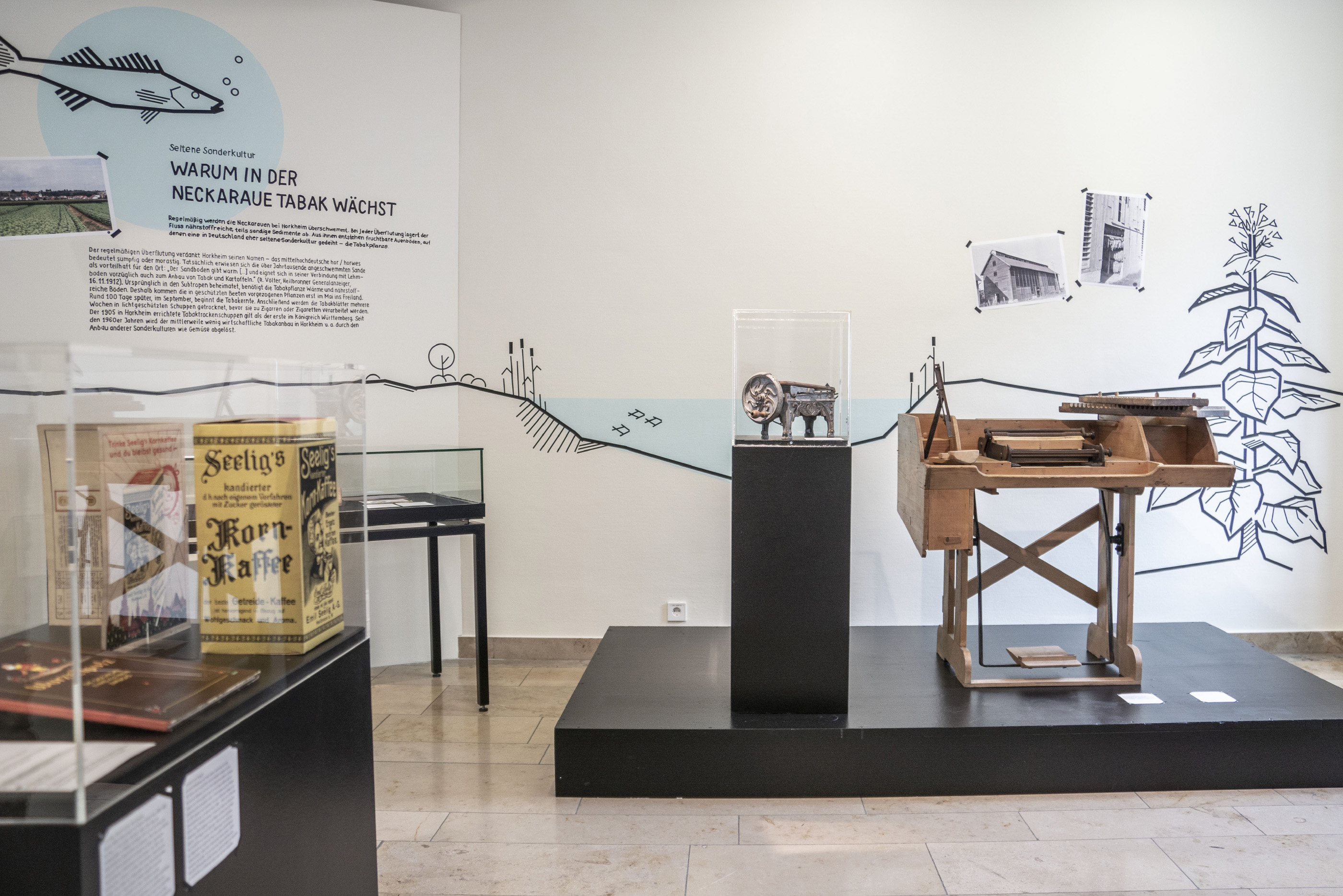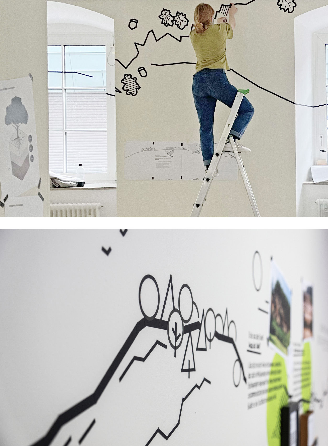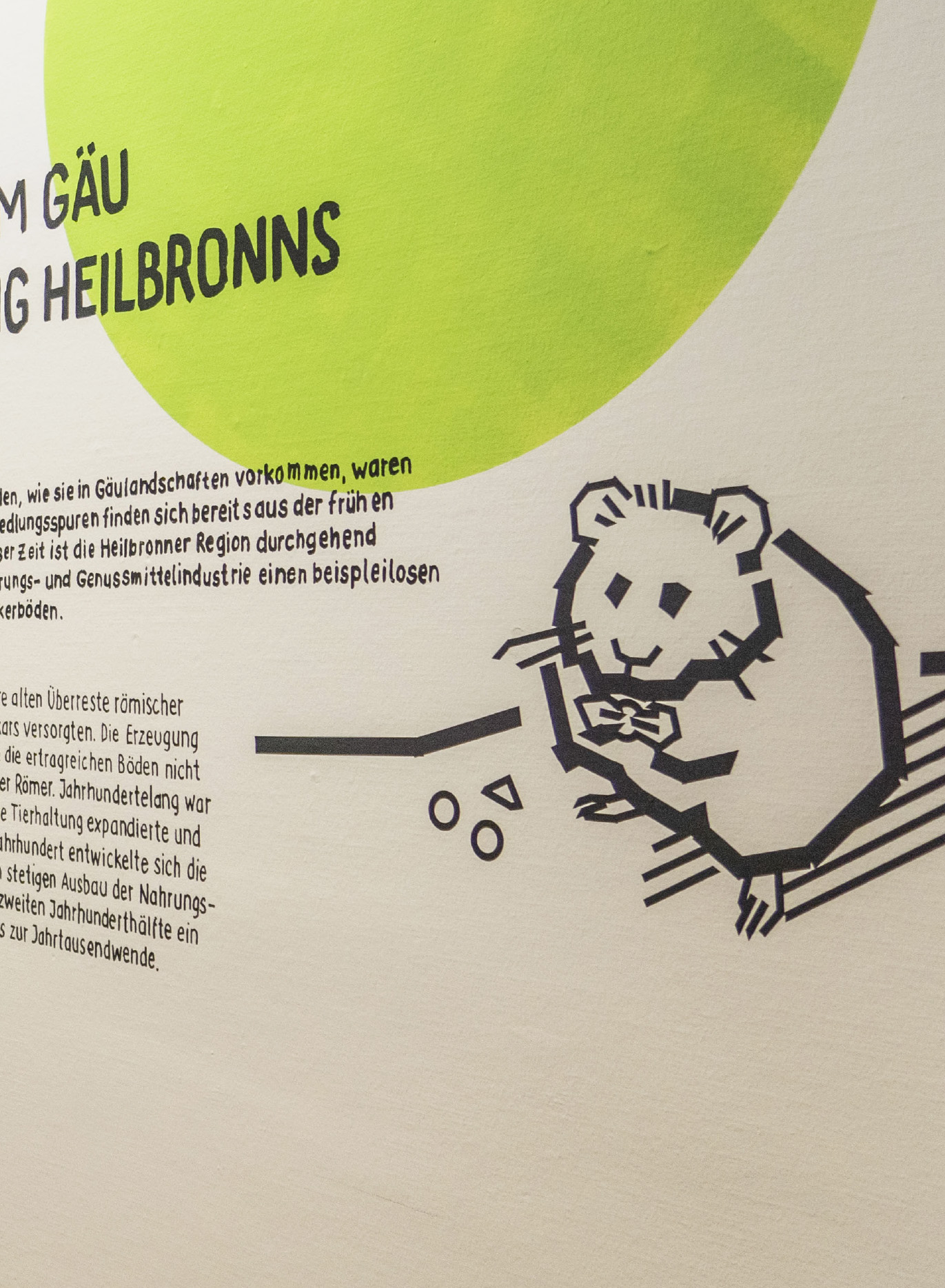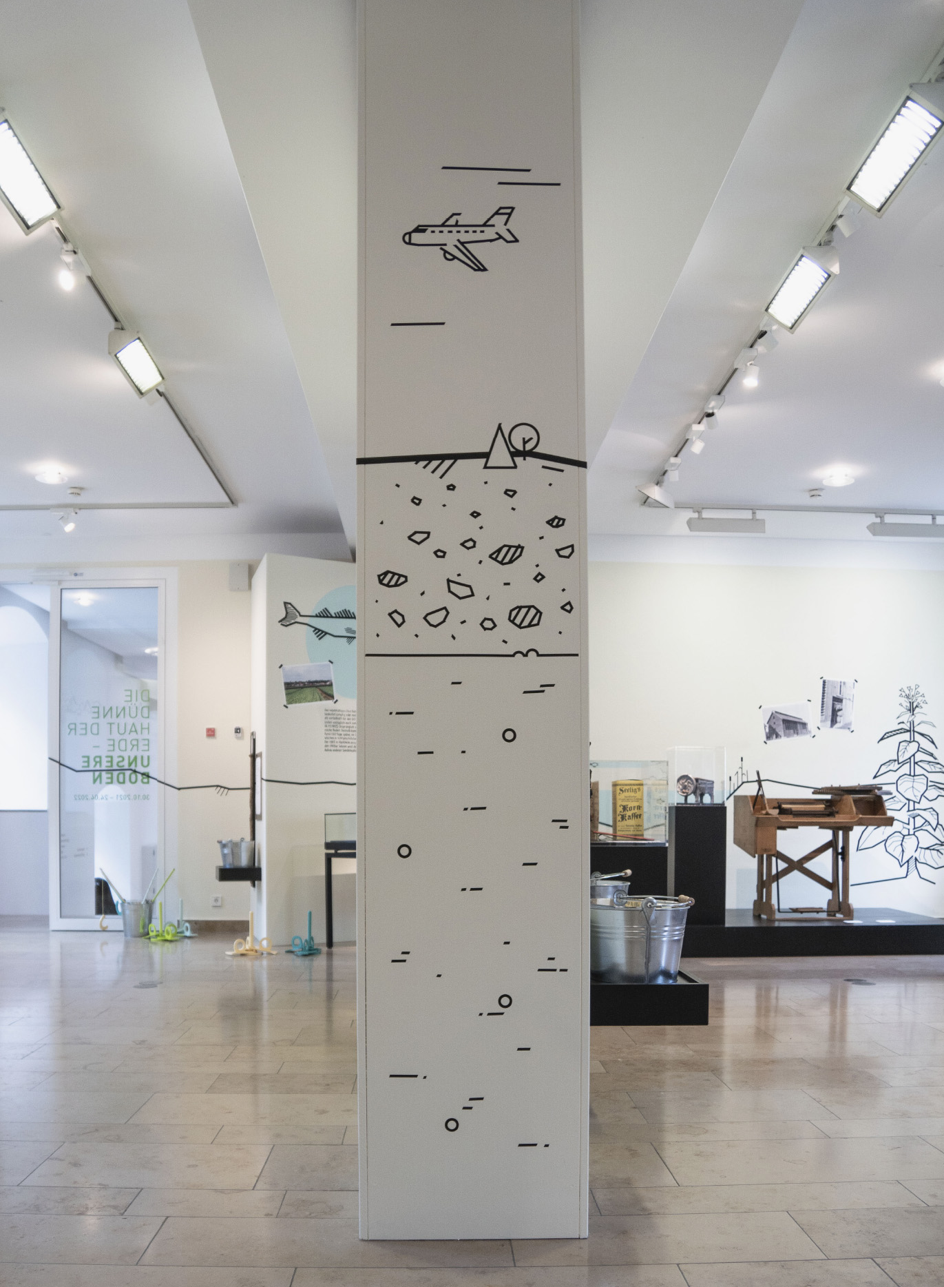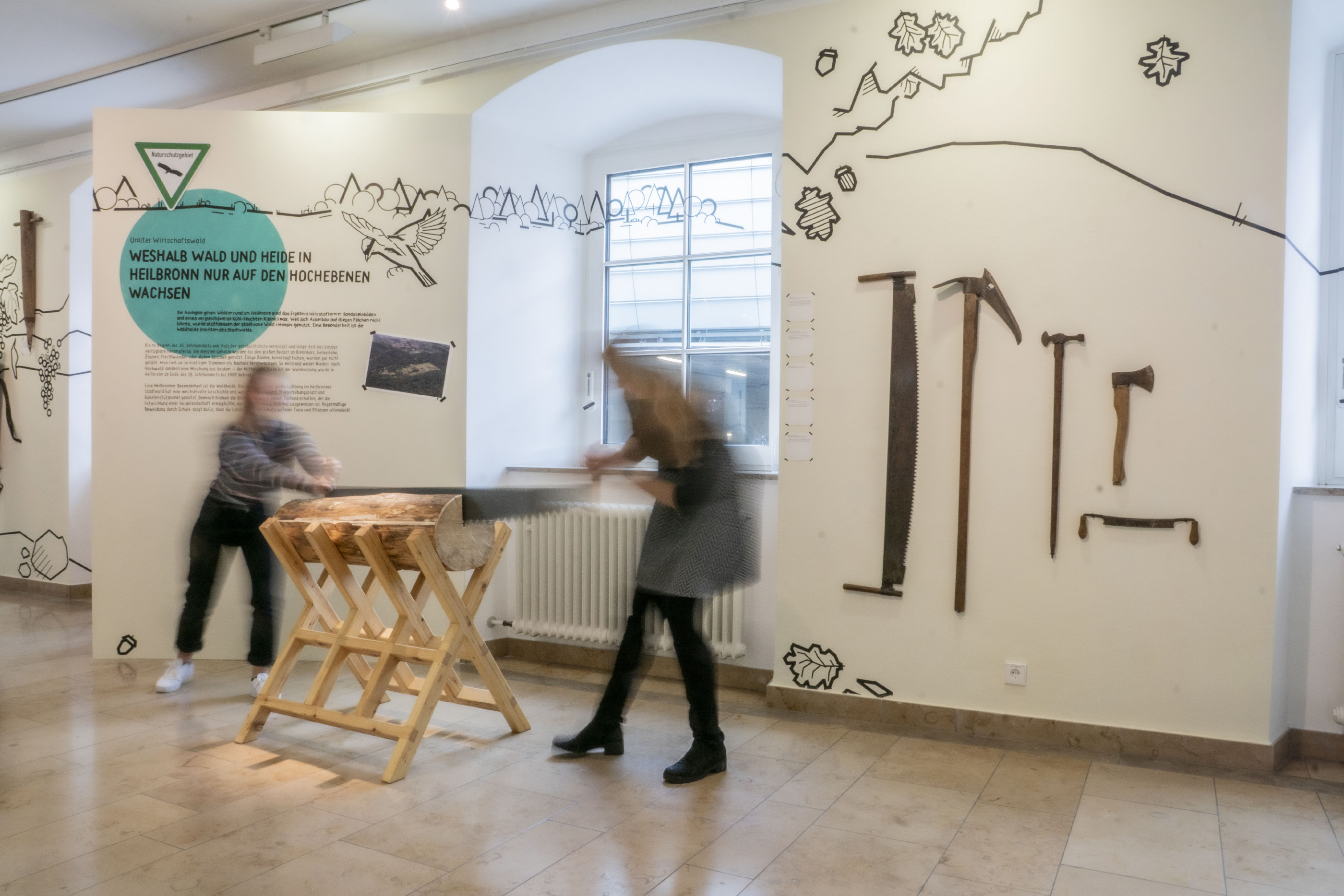 Auch die Heilbronner Böden werden vorgestellt — in einem nachhaltigen, ressourcenschonend konzipierten Ausstellungsbereich. Die linear angelegten Illustrationen wurden von gruppe sepia in der Technik der Tape Art realisiert, die Texte von Hand mit Acrylmarker direkt auf die Wände geschrieben. Die Ausstellung erhielt so einen ganz unverwechselbaren Look.