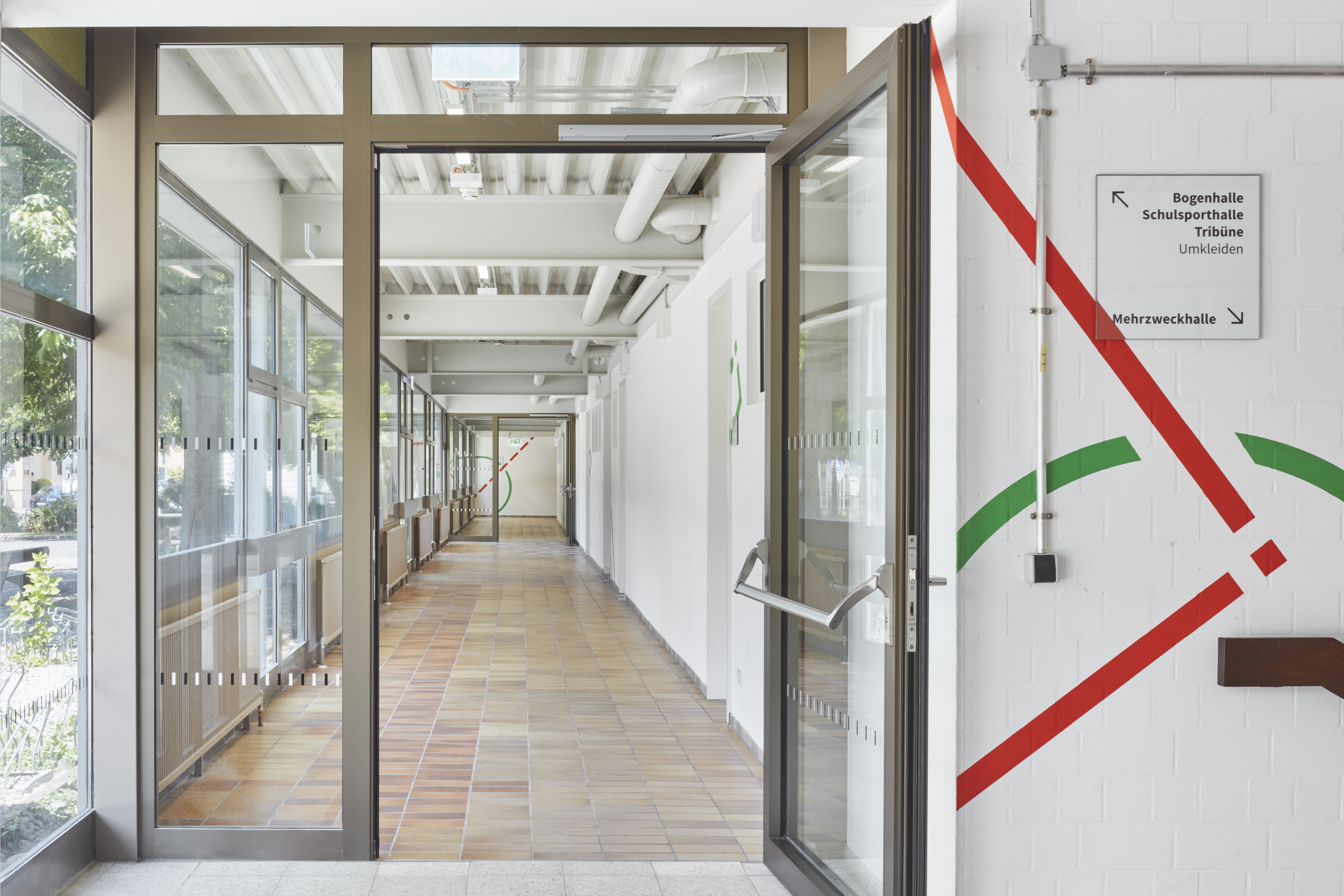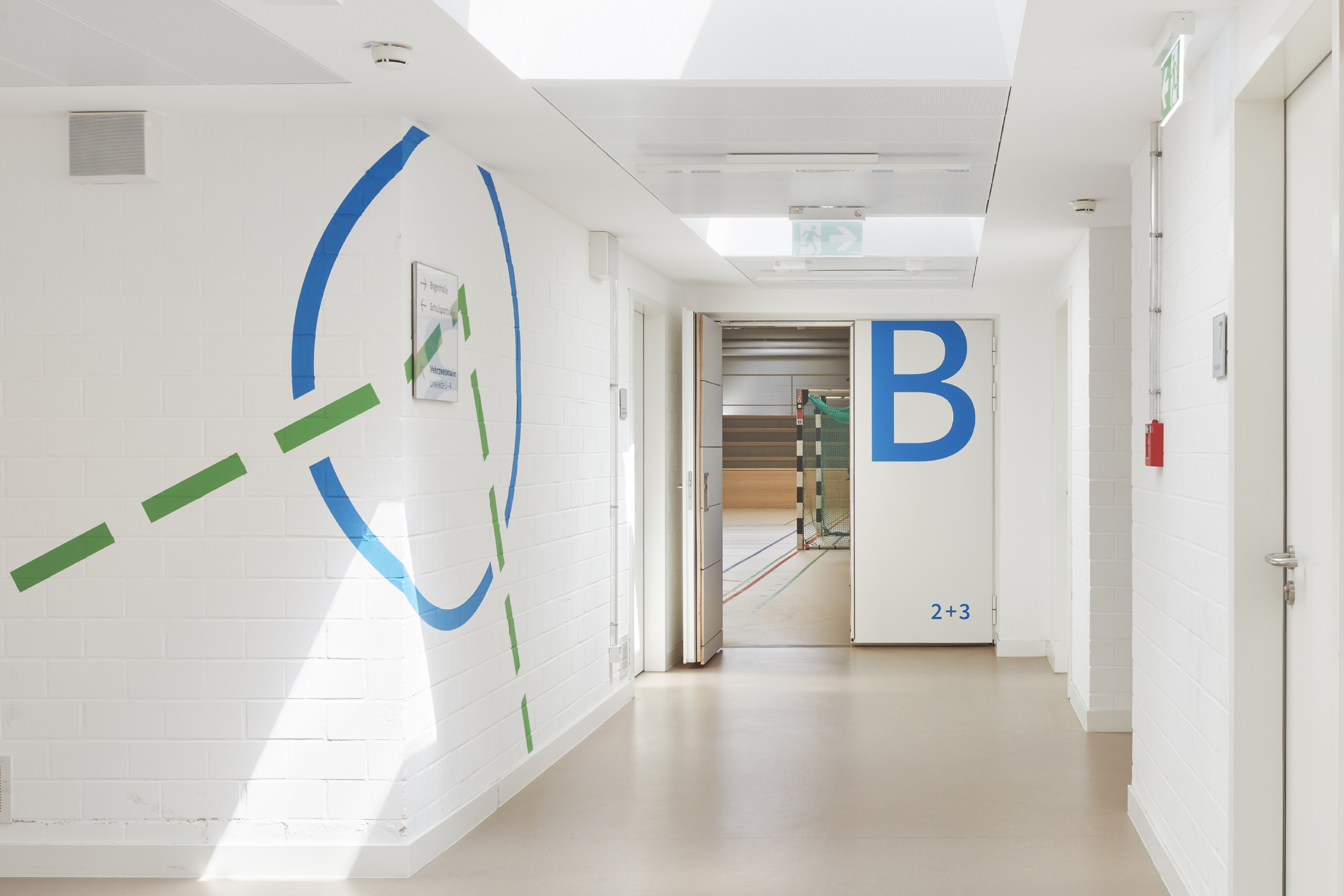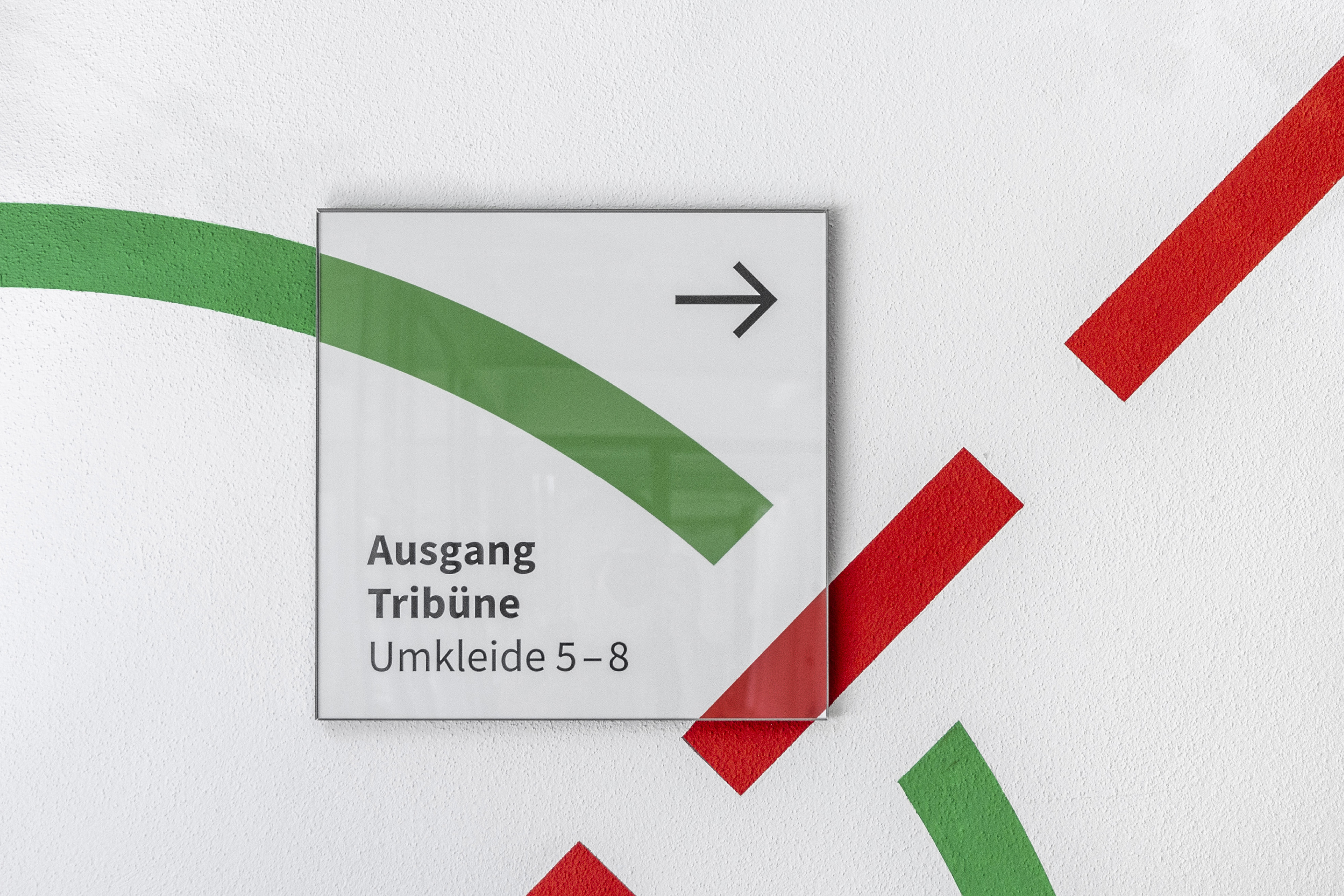 Rot, Blau und Grün für den Sport: Das durch gruppe sepia entwickelte grafische Konzept für die frisch sanierte Mönchseehalle in Heilbronn bringt ein geometrisches Regularium spannend auf die Wände, bezieht die Leitelemente in Form quadratischer Tafeln mit ein und schafft Klarheit, Leichtigkeit — und nicht zuletzt Orientierung.