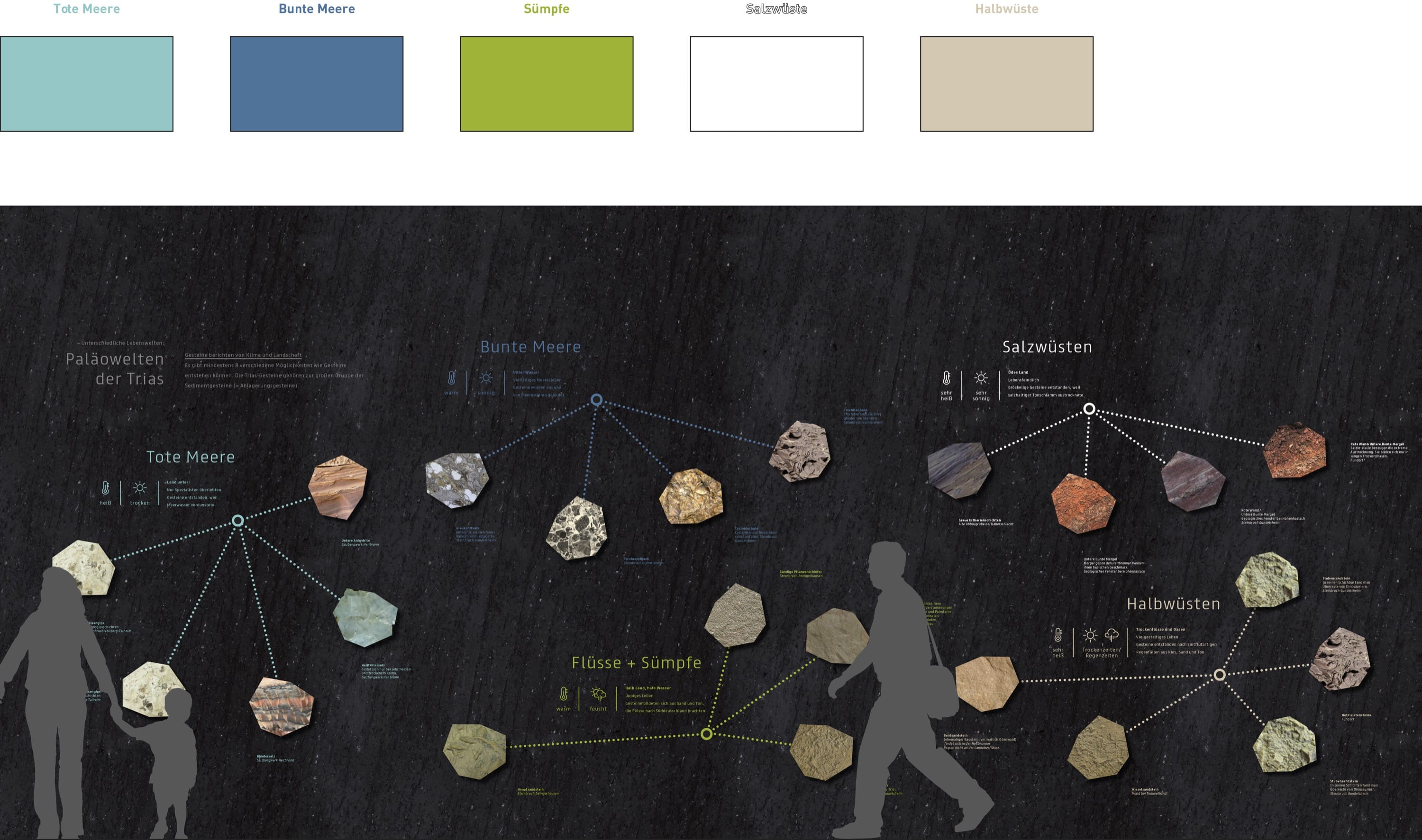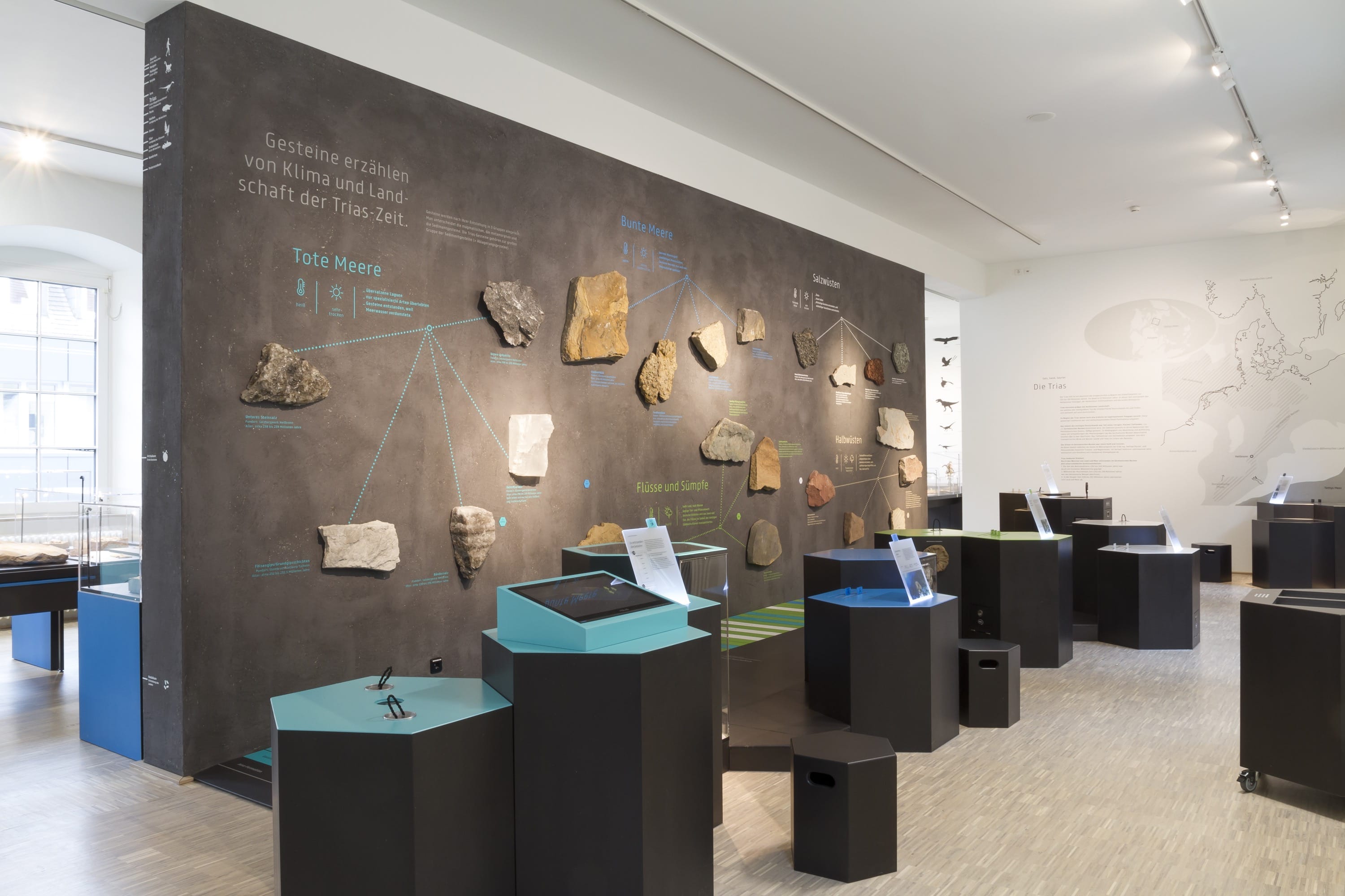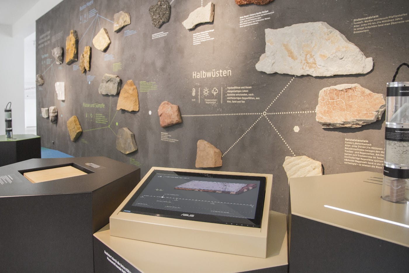 Eine Steinwand als zentrales Element der Ausstellungskonzeption mit den charakteristischen Gesteinen der Heilbronner Region macht die vielfältige Geologie begreiflich und erzählt von Klima und Landschaften der Trias-Zeit: riesige Sumpflandschaften, lebensfeindliche Salzwüsten, subtropische Meere voller Leben oder tote Lagunen.
