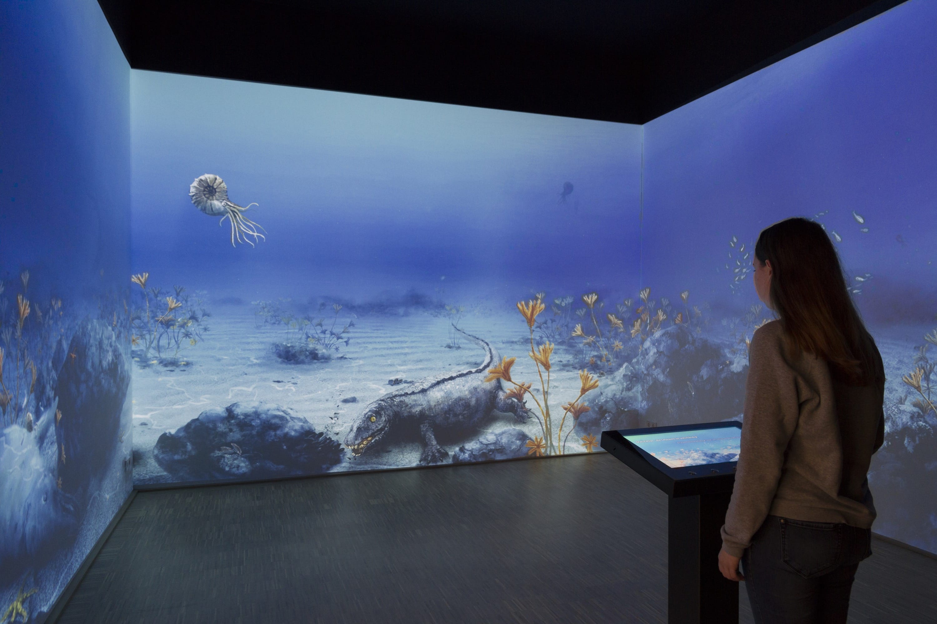 Die uralten Lebewelten der Trias-Zeit können Besucher virtuell und interaktiv selbst gestalten. Mitmachstationen sowie eine kleine „Forschertour“ für Kinder ergänzen das praktische Angebot, dessen museale Vermittlung sich allen Generationen erschließt.