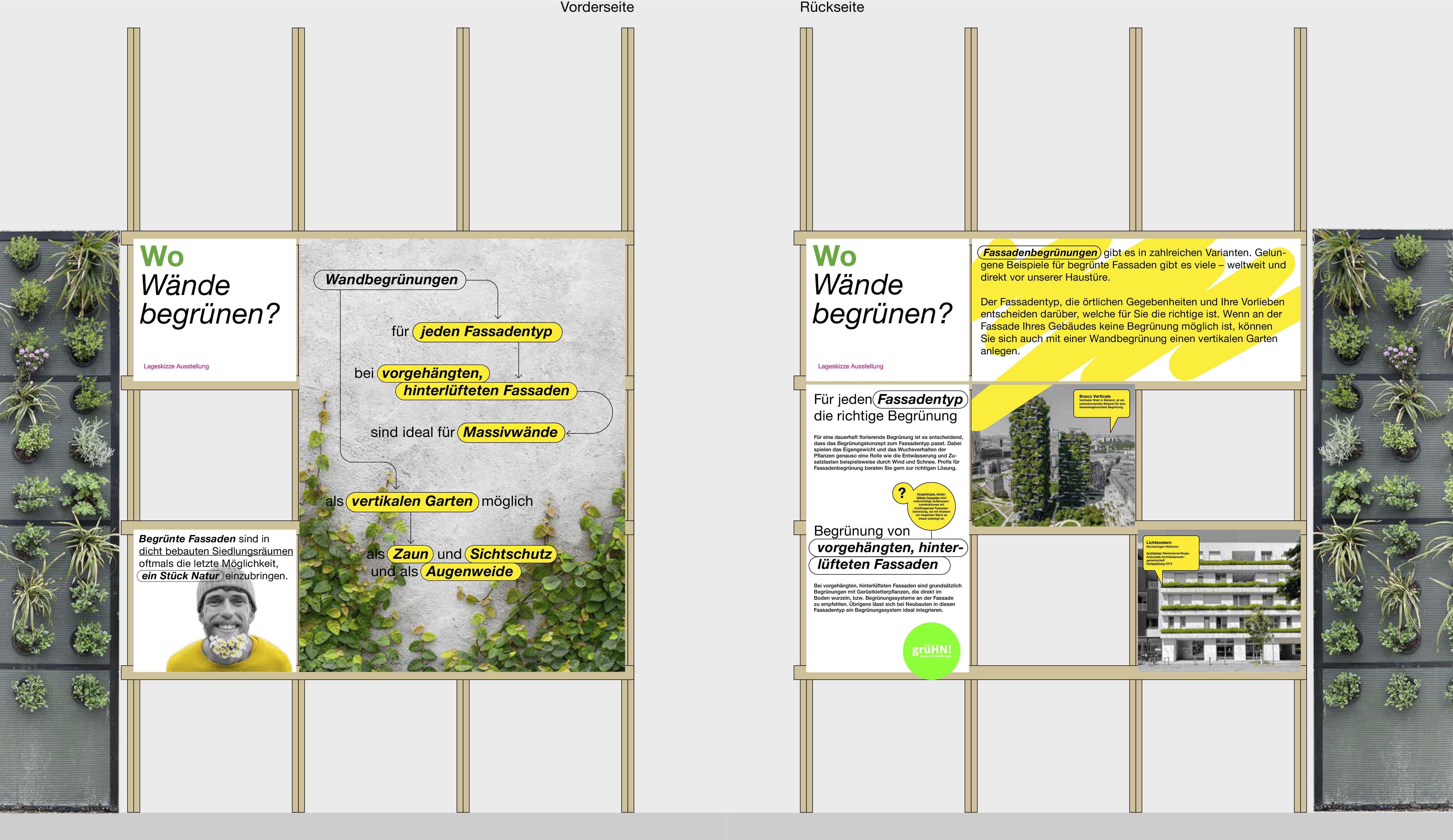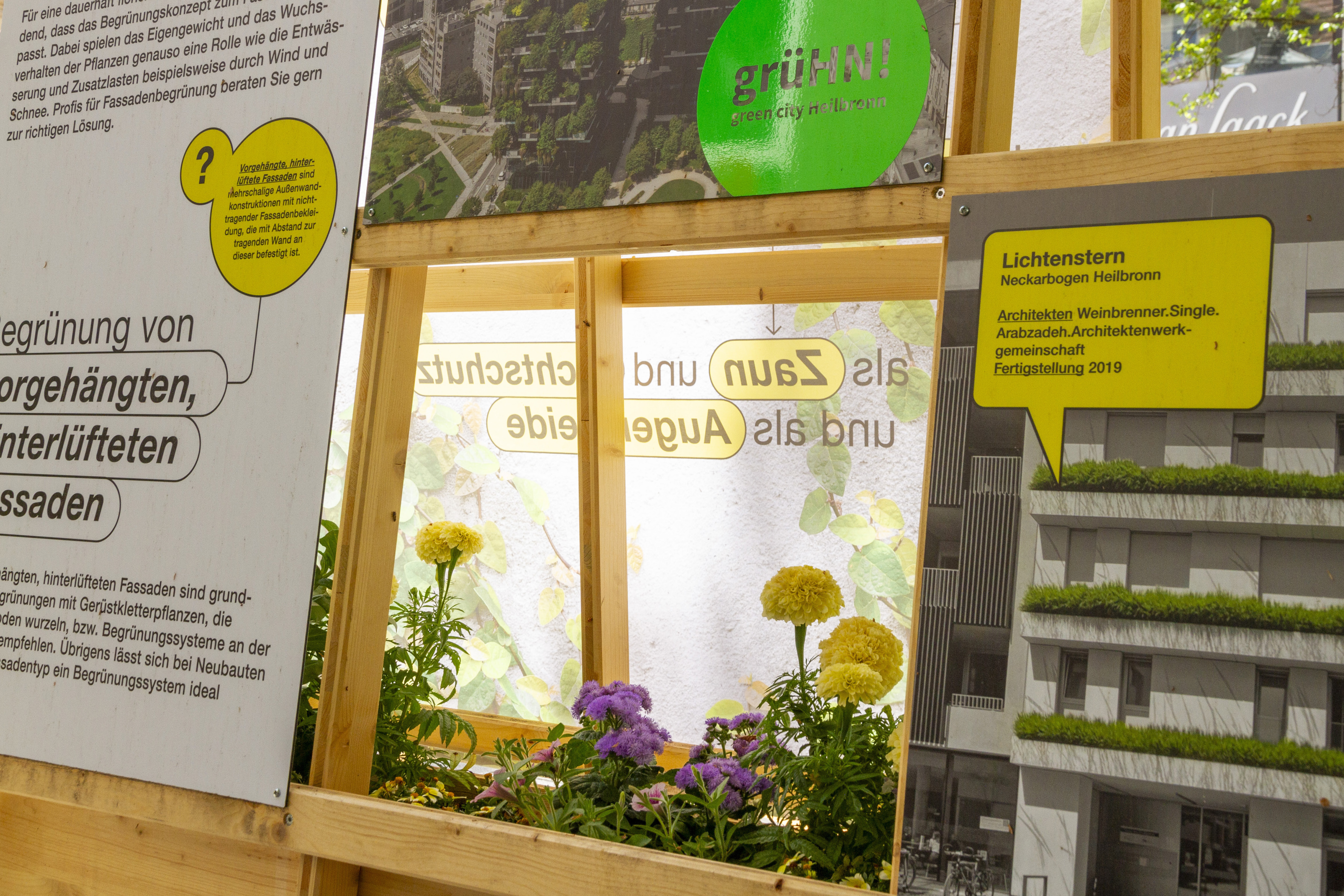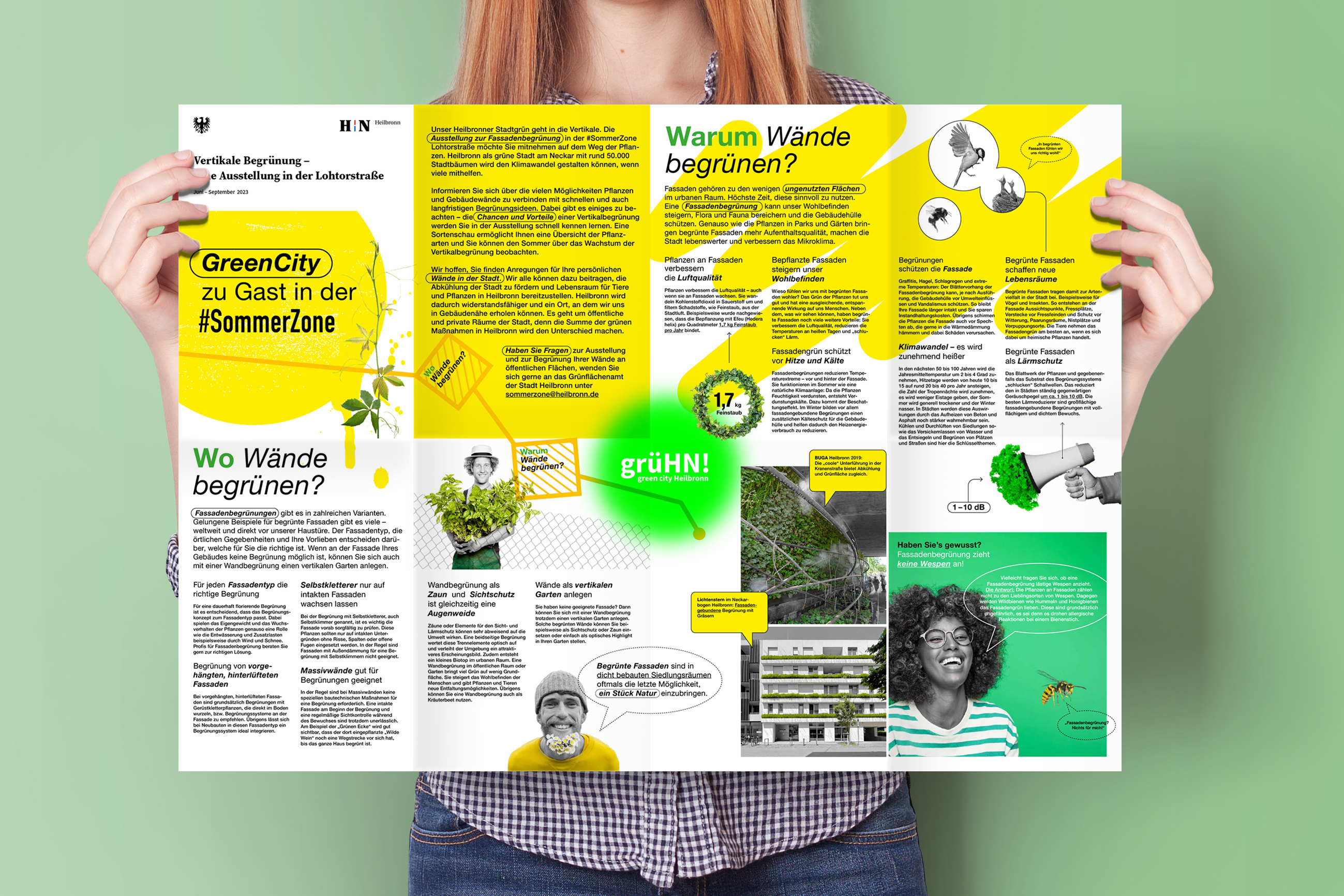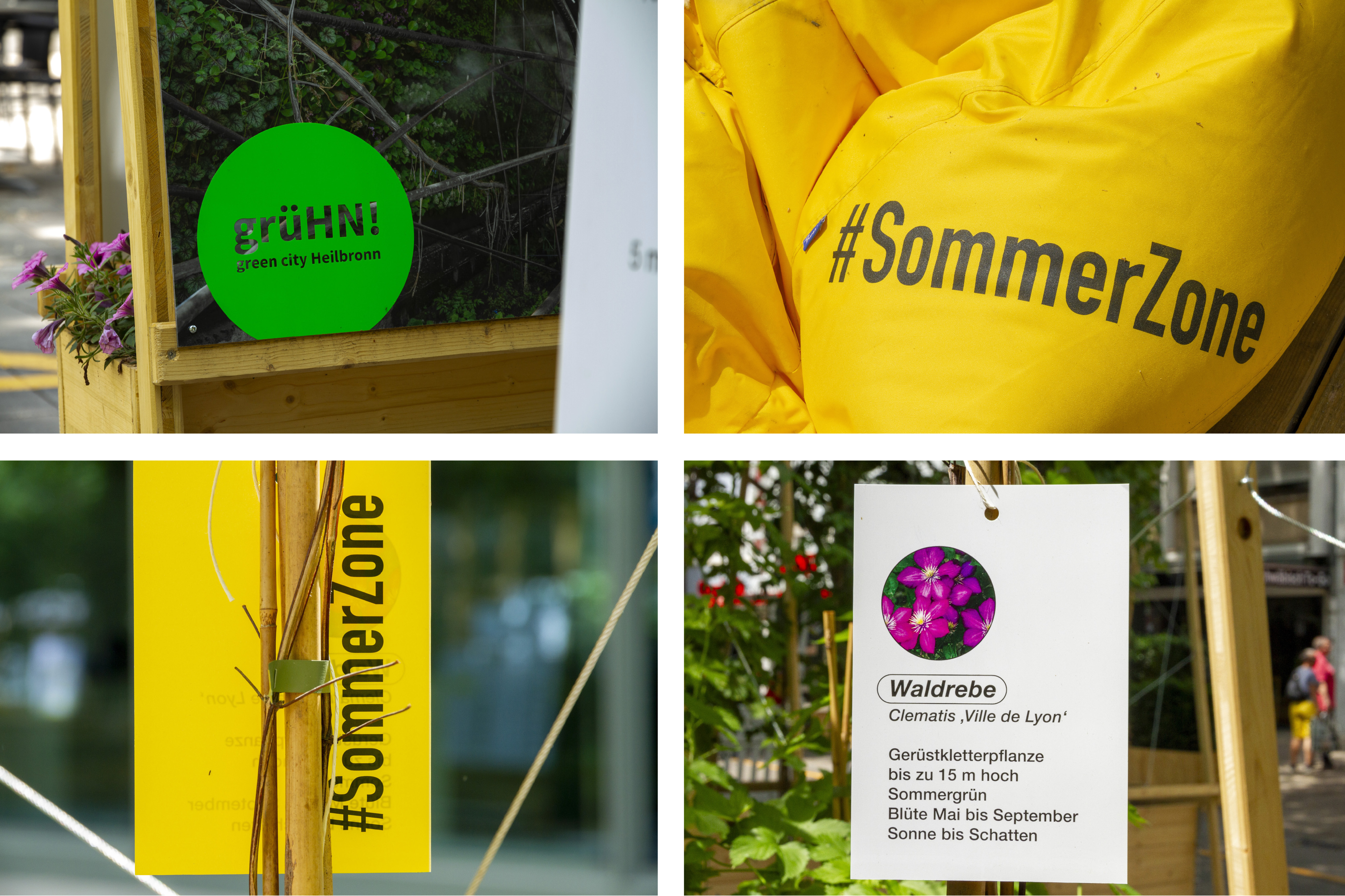 Summer in the City! Im Jahr 2023 zieht die #SommerZone in die Lohtorstraße und bietet neben schattigen Erholungsräumen auch einen motivierenden Exkurs zum Thema Wandbegrünung. Eine Vielzahl an Gehölzen, Kletterpflanzen und Stauden laden ein zum Schauen, Anfassen, Erleben. Durch die Ausstellung leitet die Farbe Gelb und ein leuchtend-grüner Spot steht für die Idee der „Green City“. Zur Realisierung des Projekts ging das Grünflächenamt der Stadt Heilbronn eine enge Kooperation mit gruppe sepia ein: Das Büro zeichnet verantwortlich für Konzept und Ausstellungsmodule, für Grafik, Text und Branding.