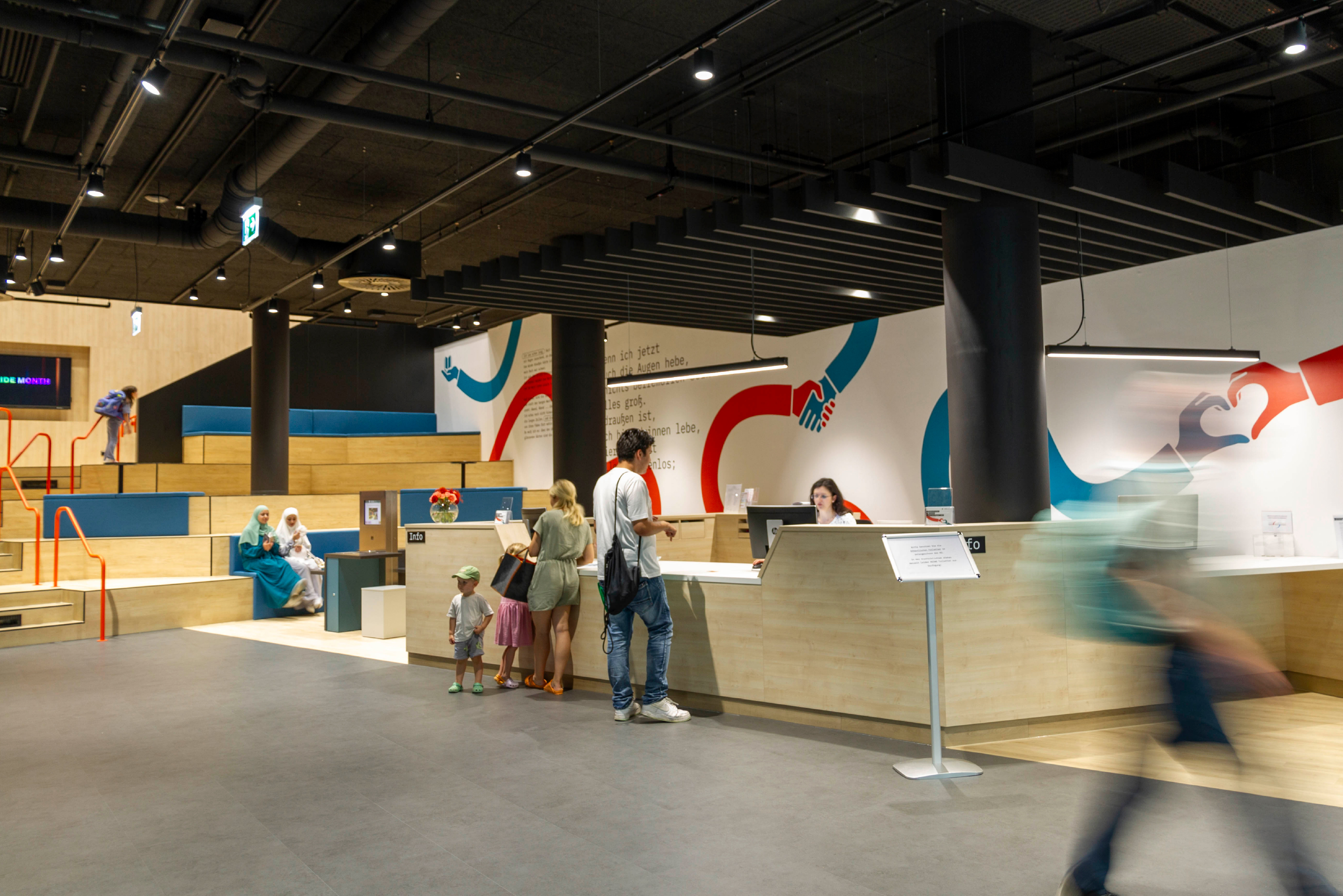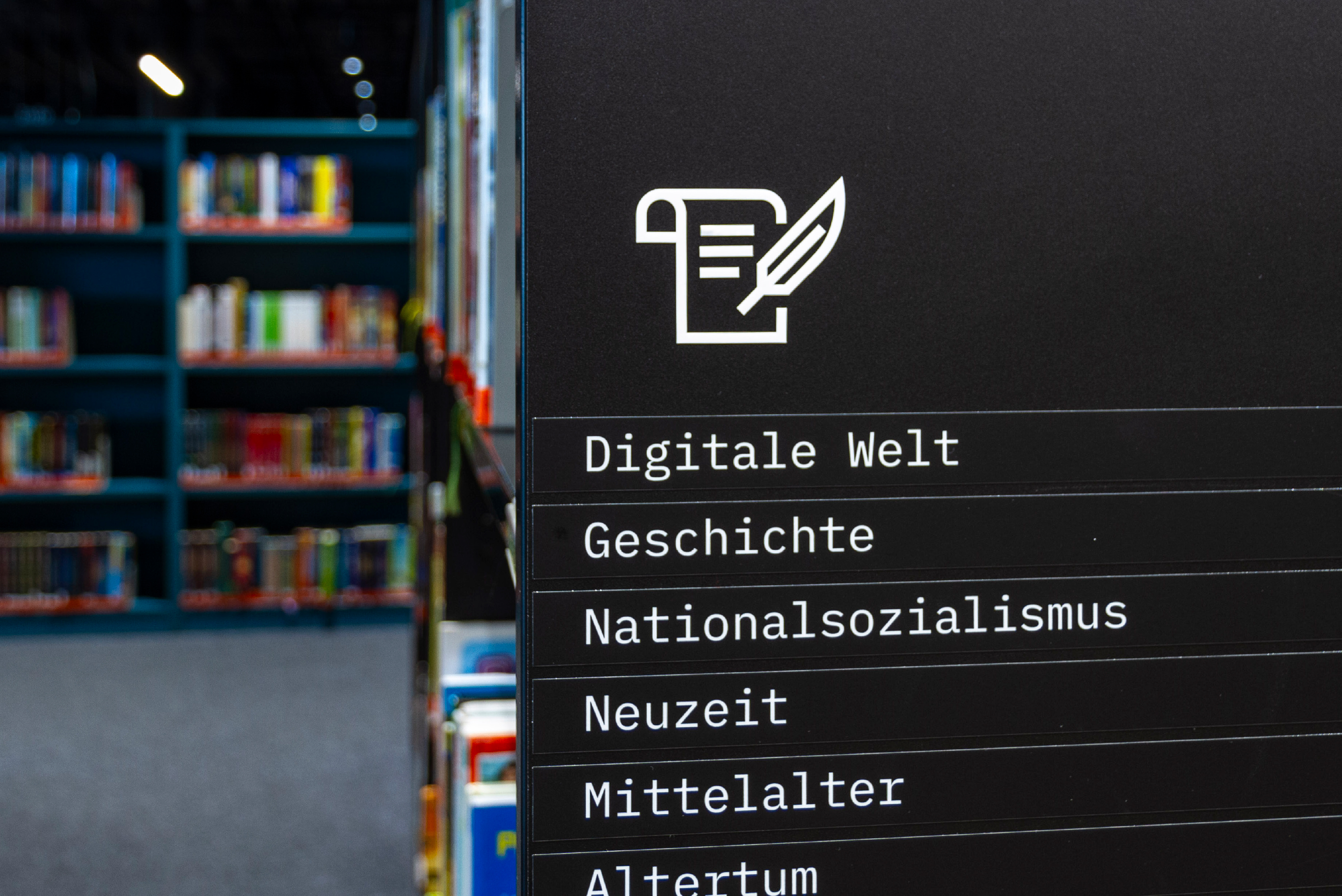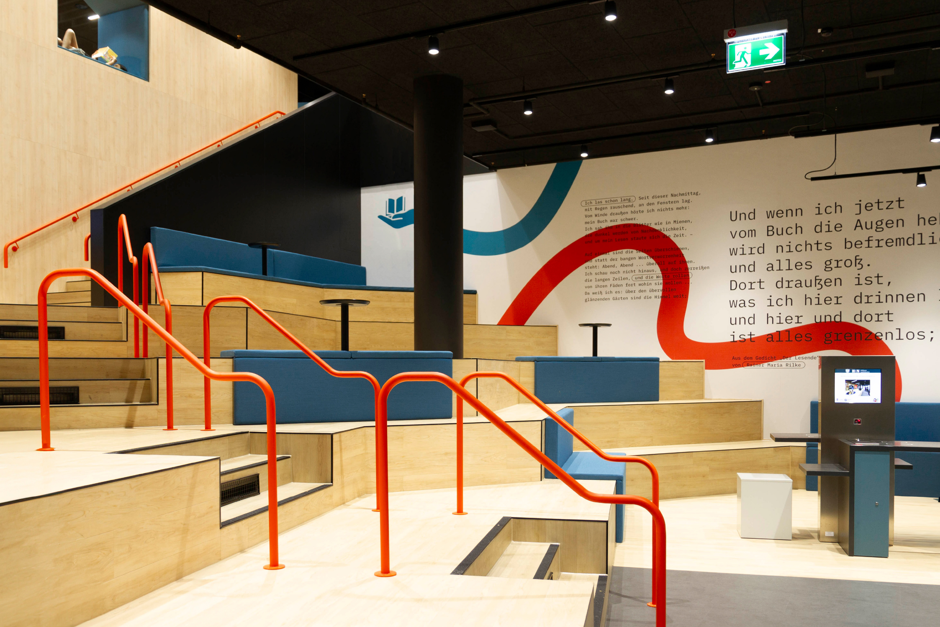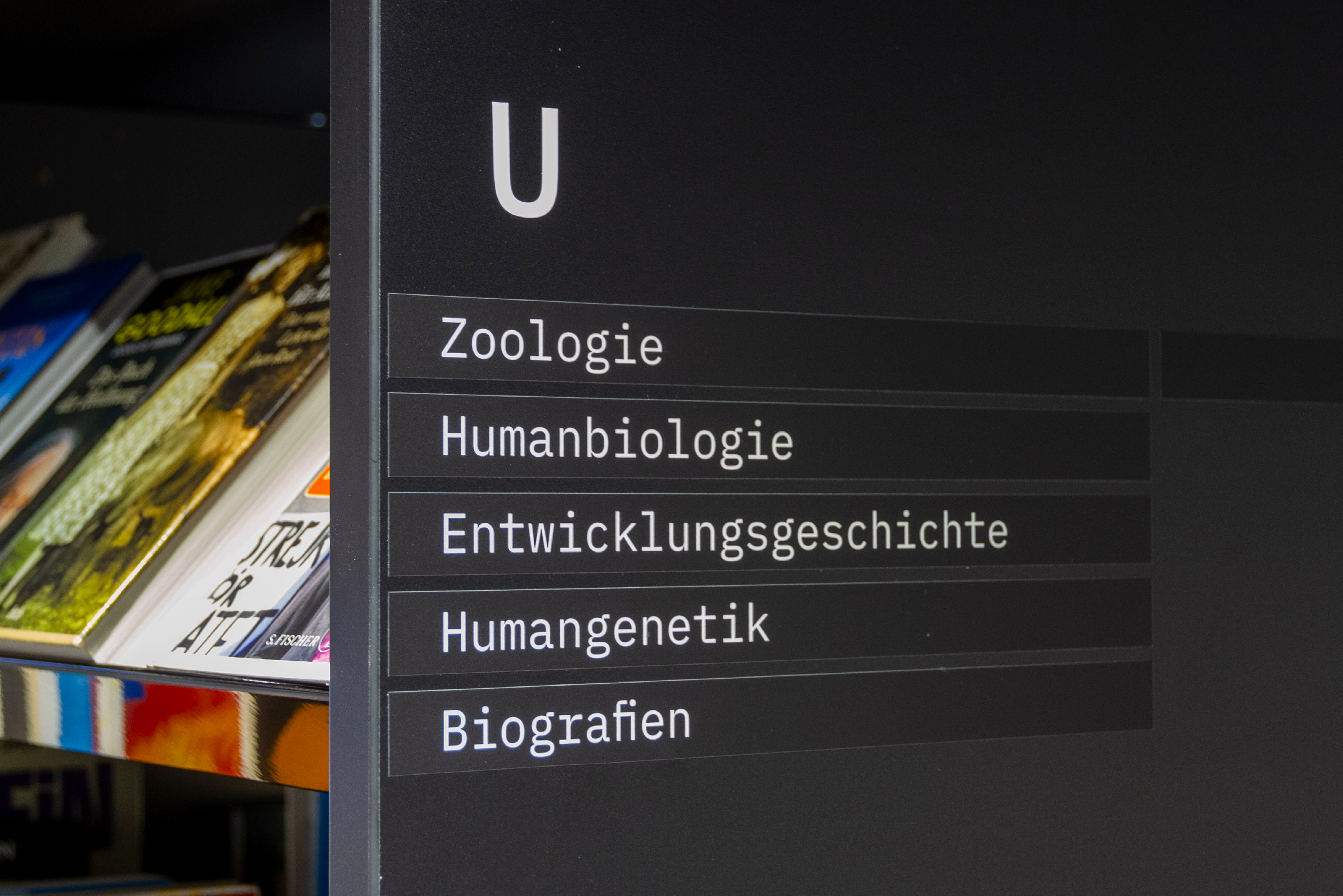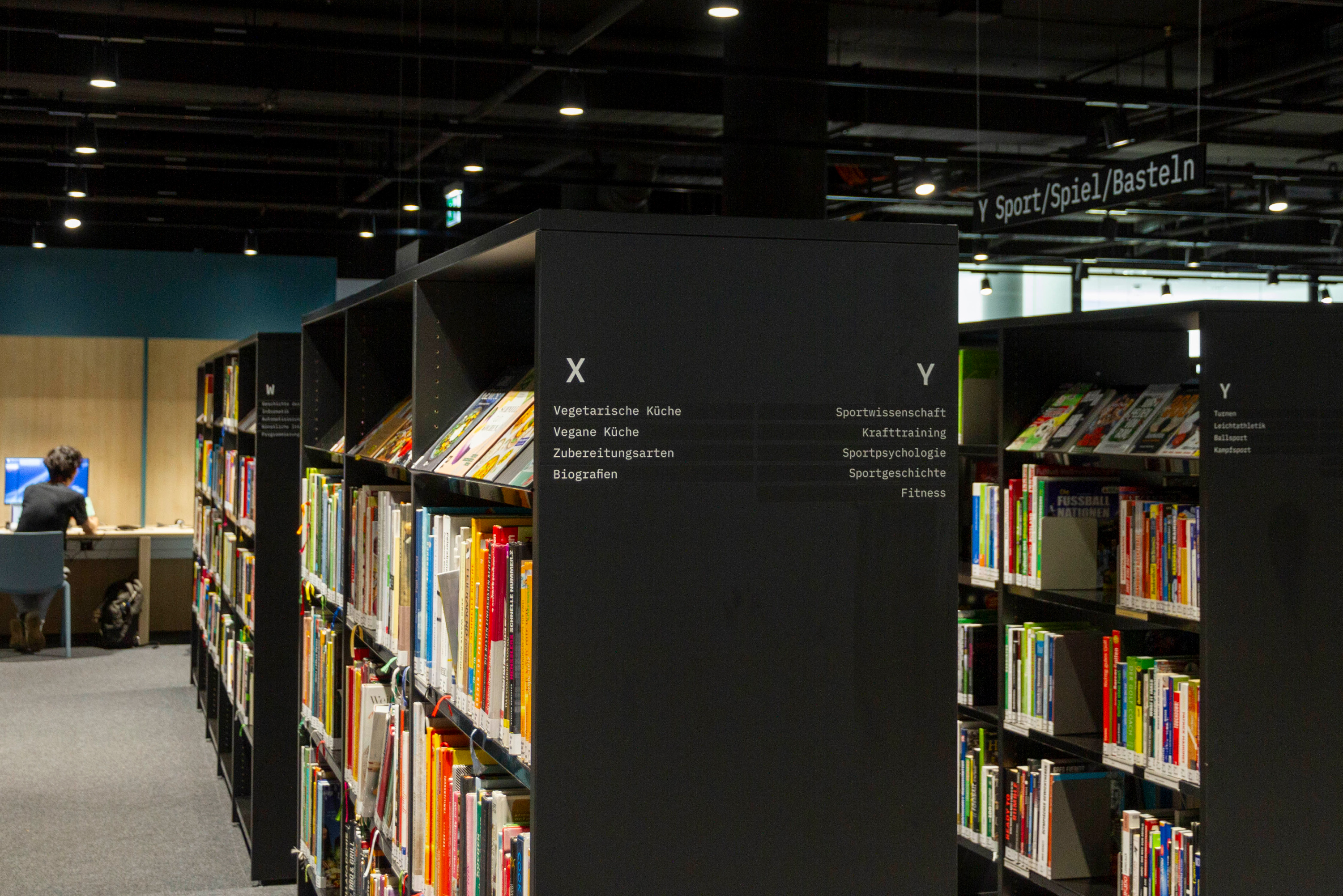 Nach einer grundlegenden, zwei Jahre währenden Sanierung präsentiert sich die Stadtbibliothek Heilbronn außen und innen in neuem Kleid. Zentrale und komplexe Aufgabenstellung für gruppe sepia war die Modernisierung des Leitkonzepts — in enger Zusammenarbeit mit dem Team der Stadtbibliothek. Eine „monospaced“ Type (Stil: Schreibmaschine) dominiert nun das Schriftbild. Größte Aufmerksamkeut galt der Funktionalität des Orientierungsplans anhand dessen Besuchende sich im Labyrinth von Gängen und Regalen leichten Zugang zu über 200.000 Medien verschaffen können. Einprägsam und dazu passend zieren Fenster und Wände schlangenartig sich windende Arme und Hände.