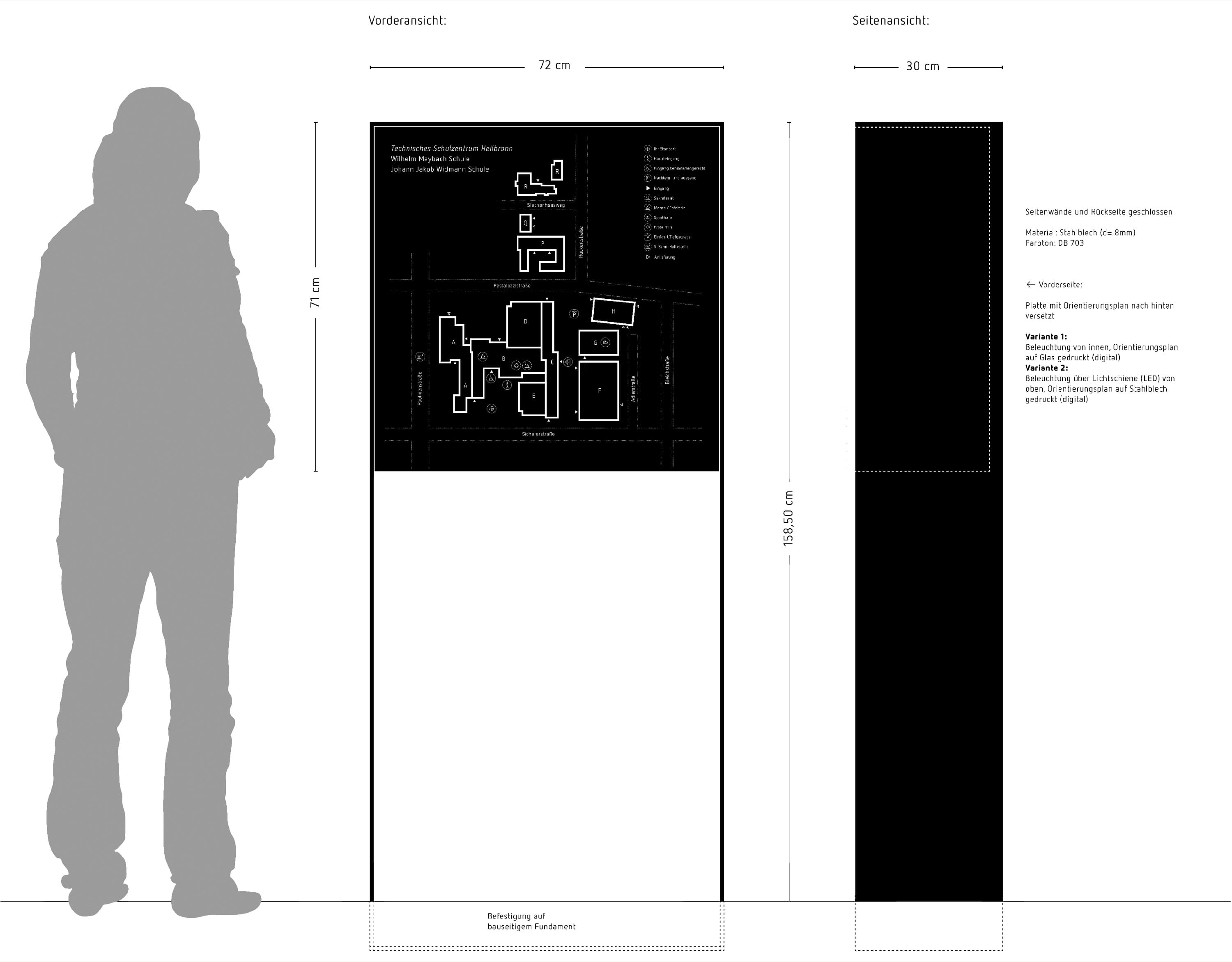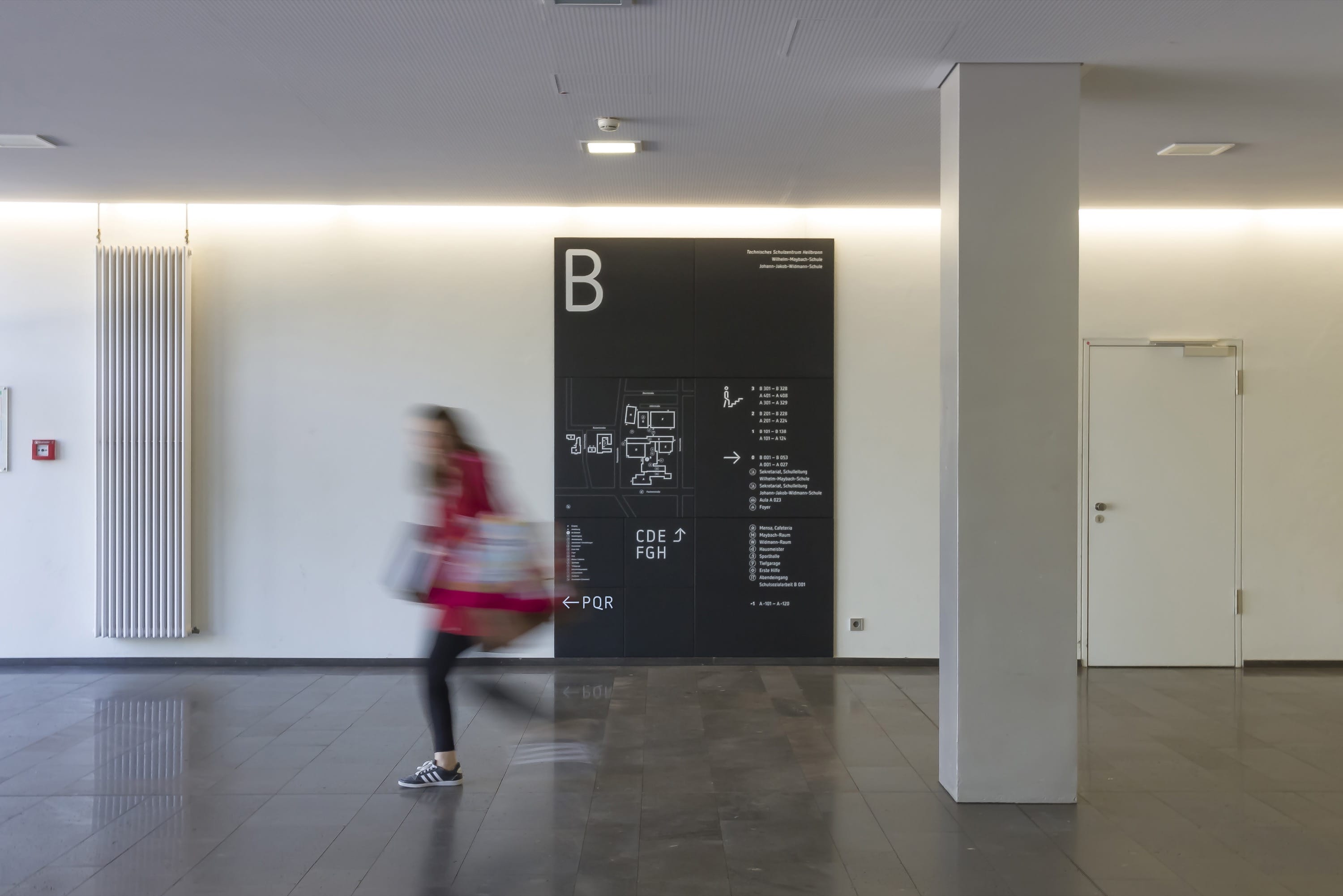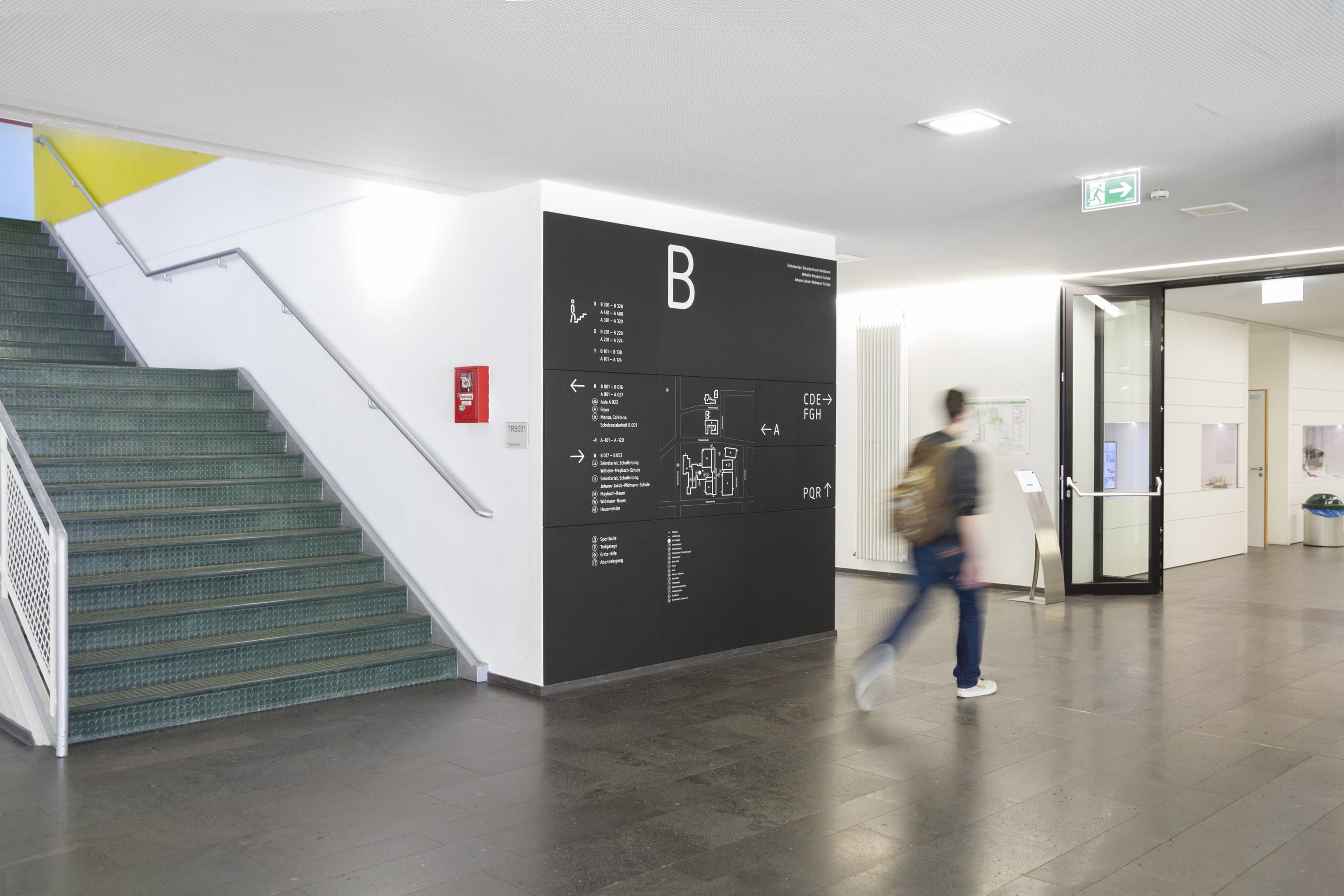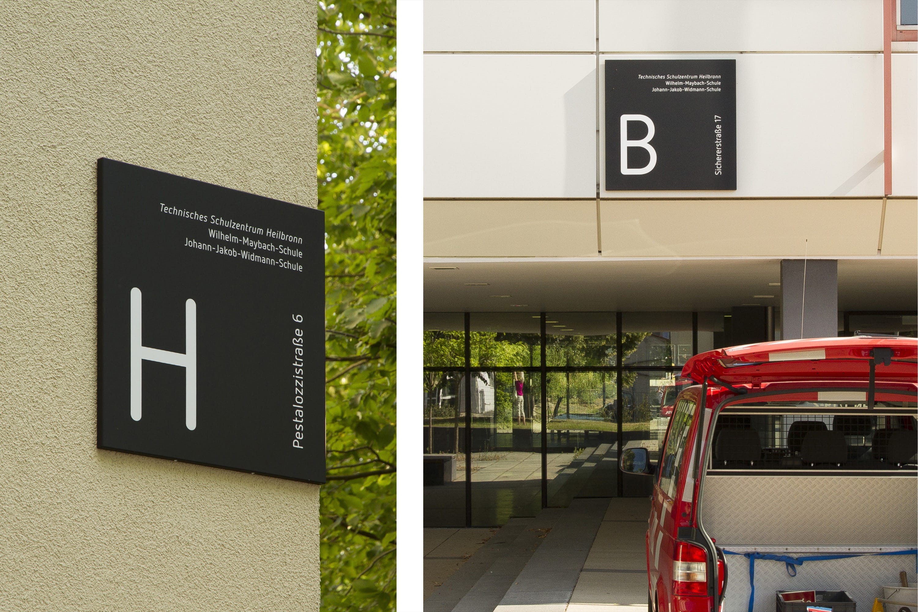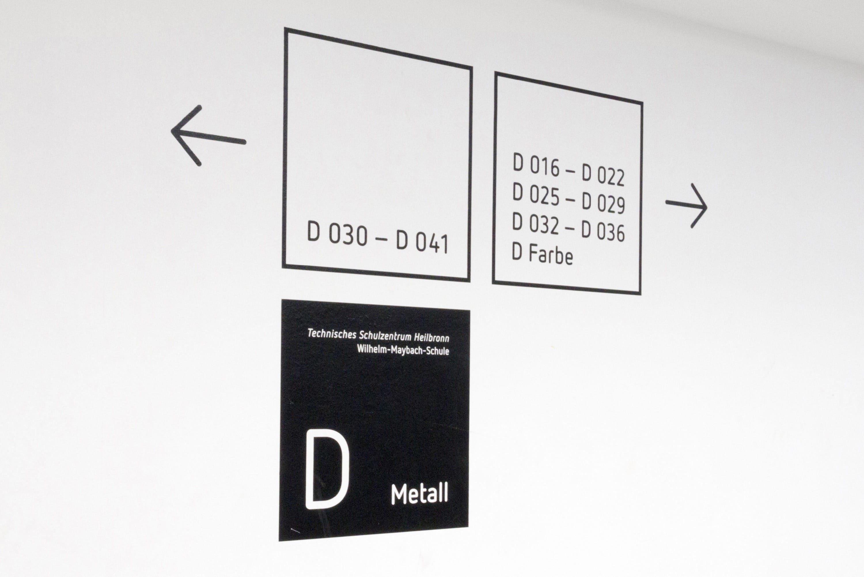 LeitsystemÜber 5000 Schüler werden am Technischen Schulzentrum Heilbronn – bestehend aus der Wilhelm-Maybach-Schule und der Johann-Jakob-Widmann-Schule — unterrichtet. An das Konzept eines durchgängigen Leitsystems für den Innen- und Außenbereich des zwölf Gebäude umfassenden Ensembles waren komplexe Anforderungen gestellt. Ein ganzheitlicher Ansatz, ebenso wie spezielle Einzellösungen, wurden notwendig.