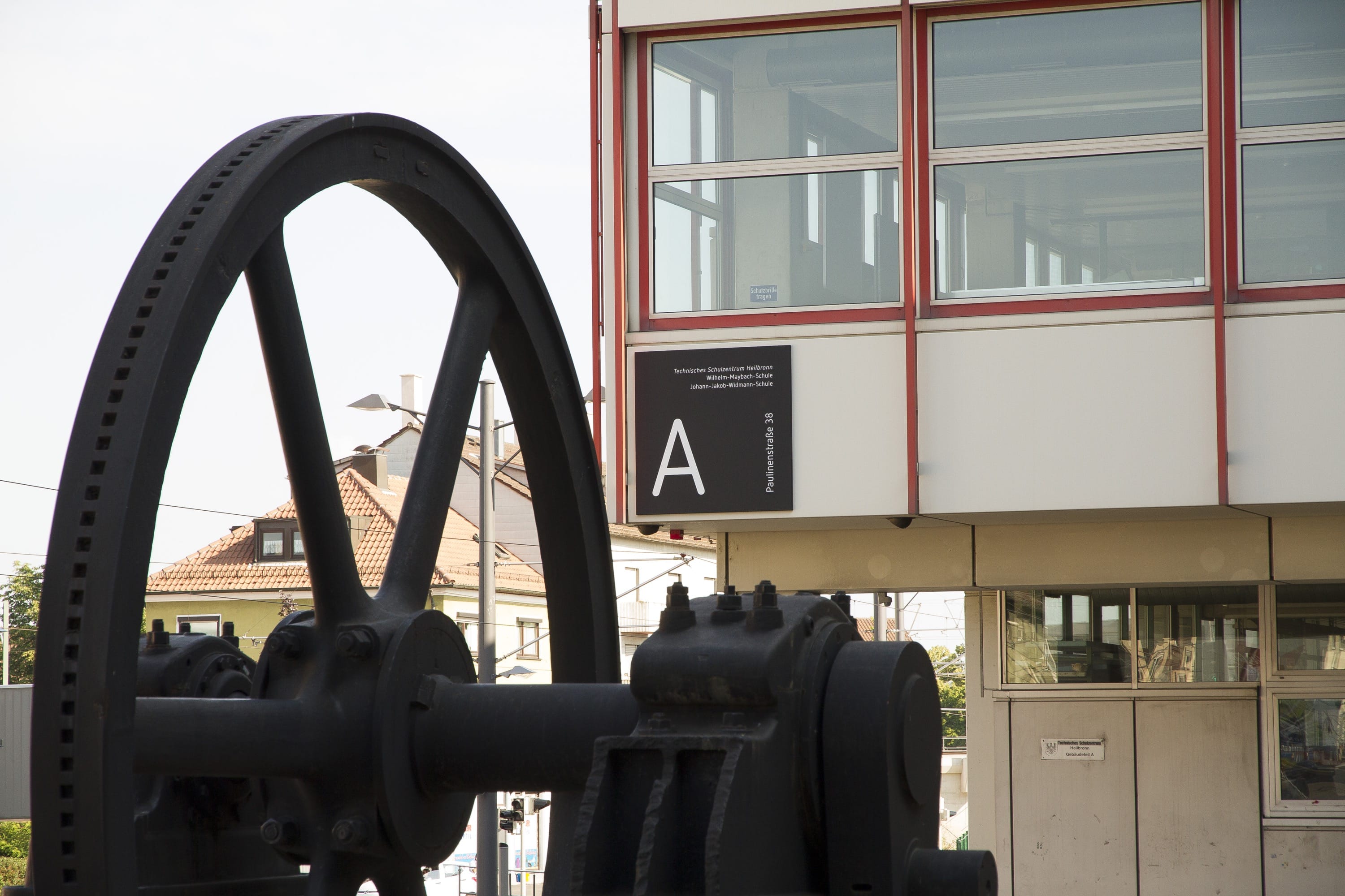 Alt und neu: Das historische Schwungrad ist das Wahrzeichen des Technischen Schulzentrums Heilbronn. Die Gebäudekennzeichnung Im Außenbereich ist sicherheitstechnisch relevant. In enger Zusammenarbeit mit dem Hochbauamt Heilbronn und den Schulleitungen wurden einheitliche Standards für die inhomogene Bestandsstruktur mit ihren ganz unterschiedlichen Gebäudestilen entwickelt.
