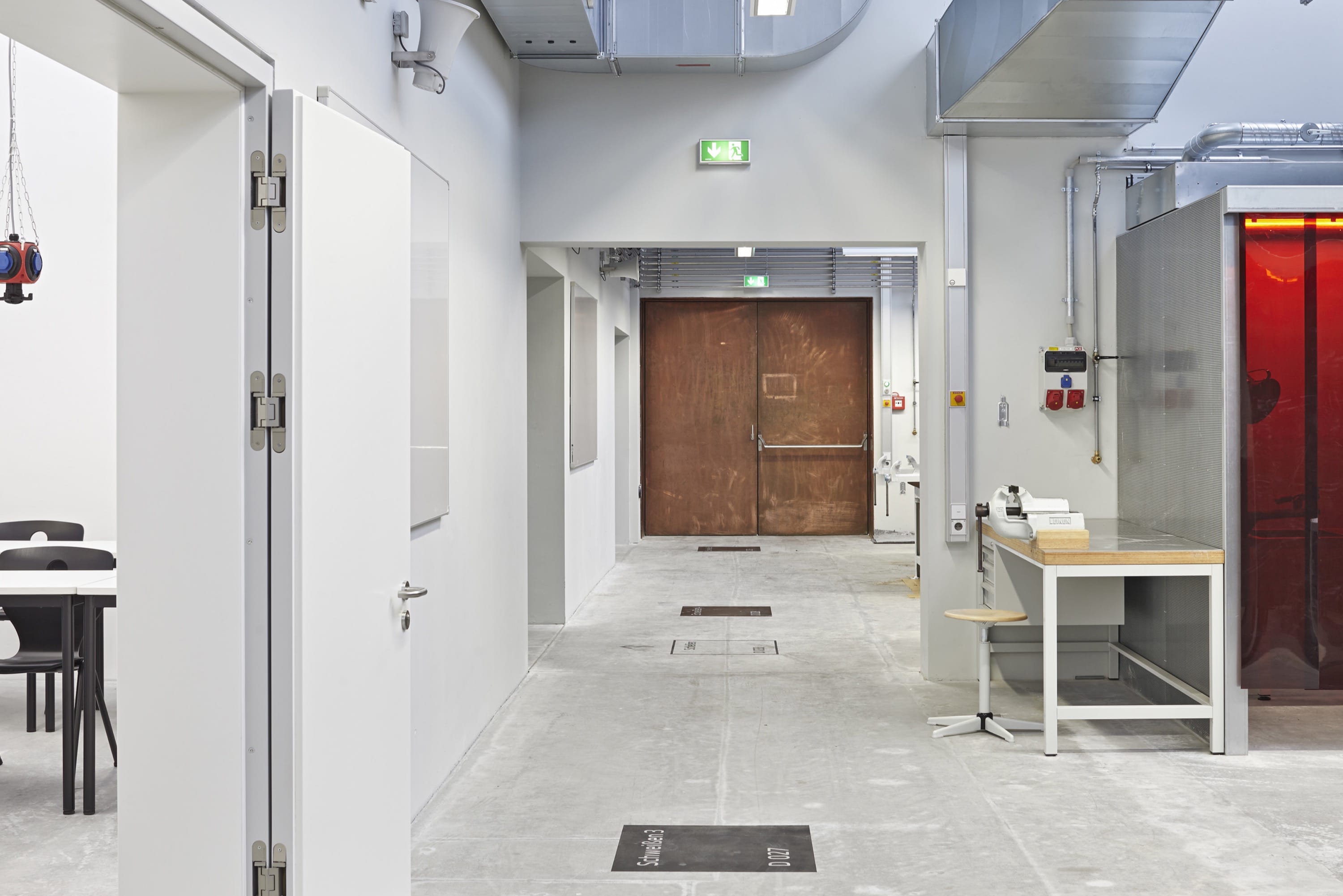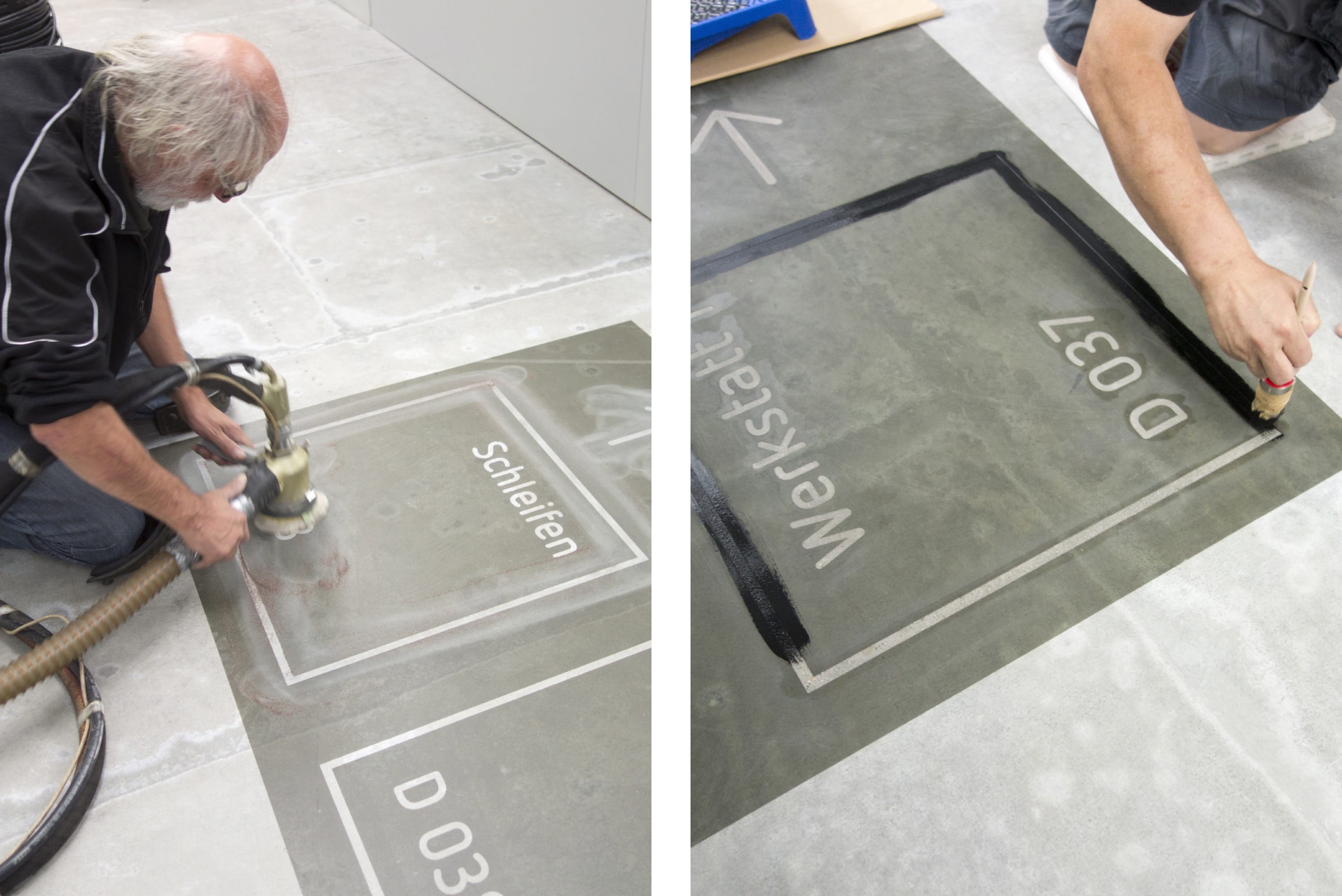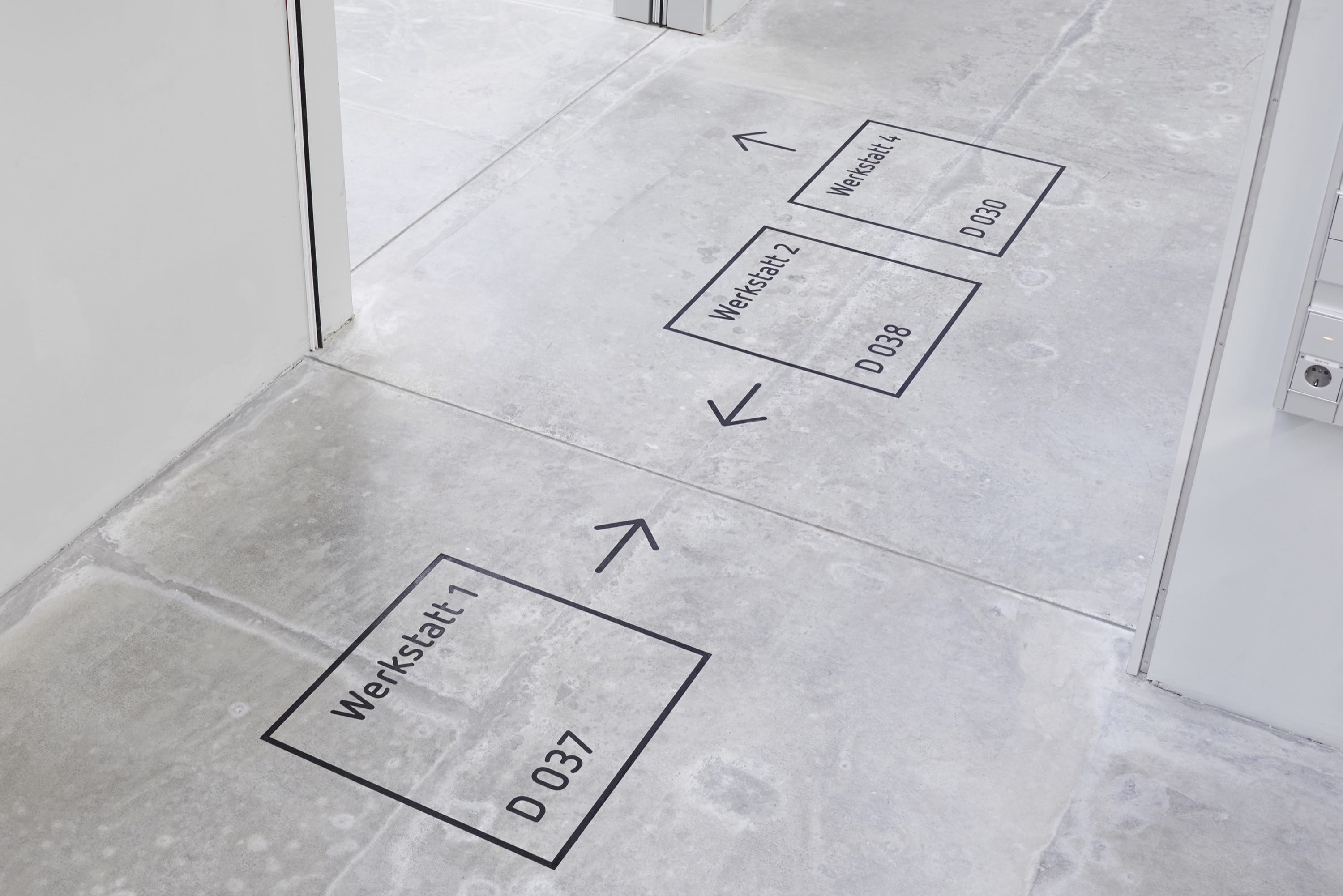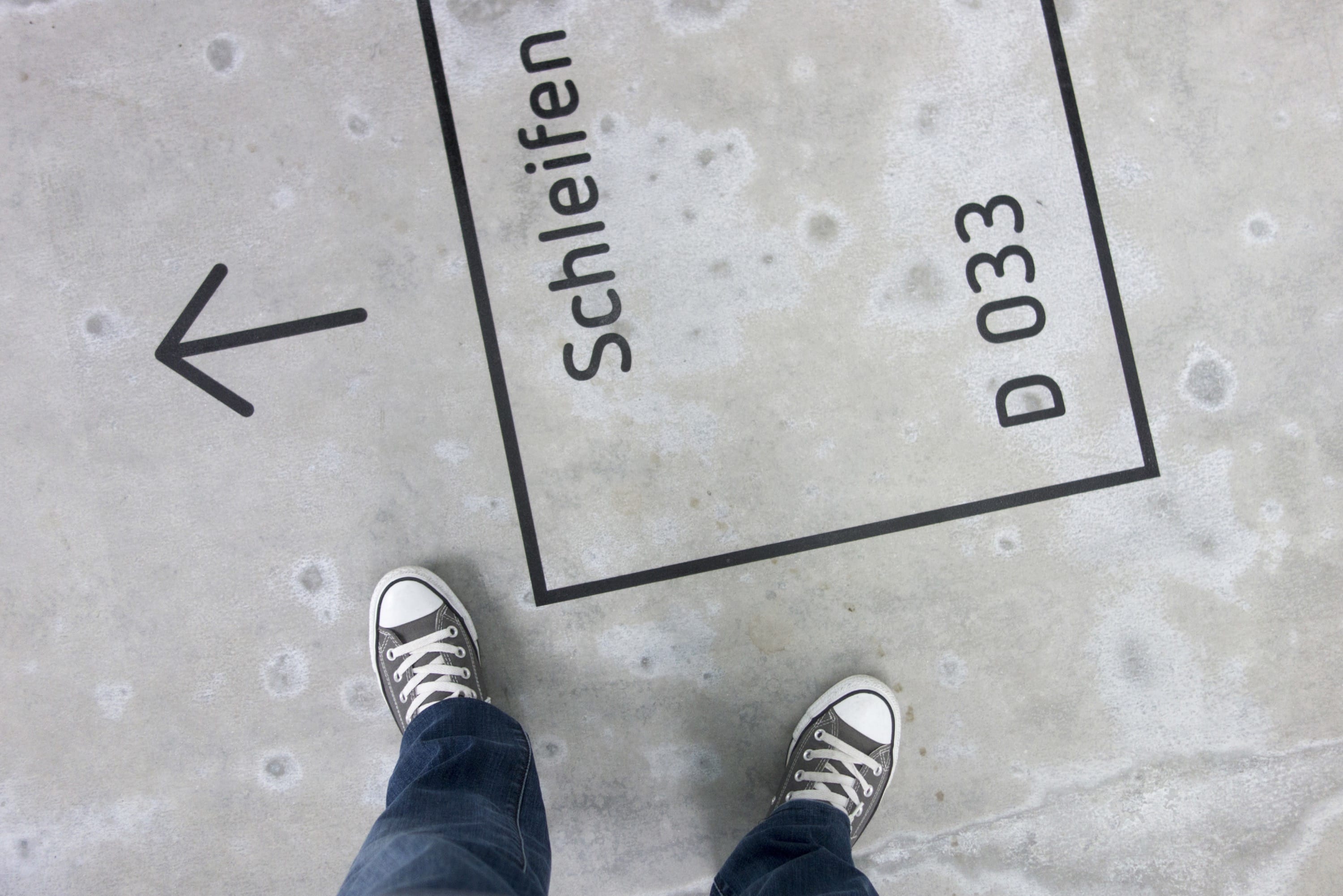 Arbeit im Innenbereich, Bau „D“: Eine besondere Herausforderung stellten die Werkstatträume dar. In einigen Bereichen schied die Anbringung der Orientierungselemente an den Wänden aus praktischen Gründen aus — so entschieden sich die Gestalter, auf den Boden auszuweichen. Zum Einsatz kam eine kombinierte Sandstrahltechnik. Das Ergebnis lässt sich sehen — und dauerhaft begehen.